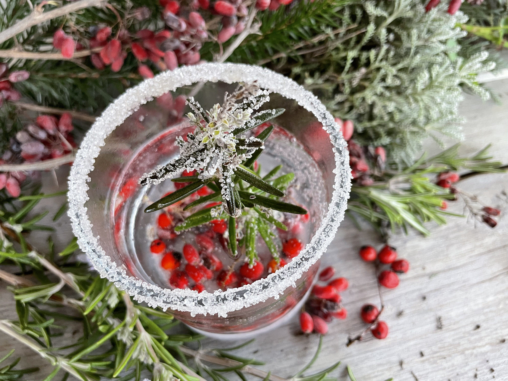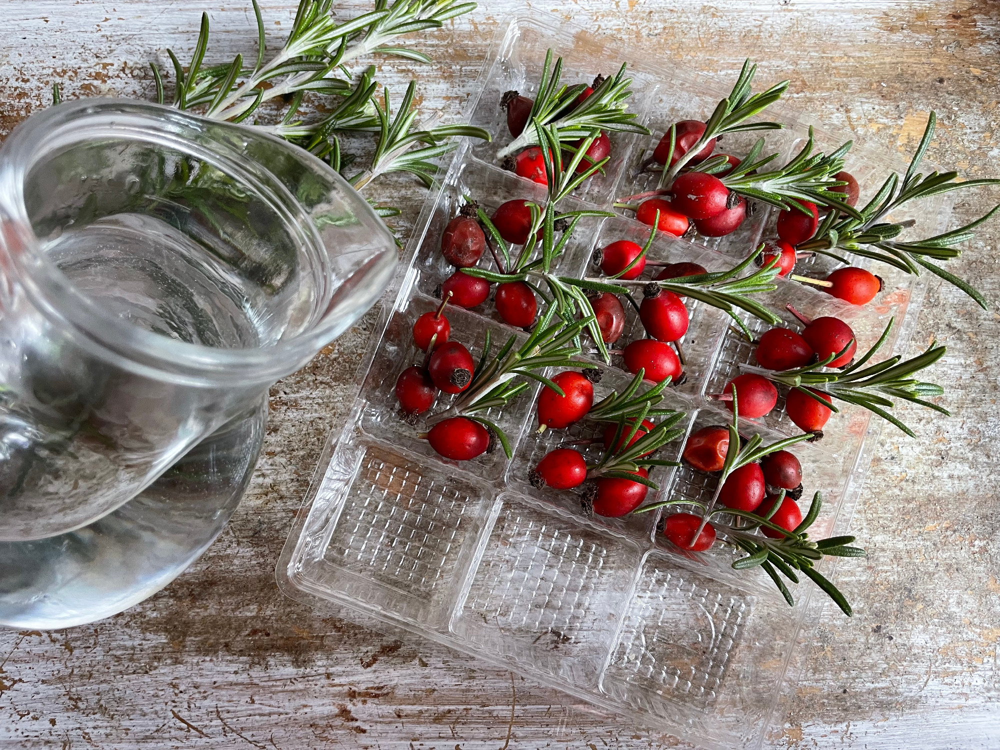 Készíthetünk jópofa rozmaringos jégkockákat! Igazi karácsonyi hangulatot teremtenek a piros-zöld színkombinációk, ezért tegyünk bele csipkebogyót, galagonyát vagy bármilyen bogyós gyümölcs a fagyasztóból. Ha nincs jókora jégkockatartónk, akkor szilikon bonbonformába, vagy a desszertes doboz belső rekeszei is jó szolgálatot tesznek. Szépen rendezzük el az alapanyagokat a jégkockatartóban, öntsük fel vízzel vagy gyümölcslével, és mehet is a fagyasztóba legalább fél napra. A rozmaringot állítsuk bele, hogy amikor a pohárba helyezzük a mutatós jégkockát, a fagyos zöld ág úgy ágaskodjon a pohárban, mint egy igazi, ünnepi havas fenyőfa.