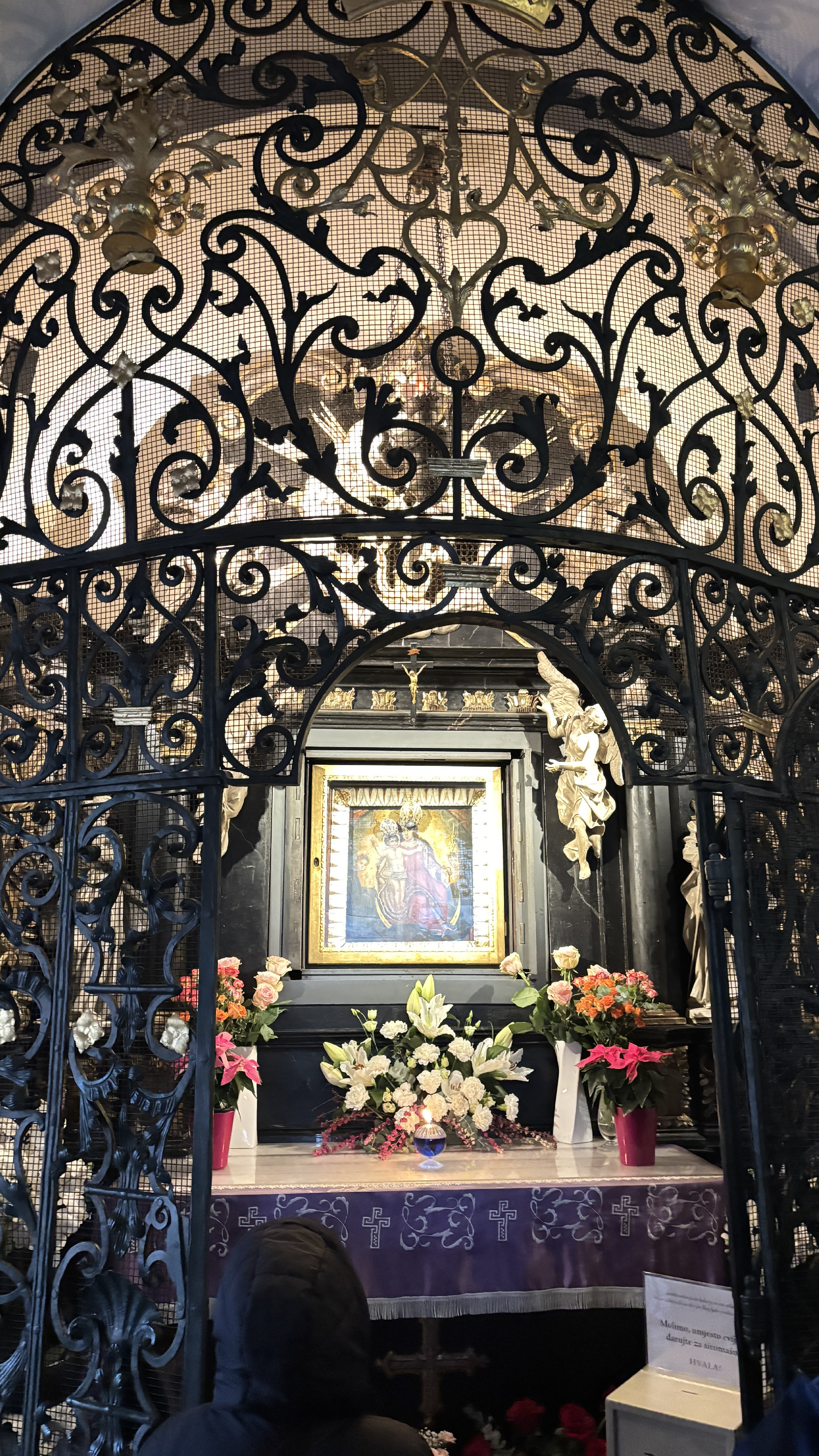 A kőkapu, amin keresztül a felsővárosba jutunk a 13. században épült a városba vezető négy főkapu egyikeként, és az egyetlen máig megmaradt kapu. Van benne egy pici szentély, egy festménnyel, amely csodával határos módon túlélt egy 17. századi tűzvészt. A Szűzanya és a kis Jézus képét ma egy kovácsoltvas kerítés védi, és a helyiek egyik legfontosabb zarándokhelye lett. Nagyon megható volt látni, ahogy az árkádok alatt imádkoznak az emberek, a félhomályban pedig a gyertyák fénye számtalan köszönetet mondó kőlapocskát világít meg.