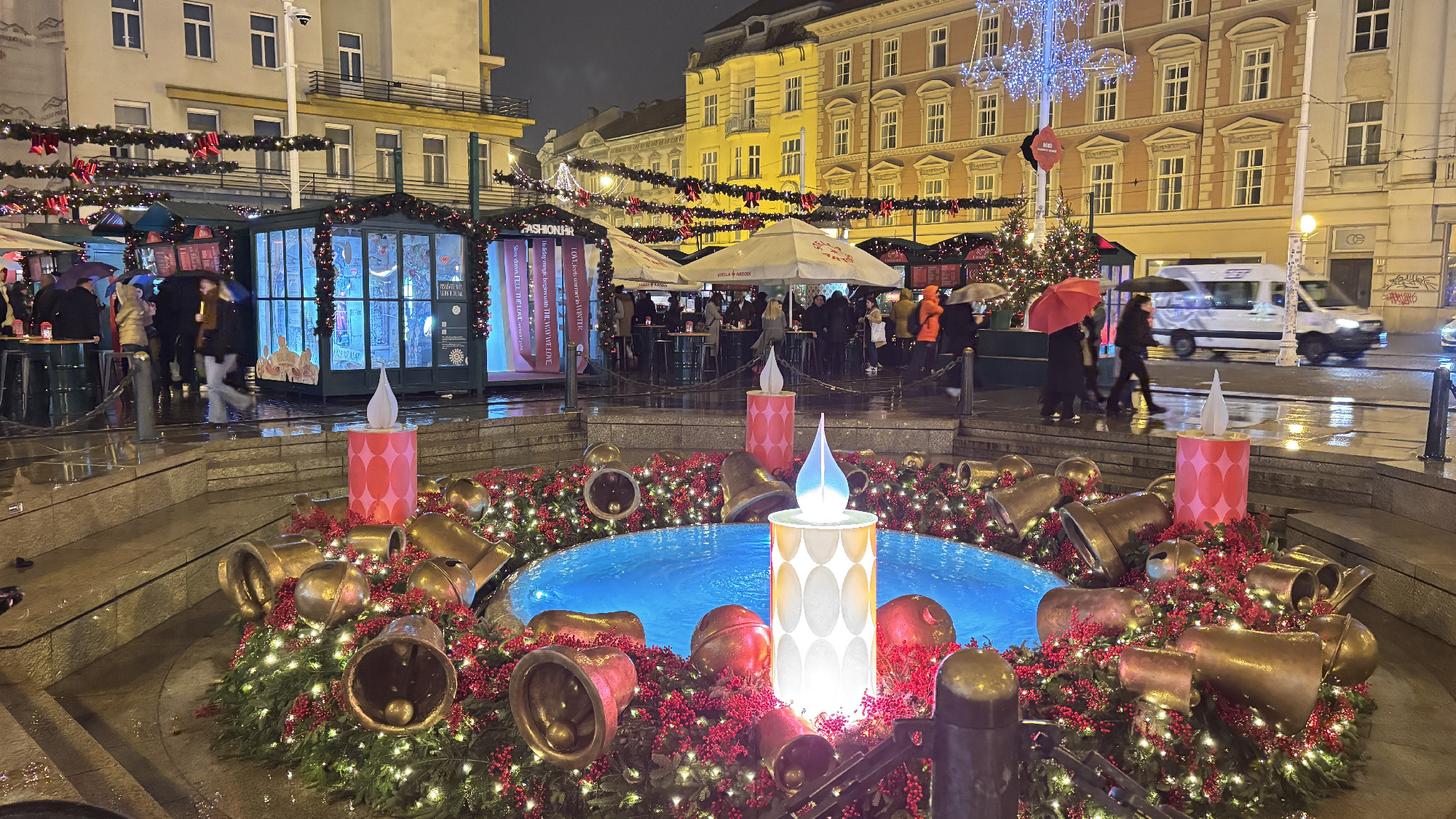 A Felsővárosból a fényfüzérekkel tarkított keskeny lépcsőkön lesétálva pillanatok alatt a Jelasics térre érkezünk, ahol a zágrábi advent egyik jelképe, a feldíszített szökőkút és a város karácsonyfája található.
