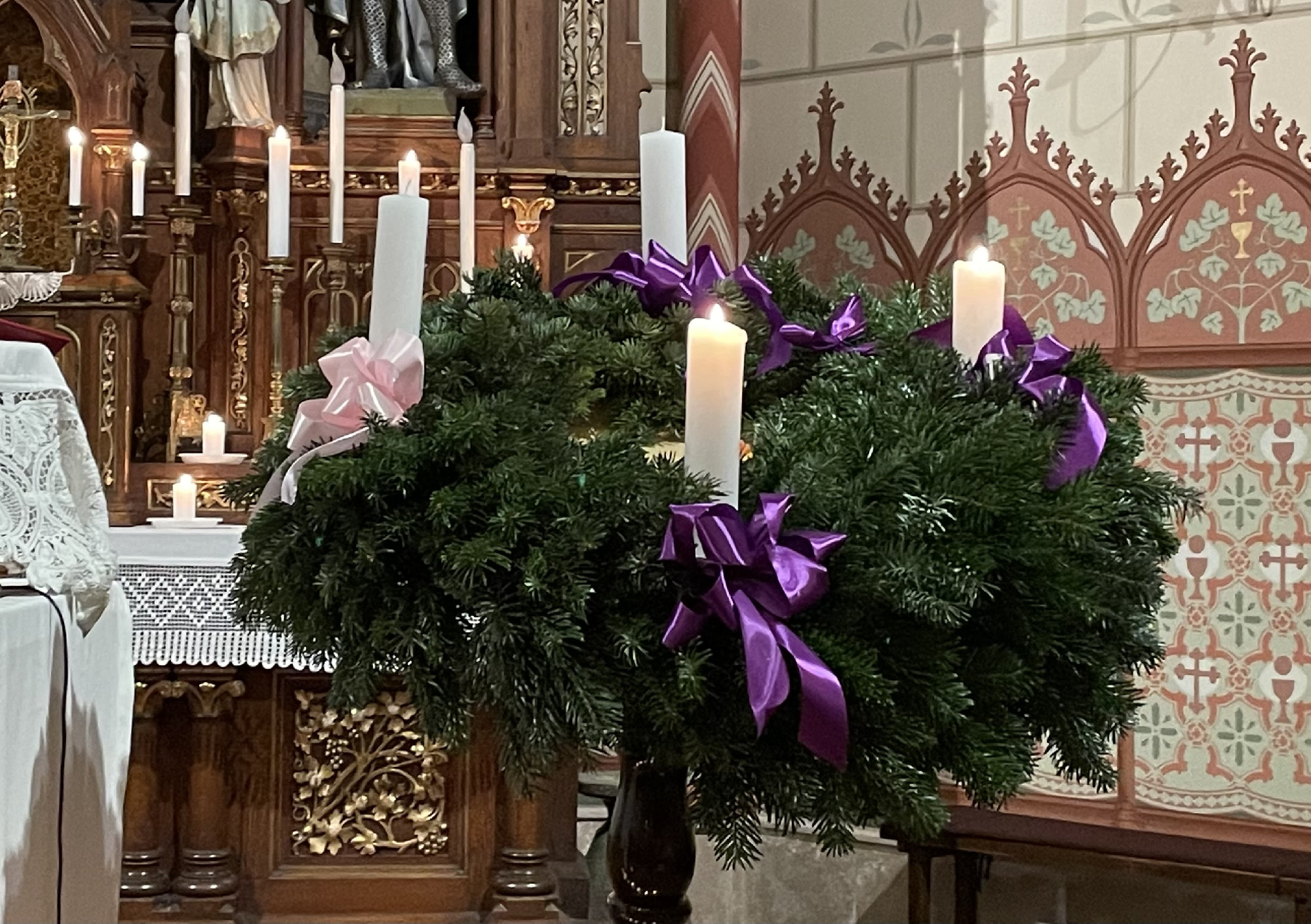 Az adventi koszorú szintén fontos eleme a szent várakozásnak: fenyővel vagy örökzöld ágakkal borított kör alakja az örökkévalóságot jelképezi, a négy adventi vasárnapot szimbolizáló négy gyertyája pedig a karácsony közeledő fényét; eredete részben keresztény, részben a téli napfordulót ünneplő ősi tűz- és fényvarázslásokra vezethető vissza. Gyertyáinak domináns színe a lila, egyik (szám szerint a harmadik) pedig rózsaszín, melyek időrendi sorrendben a hitet, a reményt, az örömet és a szeretetet hivatottak jelképezni.