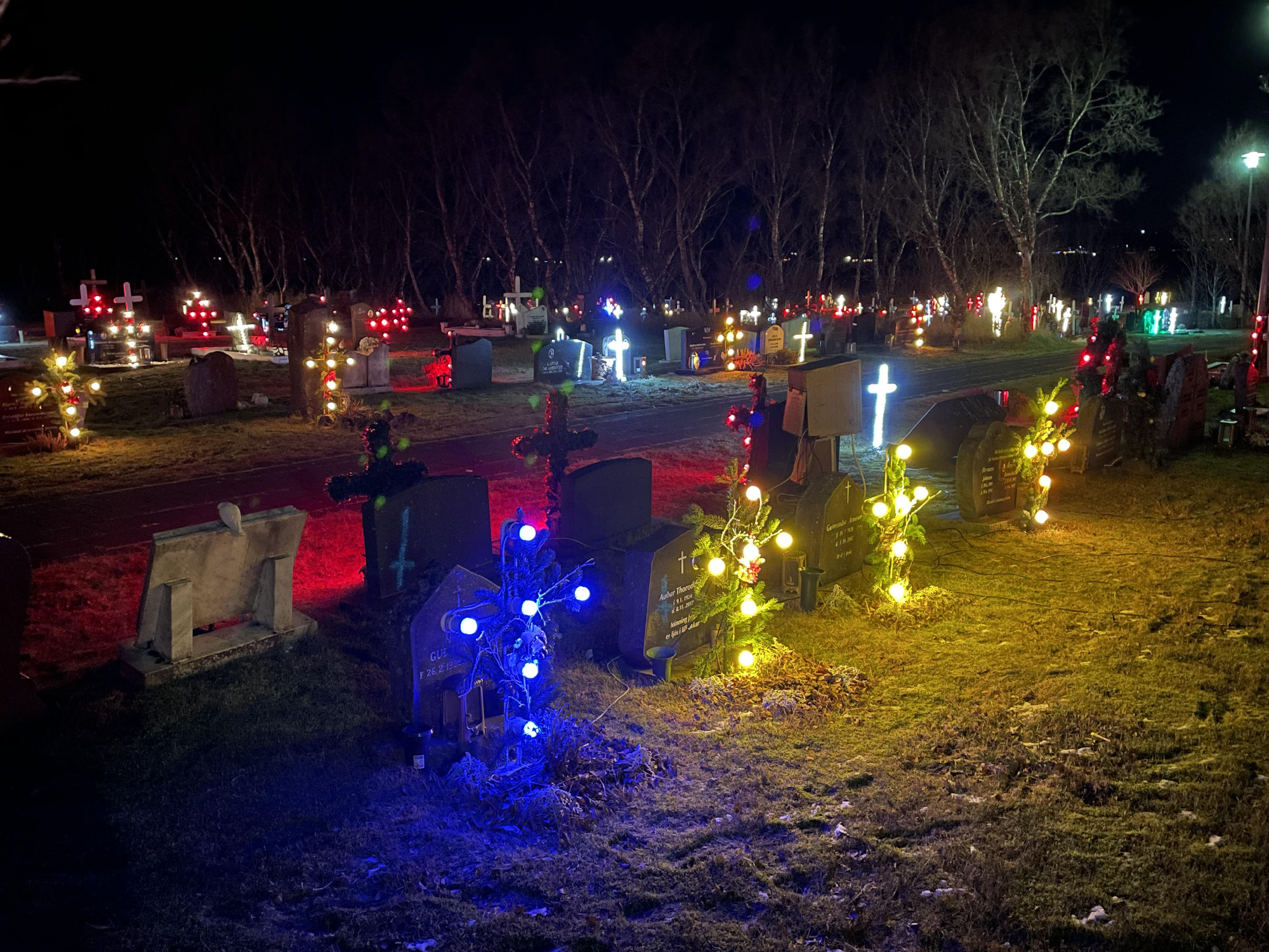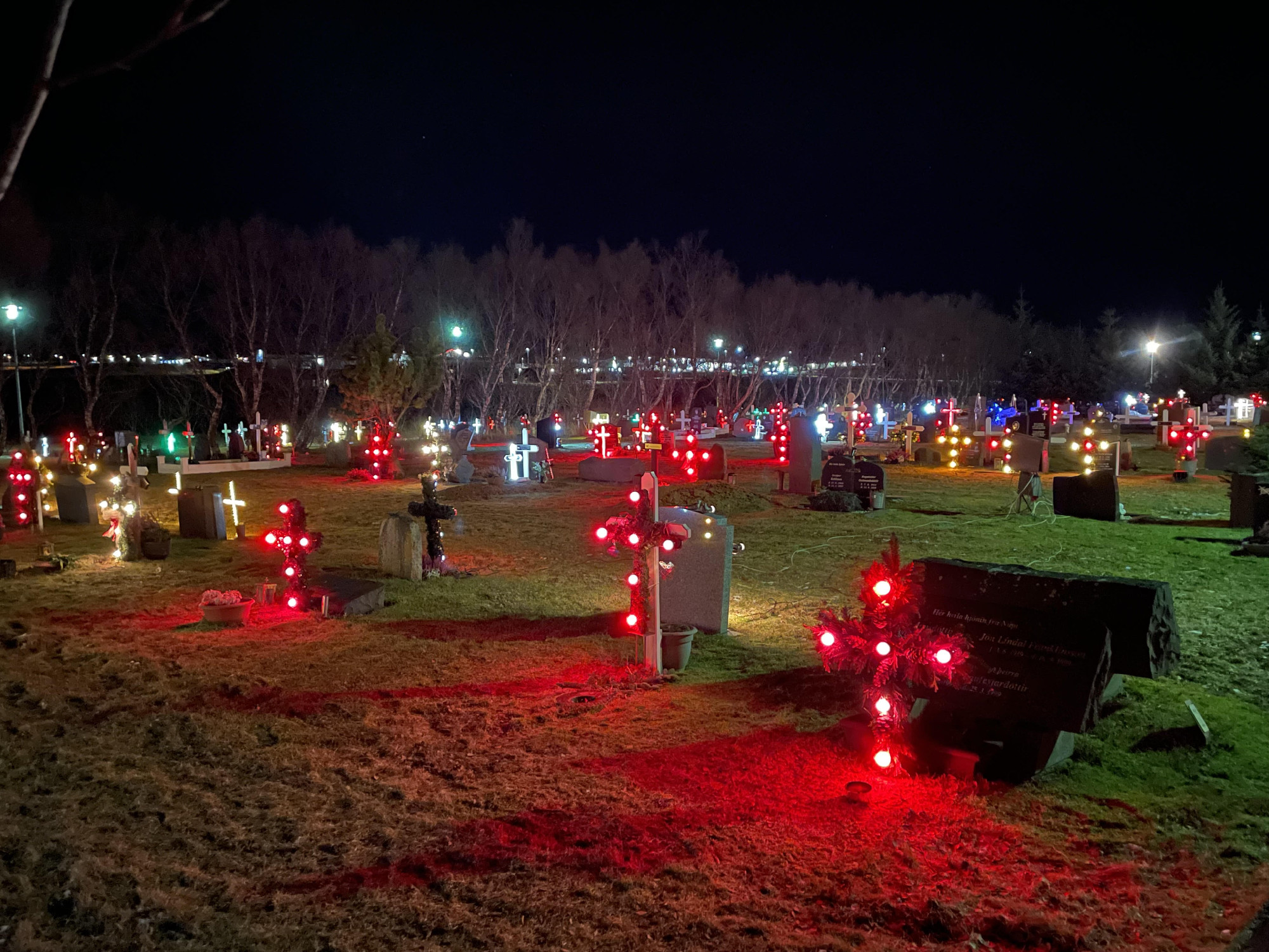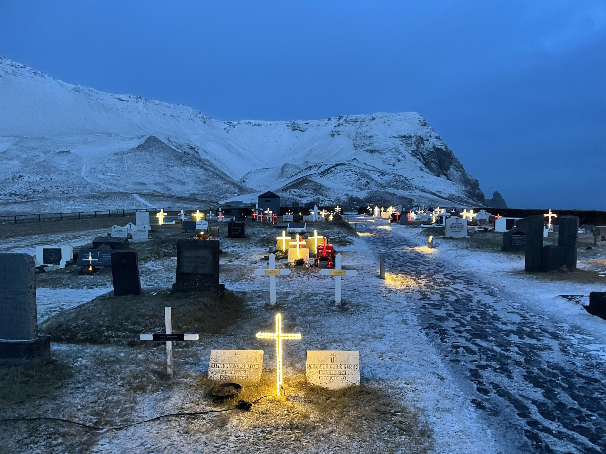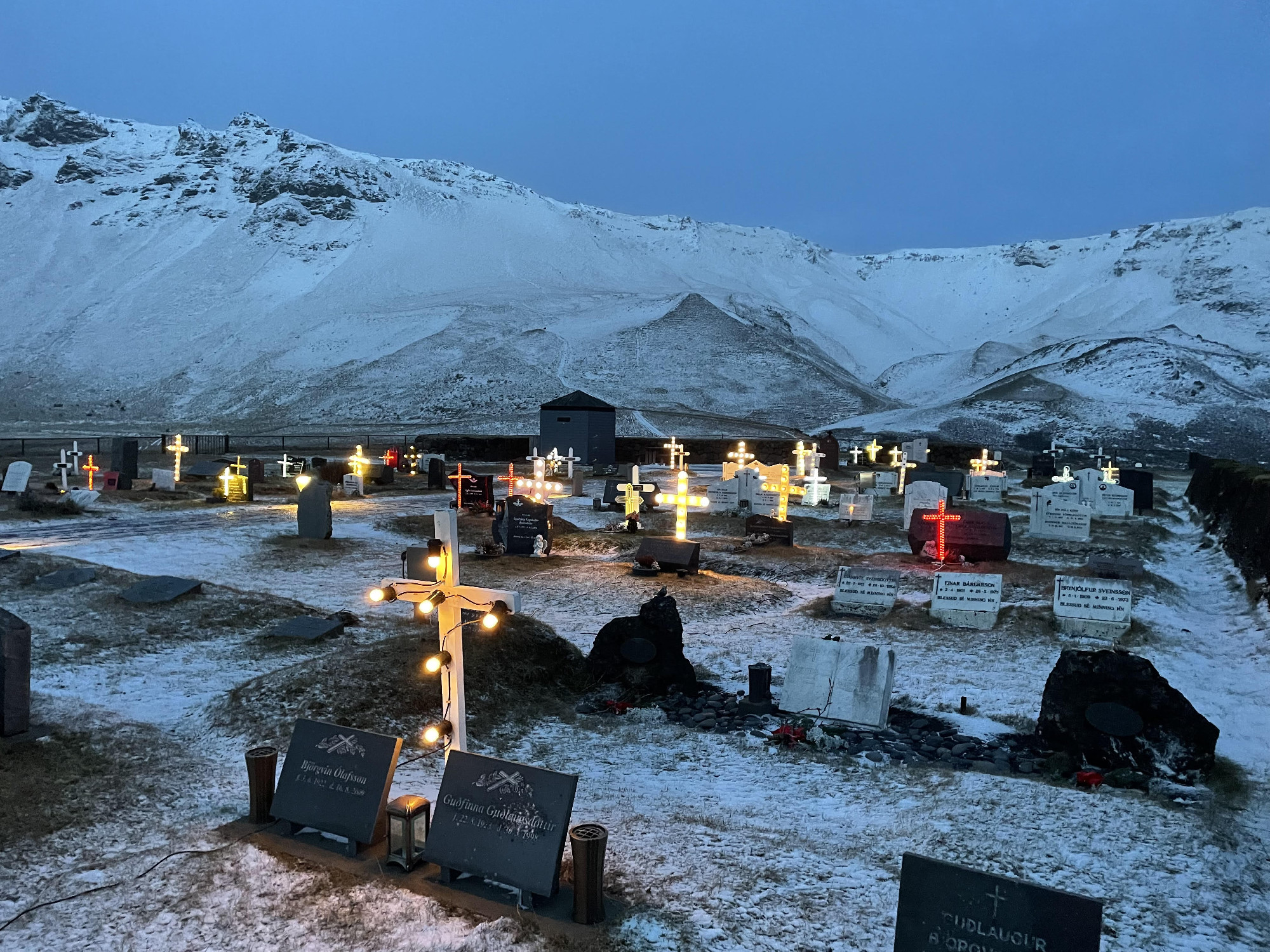Izland lutheránus ország, ezért itt nem ünneplik a mindenszenteket úgy, mint Magyarországon: nincs november eleji gyertyagyújtás, közös temetőlátogatás. Itt a megemlékezés ideje decemberre esik. A sírok egész hónapban - sőt, igazából egész télen - kivilágítva állnak. A hosszú sötétség hónapjaiban a fény a szeretet, az emlékezés és a remény jelképe, és az advent időszakában mindenki gondoskodik róla, hogy szerette sírja fényben álljon. Ez a hagyomány annyira erős, hogy sok temetőben szolgáltatásként is igényelhető a sírok kivilágítása: ha valaki nem tud kijárni, a temető gondnoksága elintézi az elektromos mécsest vagy a fénydekorációt. Nekünk is nyugszik szerettünk itt, és először nem tudtunk erről a szokásról. Amikor egy december 24-i napon kimentünk gyertyát gyújtani, gyászos szívvel – egészen megható látvány fogadott minket. Bár a sírok egész hónapban ki vannak világítva, szenteste napján a családok még nagy, kültéri mécseseket, lámpásokat is elhelyeznek a sírokon. Olyan tömeg és fényáradat van ilyenkor a temetőkben, mint Magyarországon mindenszentekkor. Ez az izlandiak halottak napi megemlékezése – csak itt a karácsony ünnepéhez kapcsolódik. A szenteste része a temetők felkeresése, és a gyertyagyújtás: ez az egyik legmeghittebb, legszebb helyi hagyomány szerintünk.