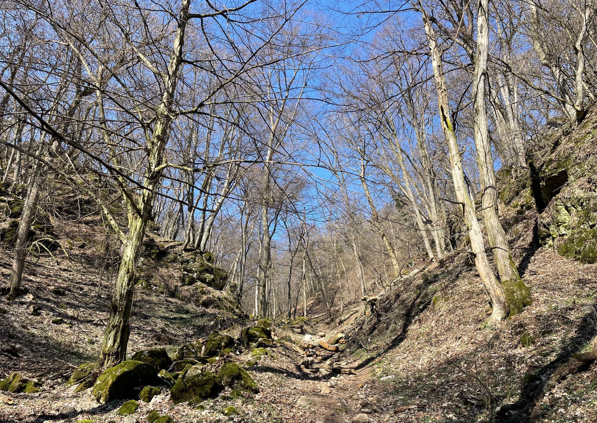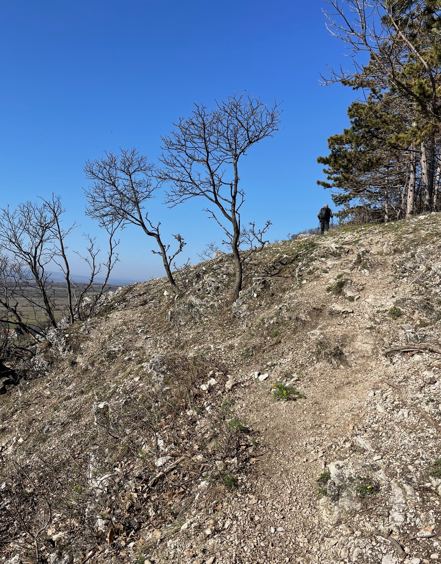 A panorámaút a hegyoldal szélén kanyarog, az ágak közt messze ellátni, a távolban idekacsintanak a Bakonyalja szirtjei. Jó, ha a lábunk elé nézünk, mert az ösvény változatos, ám keskeny. Látványban azonban nincs hiány! Most, hogy még csak duzzadó rügyeket ringatnak a fák, jól látszik, ezen a déli oldalon milyen sűrű a növényzet, milyen furcsán girbe-gurbák a fatörzsek.
