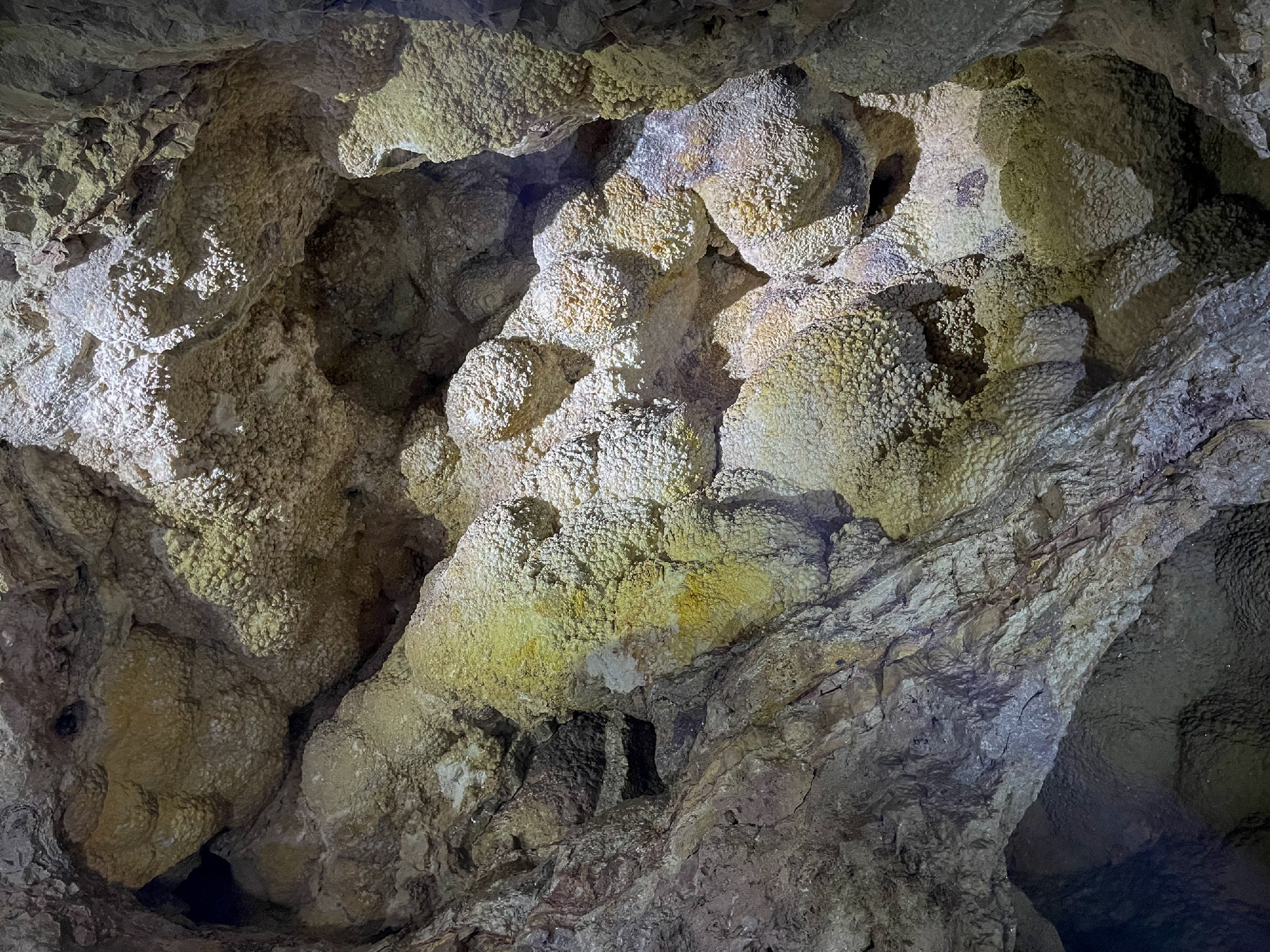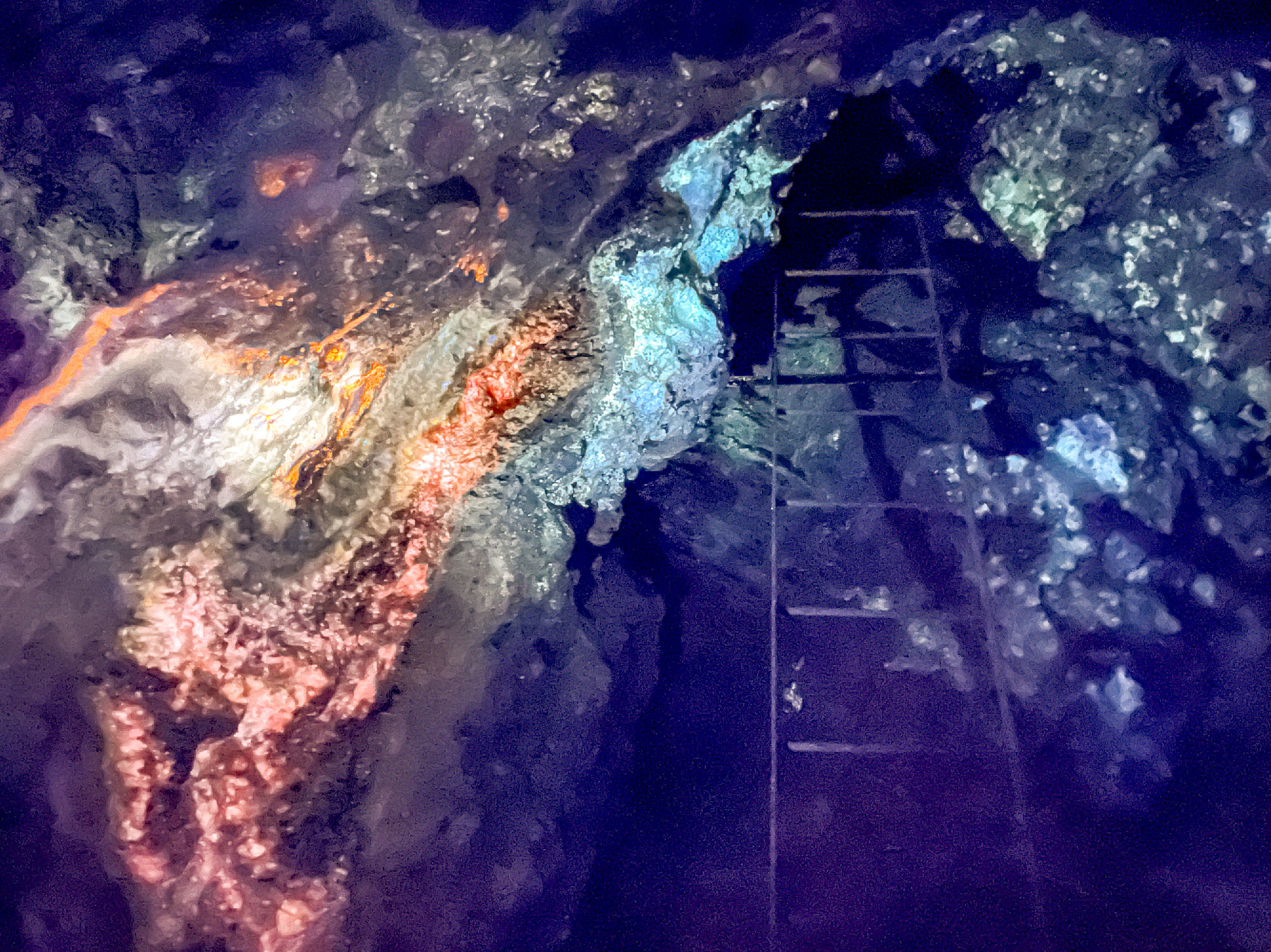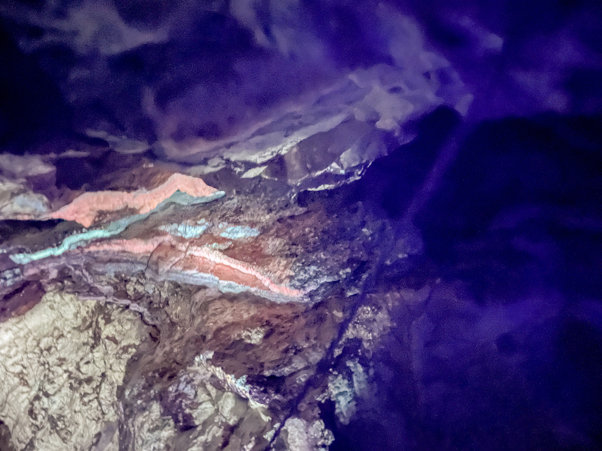 Amikor viszont nyitott szemmel, lámpáinkkal pásztáztuk a bányajárat falát, különlegesen szép geológiai képződmények színes világa tárult fel. Láttunk borsóköveket, karfiol-szerű aragonitot, fehér kalcedont, a „bolondok aranyának” nevezett, aranyhoz hasonlóan ragyogó piritet. A túravezető UV-lámpája pedig egy ennél is színesebb és valószínűtlenül vibráló világot tárt fel előttünk, olybá tűnt, mintha egy szuper távcsővel tekintettünk volna messzi galaxisokba.