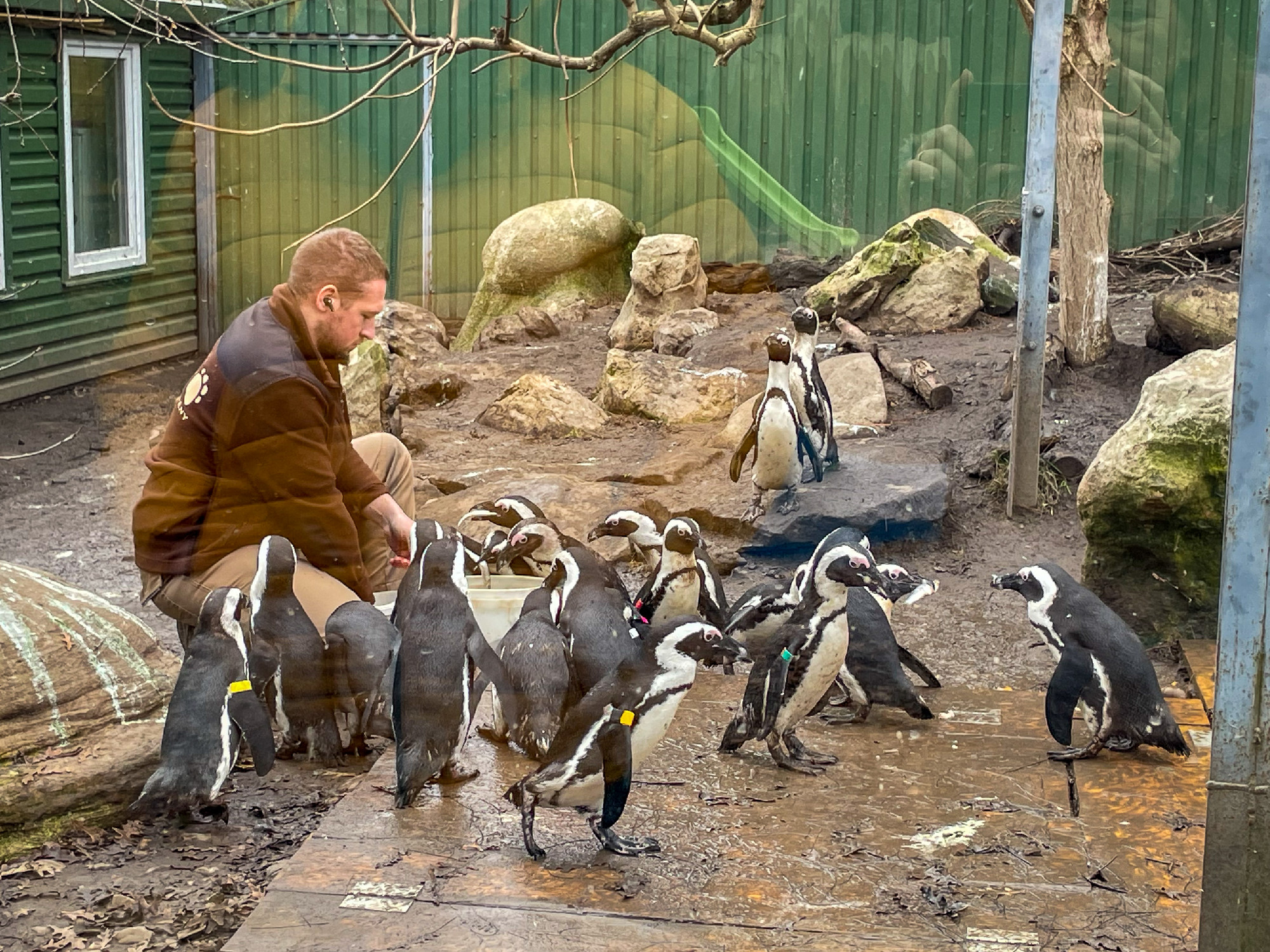 A legnépszerűbb program a téli időszakban a mindennapos pingvinséta, ami a már totyogós gyerekek számára is érdekes és izgalmas, hiszen karnyújtásnyira tipeghetnek együtt a pingvinekkel, körbe az állatkert területén. A pápaszemes pingvinek számára nem idegen ez a séta, hiszen természetes élőhelyükön, a dél-afrikai partokon is kisebb-nagyobb távolságokat kell megtenniük a tenger és a fészkelőhely között. A pingvinek hozzászoktak a látogatókhoz, láthatóan élvezik a közönséget, olykor kibogoznak egy-egy cipőfűzőt, ha a gazdája hagyja, vagy éppen a fészekhez gyűjtögetnek alapanyagot, miközben a gondozójuk irányítgatja az útvonalat. Minket két pár, Hablaty és Vilmos, valamint Lajos és Polka kísértek, valamint Undika, aki körünkben sem volt hűtlen nevéhez, minduntalan megpróbált elcsavarogni, és az érdeklődőknek hátat fordítani. Ez a program kifejezetten csak a téli időszakban lehetséges, mert márciustól novemberig a pingvinek rovarhálóval fedett kifutóban élik mindennapjaikat, a szúnyogoktól védve.