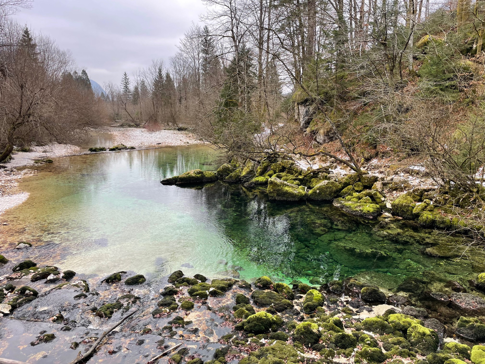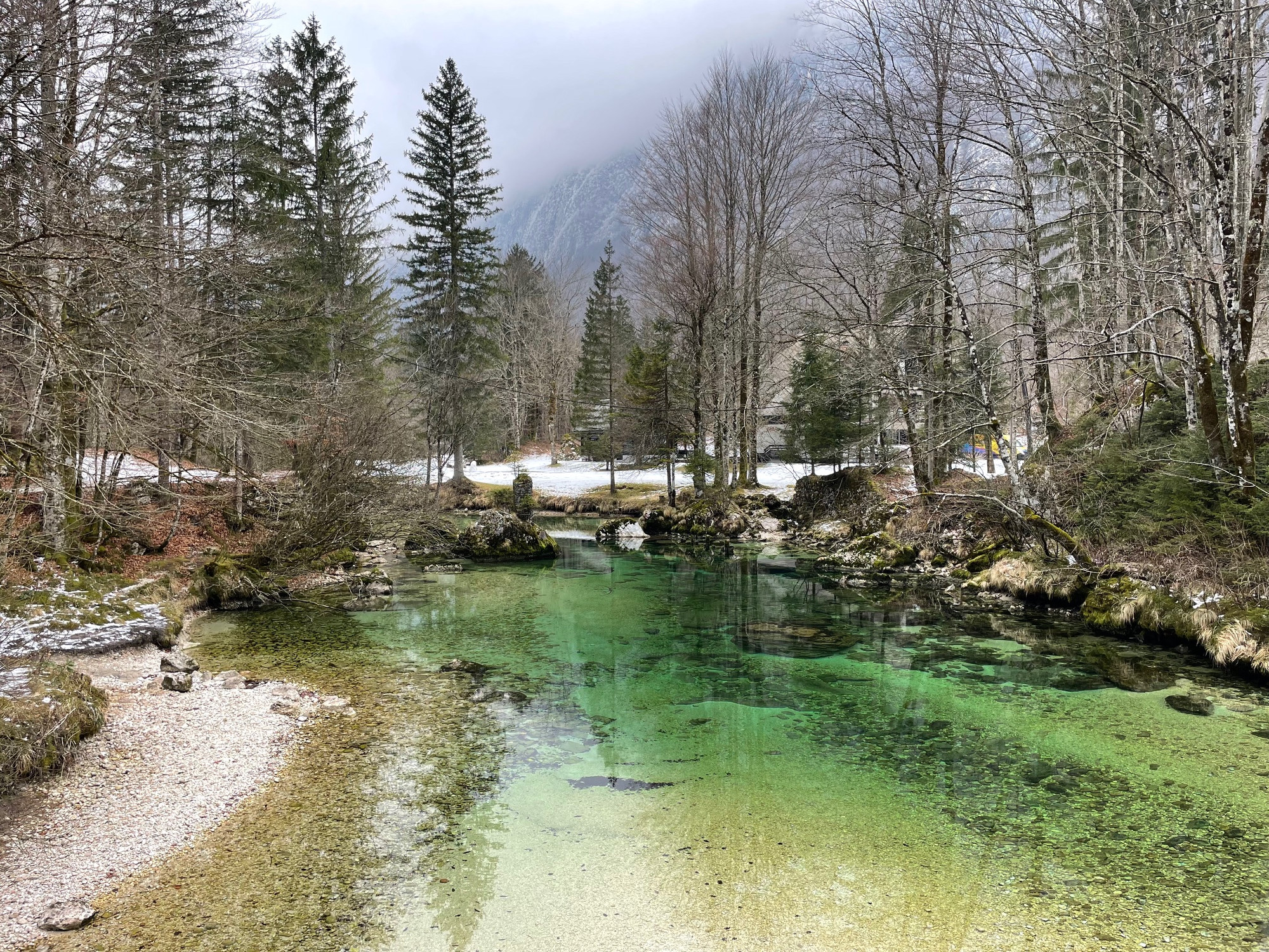 A Bohinj-tó távolabbi végétől indultunk a nevezetes vízesés felé. Könnyed túrának indul, hiszen itt már a folyó leért a völgybe, megszelídülve zöldellik a hófehér kövek közt, üdítő és megnyugtató látványként. A hegyek öle percről percre szűkül, körbenézve szinte függőleges sziklafalak közt kanyarog. A Júliai Alpok jellegzetességei hegyormokról induló mély és meredek völgyek, amelyeket a jég vájt ki sok év alatt.