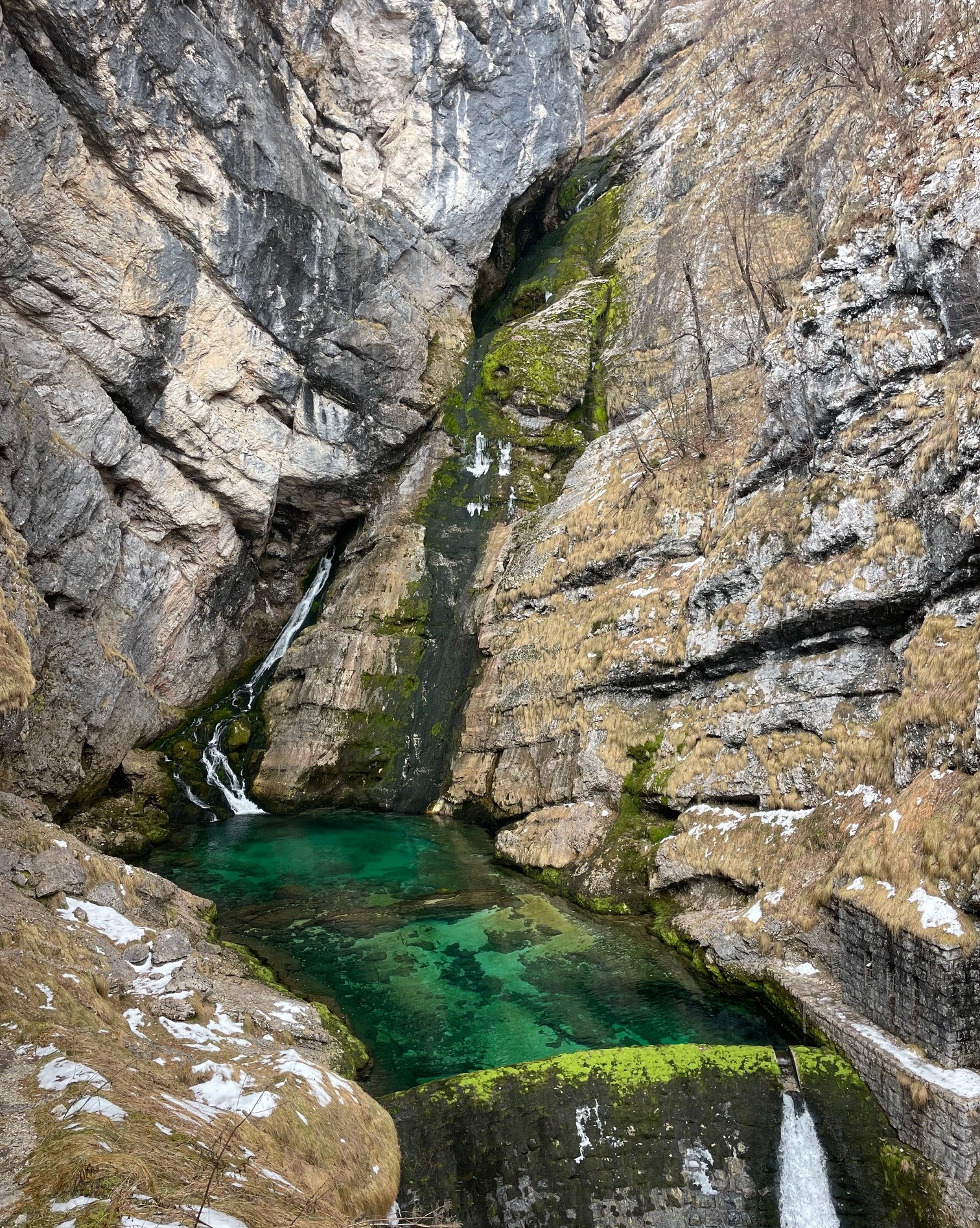 Ha felmászunk a Savica-vízeséshez az 1971-ben készített, 580 lépcsővel megtűzdelt úton, akkor magunk is megcsodálhatjuk a jég alkotta felszín különlegességét. Ide már nem könnyű a feljutás, bő félóra lépcsőzéssel juthatunk fel a tetejére. Nem csak szusszanni érdemes megállni, hanem olykor körülnézni is, mert a táj elbűvölő, és közben egyre erősebben hangzik a zubogó víz moraja. Most télidőn nem is volt annyira hangos, mert csak a kisebb vízesést láthattuk. A nagyobbik vízutánpótlása a magasan fekvő tavakban befagyott, így az akkor indul majd meg, ha tavasszal az idő enged a szorításából. Nagyobb esőzések idején sok kis vízesés indul meg a hegytetőről, akár 600 méternyi vízzuhatagot is élvezhetünk olyankor, de így, egymagában is fenséges látványt nyújtott!