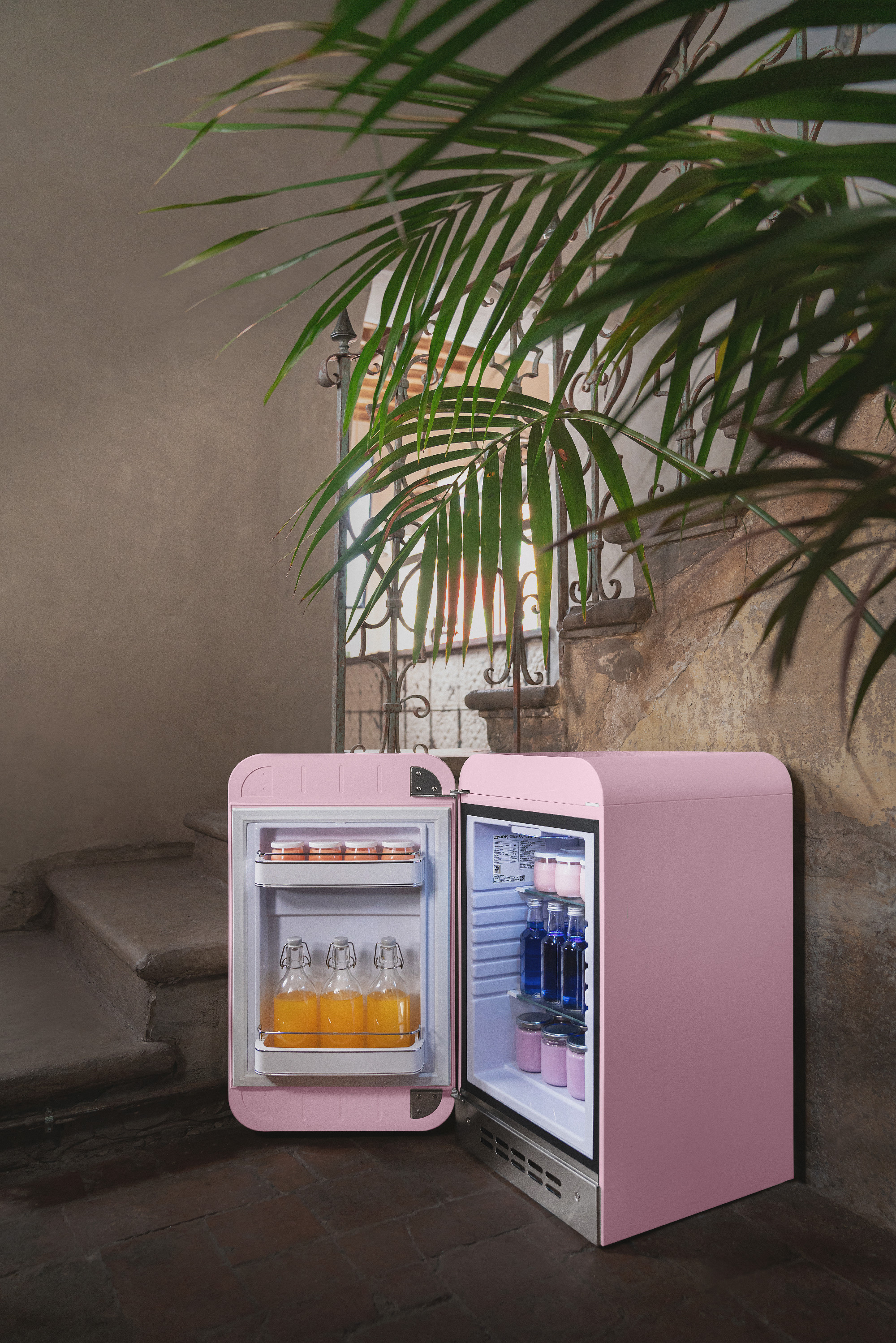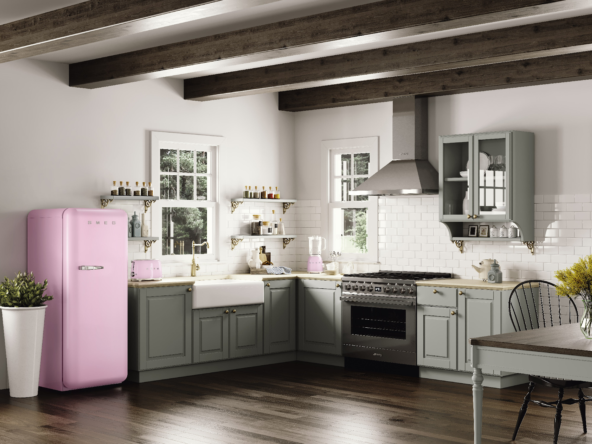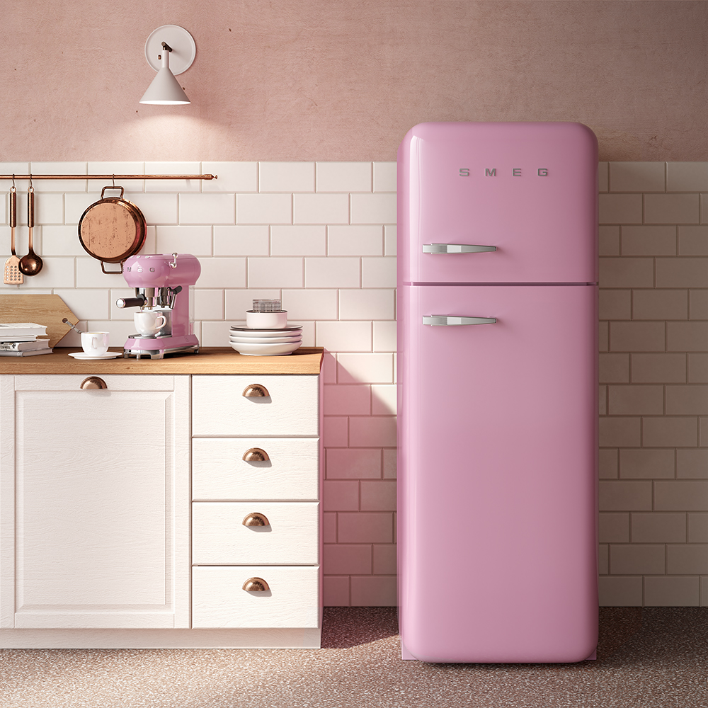 Ebben a kontextusban a SMEG, az 1950-es évek formavilágát idéző készülékeivel a rózsaszínt nem díszítőelemnek, hanem karakterformáló színnek használja, erősítve a konyha vizuális identitását.