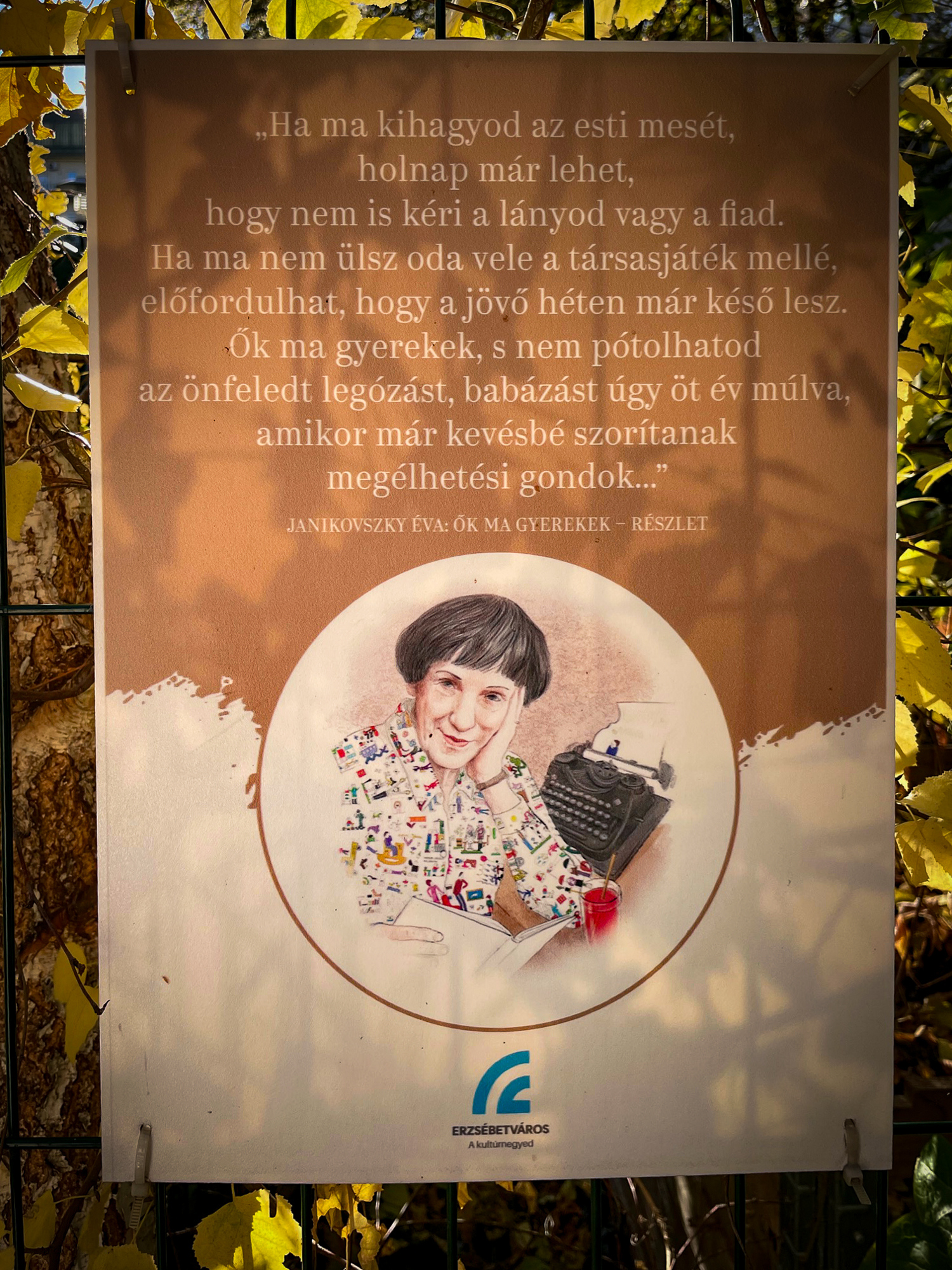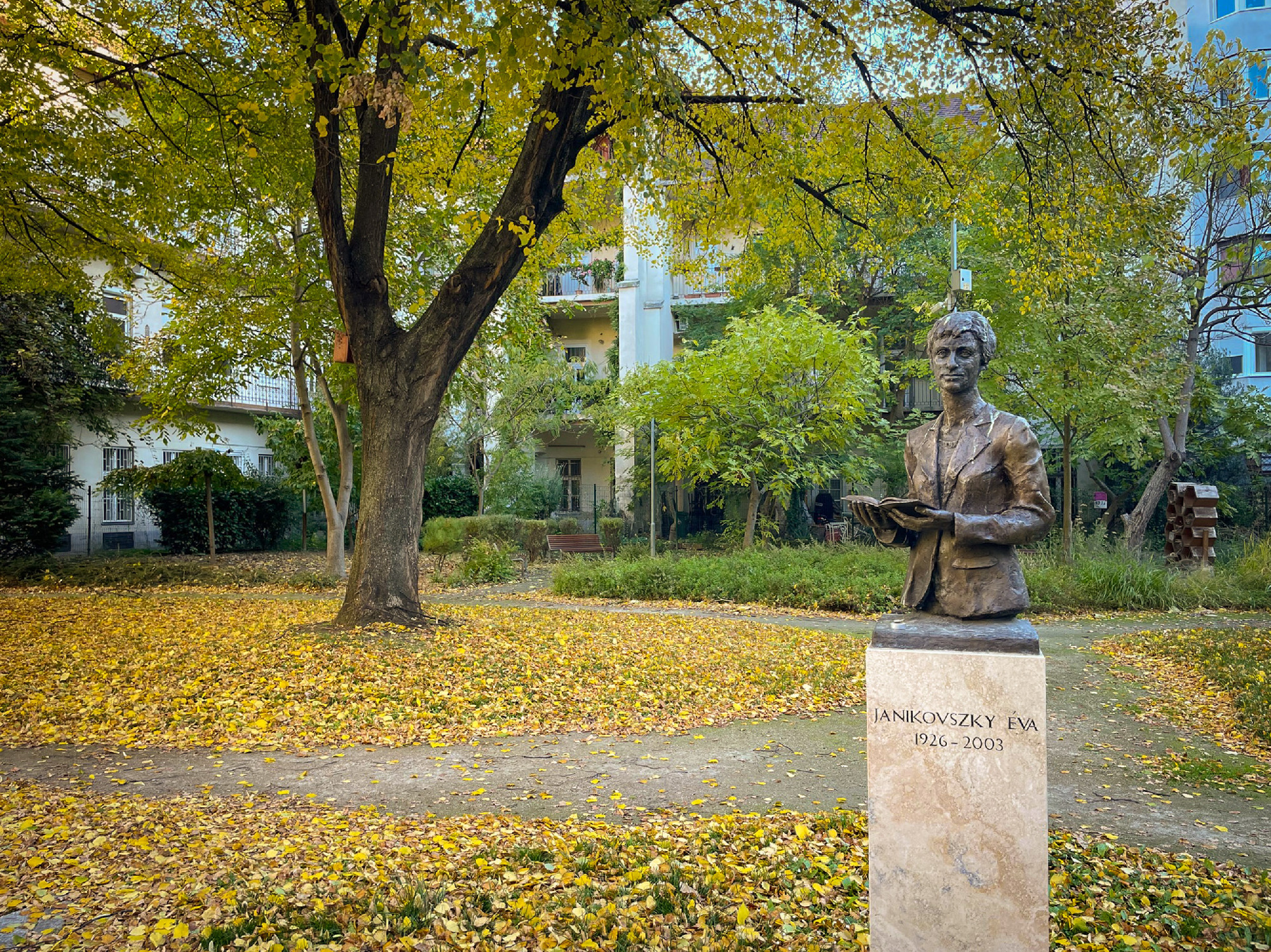 Tavasszal japáncseresznye virágai hajolnak az írónő szobrára, ősszel színes lombruha fedi a kanyargós utakat. Az árnyas részbe jutottak páfrányok, amelyek láthatóan igen jól érzik magukat, a napsütötte foltokba szárazságtűrő évelőket ültettek. Terem itt cseresznye, füge, naspolya - a látogatók örömére. A novemberi napsütésbe belesárgállik az örökzöld orbáncfű, beleragyognak a megkésett rózsák, szépen illegeti magát az illatos barátcserje terméses füzéreivel. Mondhatnánk, hogy „égigérő” díszfüvek bókolnak a szélben, miközben itt-ott idézeteket olvashatunk Janikovszky Éva legismertebb műveiből. Akinek pedig még eddig nem esett le, hogy ki is ő valójában, a tűzfalra nézve megpillanthatja Réber László bájos rajzait. Kettejük munkássága elválaszthatatlan, a „Kire ütött ez a gyerek” talán még ma is ott van minden család könyvespolcán.