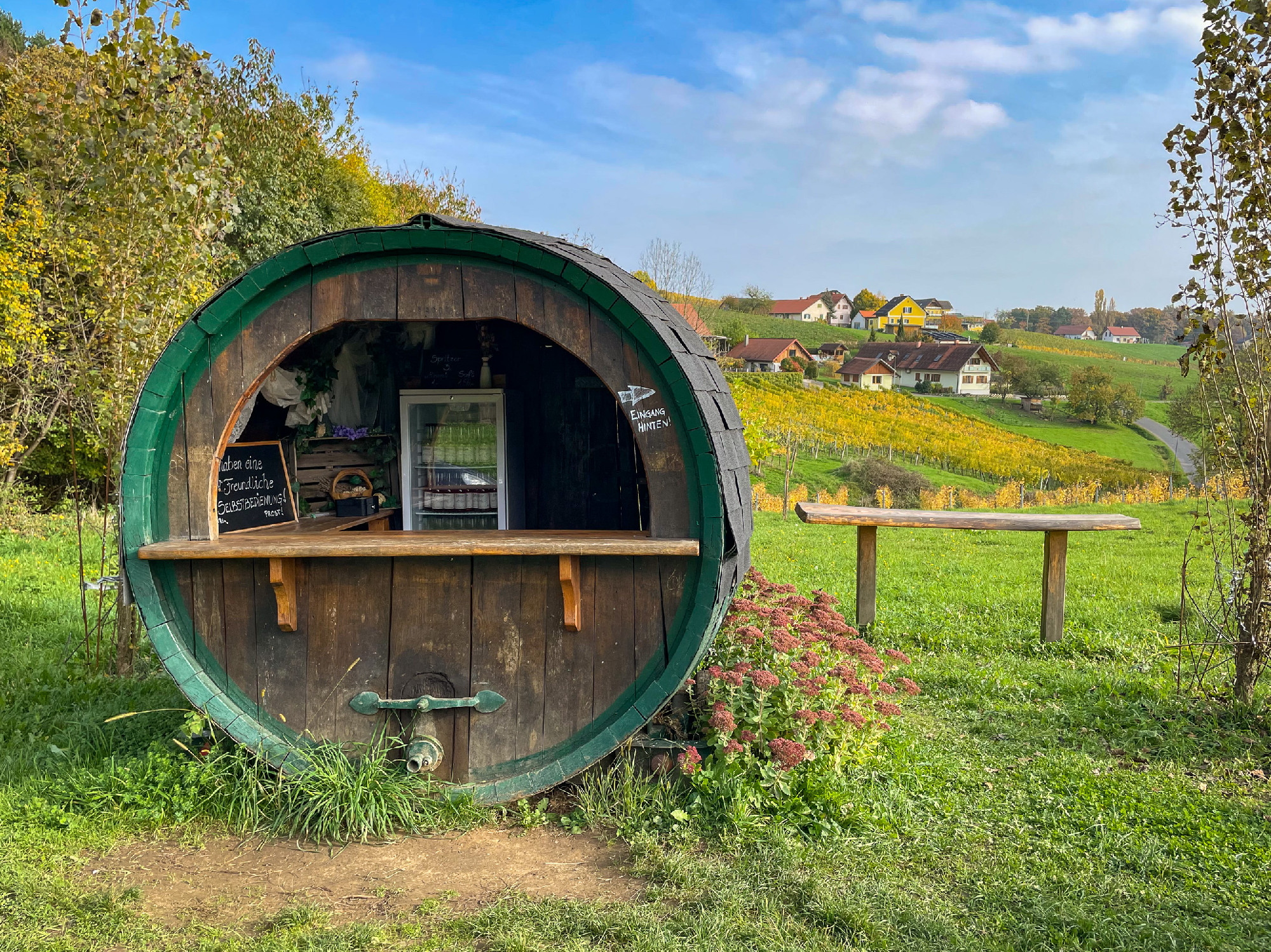 Eszembe jutott a karintiai kis fűszerkert a buszmegállóban, ahol metszőolló is volt kikészítve, és kis táblán bíztató szavak: ha elfogyott otthon a lestyán vagy tárkony, vigyél belőle nyugodtan, amennyi kell! A stájerországi túrán a becsületkasszás büfé, ahol italok széles választékát kínálták a megszomjazott vándoroknak. Volt, ahol csak a jéghideg patakba helyezett ládából vehette ki a szomjazó az italt, és a fára kötött konzervdobozba kellett beletenni az ellenértékét. De akadt olyan is, ahol egy csinos nyitott pince állt rendelkezésre, többféle itallal, hűtővel, poharakkal, hogy mindenki kedvére válogathasson. A Tramini-túraúton jártunk bort és mézet kínáló boroshordóban, és uzsonnáztunk kimustrált tűzoltóautó mellett, amelynek gyomra egy egész italmérést tartogatott. A weinvierteli Falumúzeumban egy derék tálalószekrény volt hivatott az önkiszolgáló büfé és ajándékbolt szerepét betölteni, a palackos borok mellé ajándéktasakot is választhatott a vásárló.