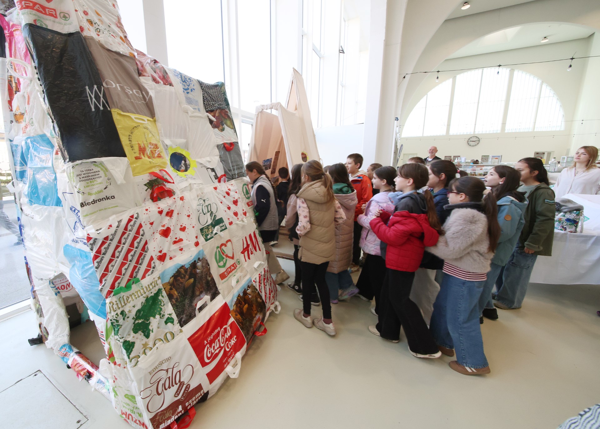 Mert a műanyag kérdése túl absztrakt ahhoz, hogy pusztán adatokkal hassunk az emberekre. Ezért vonták be a szervezők a művészeket is: installációk, design-elemek, vizuális megoldások jelennek meg a térben – olyan alkotások, amelyek a mindennapi tárgyakat új kontextusba helyezik. Egy felhalmozott műanyagkupac hirtelen nem hulladékként, hanem történetként jelenik meg: fogyasztási szokásaink tanulságos lenyomataként. Kanics Dorottya, pécsi képzőművész látványos, óriási szatyrot formázó installációja kiállítótérként is funkcionál, amiben a szatyrok történeteket mesélnek: a műanyagok és az újrahasznosítás történeteit.
