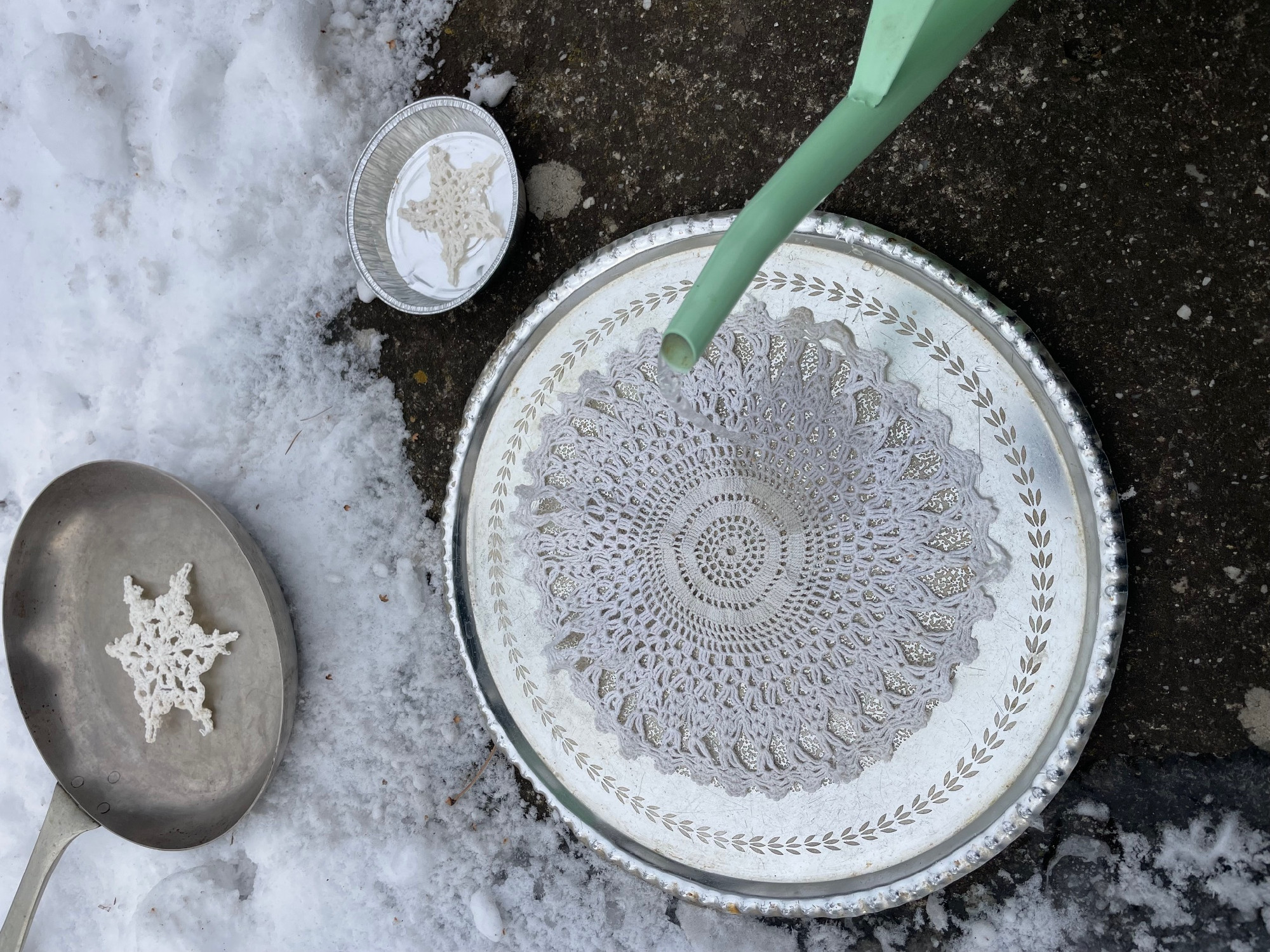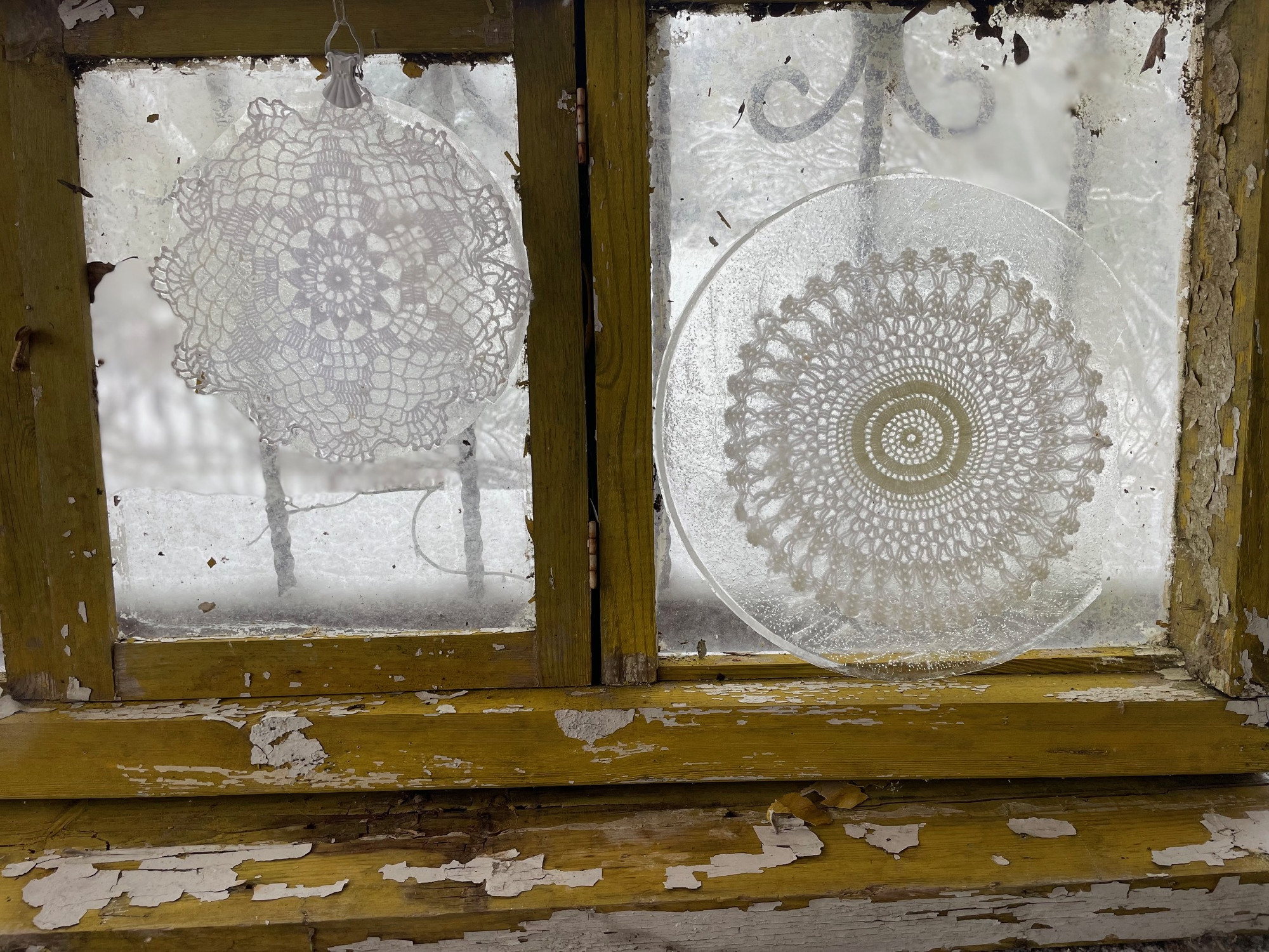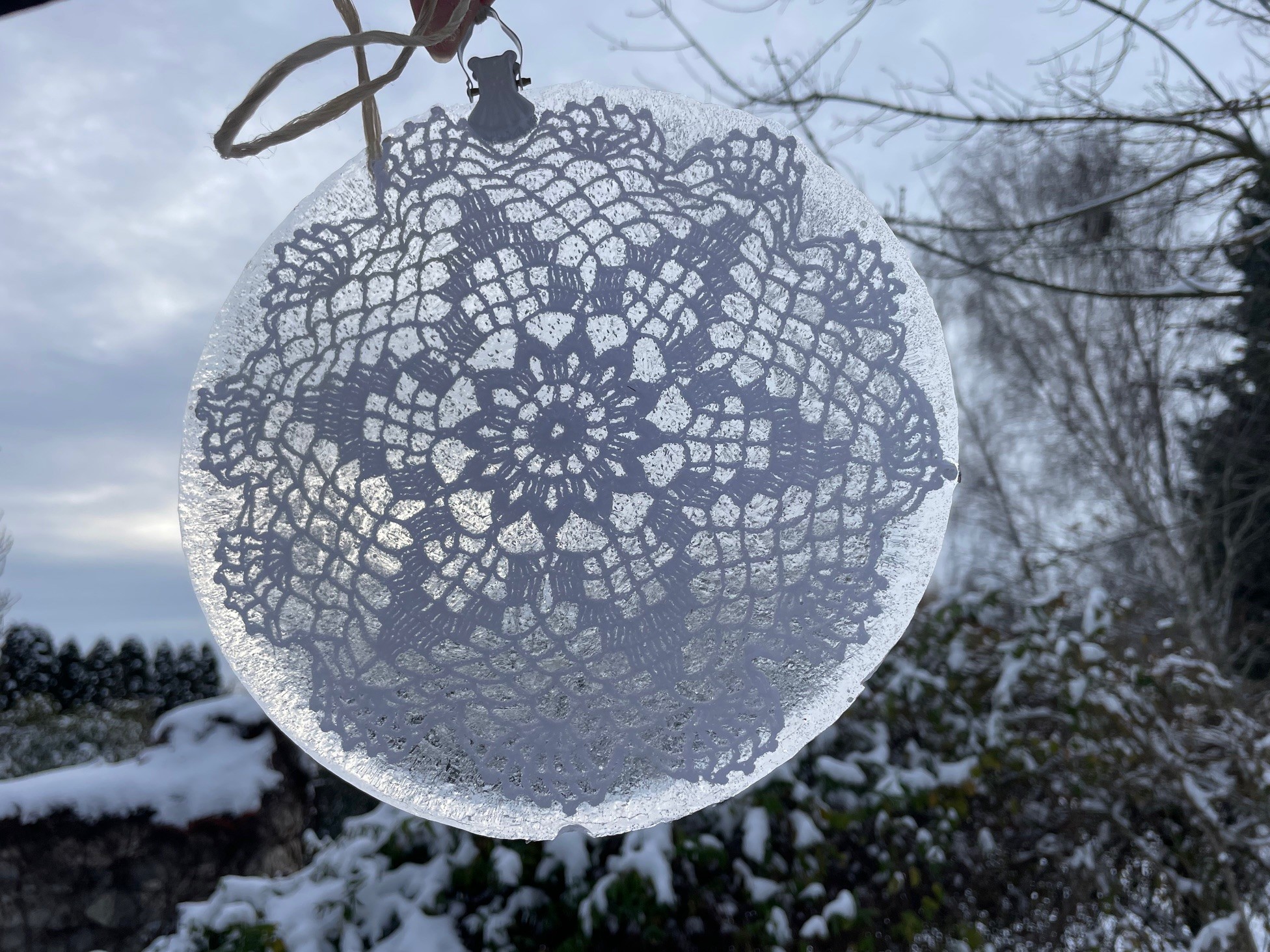 Egy kedves osztrák barátnőmnél láttam sok évvel ezelőtt, amikor szinte nyakig ért a hó és dermesztő hideggel tombolt a tél, hogy az ablakokba kívül jég-képeket akasztott. Ehhez a láda mélyén talált réges-régi csipketerítőket használta fel. Most én is kipróbáltam, kihasználva a rég nem látott fagyos napokat. Néhány fém tálcára simítottam a horgolt terítőket, vizet öntöttem rá, és vártam, hogy megfagyjon. Másnap vigyázva meglazítottam a széleken, kiborítottam a tálcából, és egy-egy függönycsipesszel felakasztottam őket. Közben a Tiktokon láttam, hogy a kész jégképen fúróval is lehet lyukat ejteni, ez viszont nekem nem sikerült, elrepedt a jég. Ki kell tapasztalnom, mi lehetett a hiba!