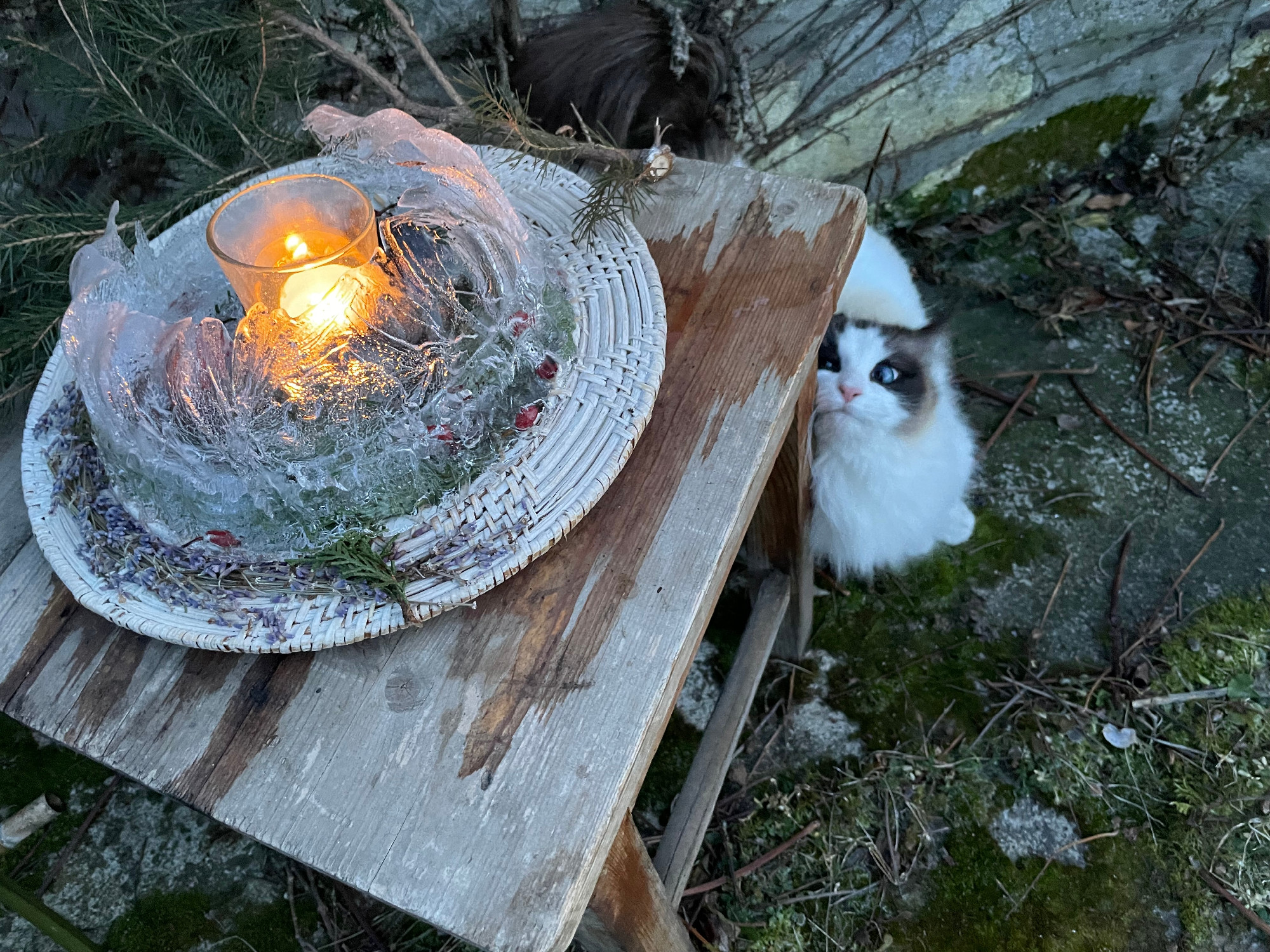 A kuglóf forma kifejezetten szép formát fog eredményezni, karimáig töltsük vízzel, rendezzünk benne el ágakat, bogyókat, és tegyük ki a hidegbe. Minél nagyobb, annál több idő kell ahhoz, hogy megfagyjon! Ha jól átfagyott, borítsuk rá egy erre alkalmas tálra, deszkára, kezünkkel vagy gyertyával kissé melegítsük meg az alját, hogy könnyedén kiessen a formából. Lehet a terasz pompás téli dísze, tehetünk bele mécsest, gyönyörű, amikor alkonyat után átsejlik az imbolygó fény a jégpaláston.