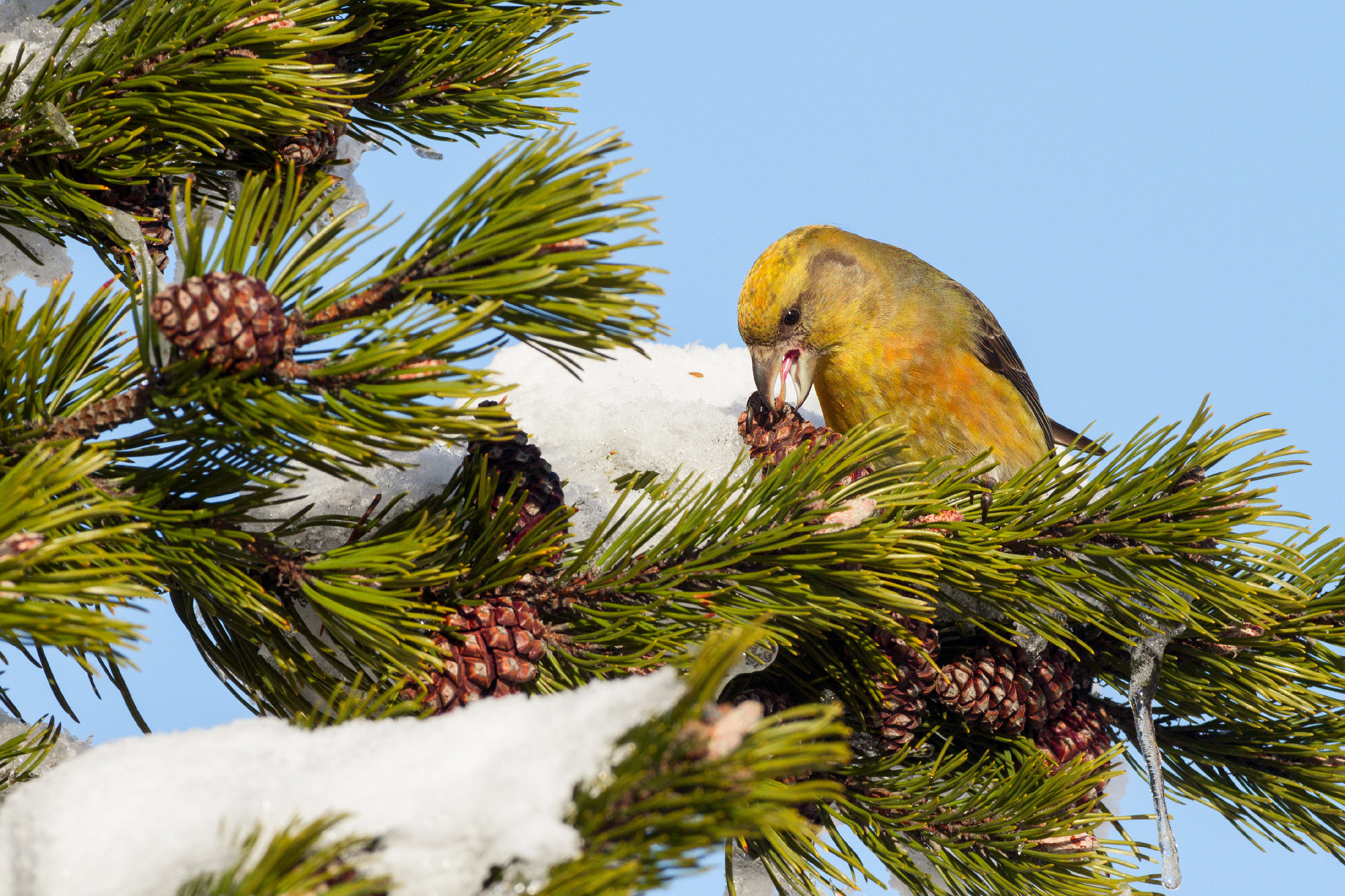 Északi területek fenyveseinek lakója a keresztcsőrű, amely nevét a jellegzetesen keresztben álló csőréről kapta. A különös csőrszerkezet a tobozpikkelyek szétfeszítésére szolgál, amelyek közül így ki tudja szedegetni az egyébként elérhetetlen magokat.