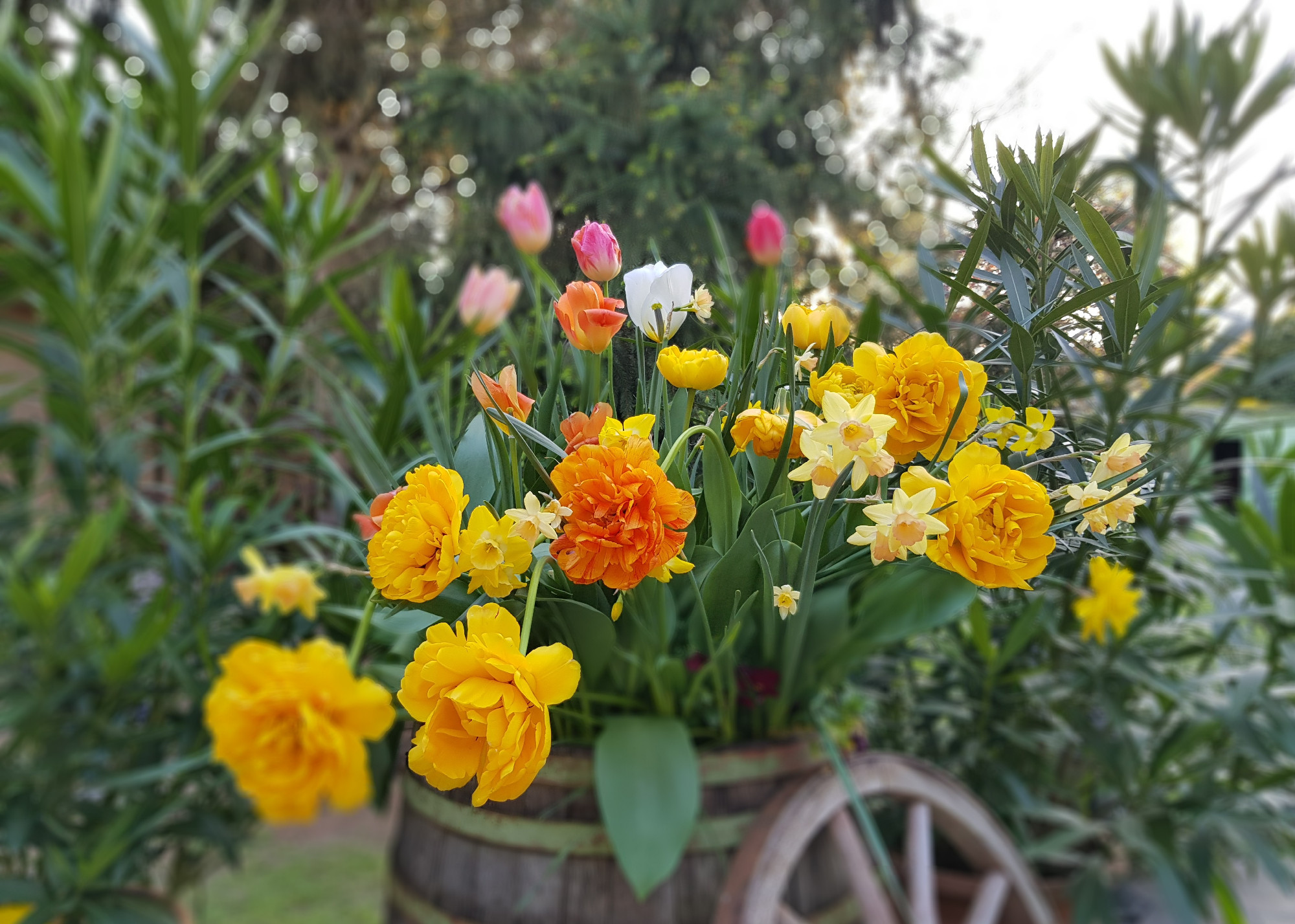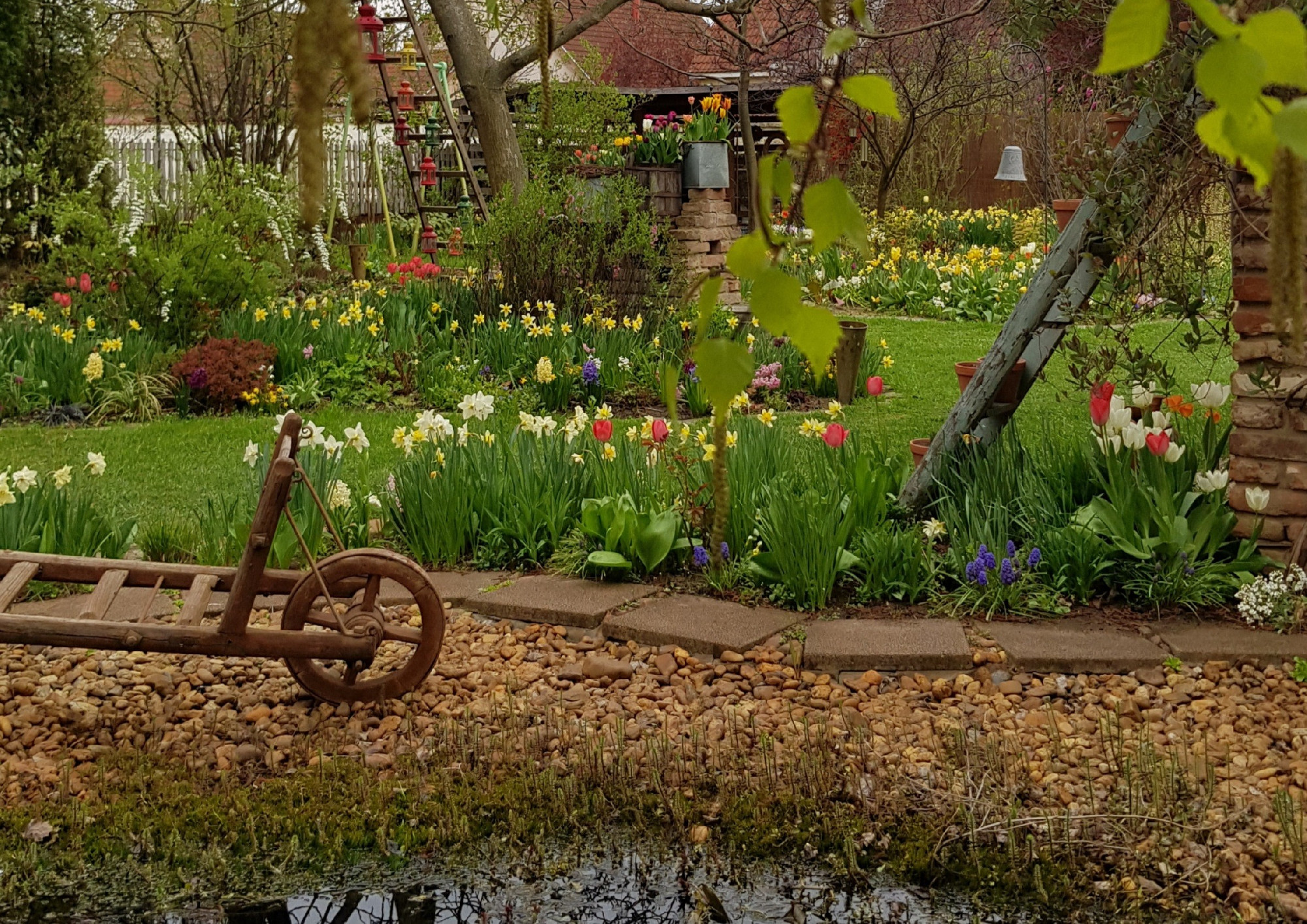 Aki nálam jár, az tudja, hogy imádok dekorálni a kertben! Szeretek a régi, használaton kívüli tárgyaknak új életet adni. A bejárati oldalra különös gondot fordítok, ahogyan láttad te is, itt mindig új, az évszaknak megfelelő dekoráció nézelődik az utca felé. Ezt nézegetheti az is, aki erre jár. Tavasszal szeretem hagymásokkal benépesíteni, a régi edényekbe, nagy cserepekbe rétegezve teszek hagymákat még ősszel. A tulipánok fölé kerülnek a nárciszok, arra esetleg az apróbb hagymások, és végül árvácskák. Télen a színes árvácskák szépen mutatnak. Ha nincs hó, egész télen virítanak. Amikor pedig beindul a tavasz, akkor a rozsdás lábosból, a gumicsizmából, az öreg bödönből csak úgy törnek elő a gyönyörűséges virágok! Ezek mind teljesen új, friss hagymák, így elképesztő szín-kompozíciókat hozok létre. Lehet velük játszani, imádom a most oly divatos narancssárgát lilával, bordóval.