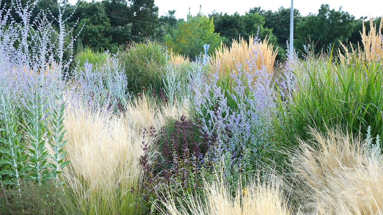 Négy évszakos látvány évelőkkel, fenntartható rózsatársítás, gazdag ökoszisztéma