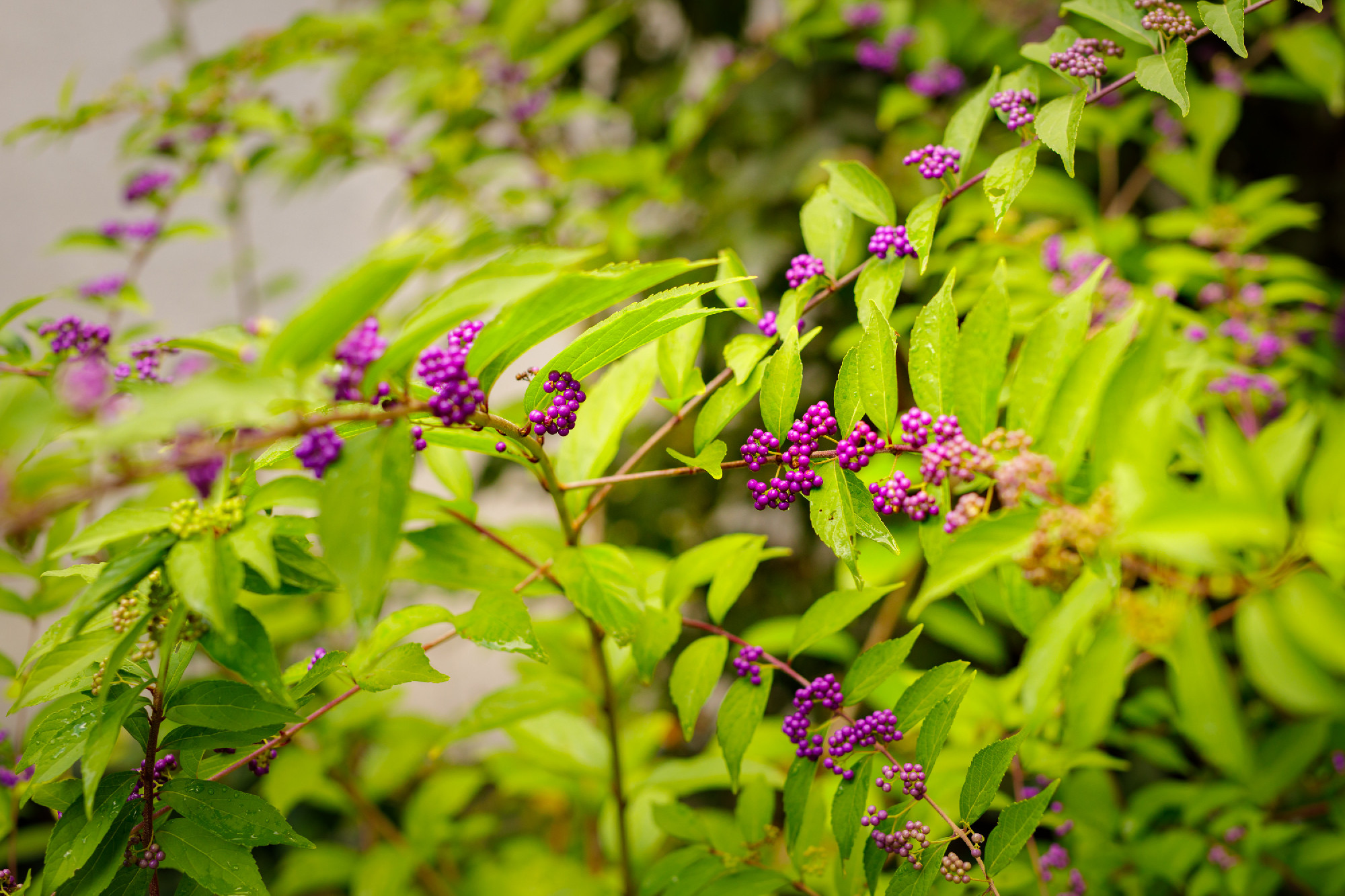 Olyan növényeket kerestem, amelyek mindig díszítenek az örökzöldek mellett. Ilyen például a húsos som, amelynek gyönyörű az ágrendszere, szép színűek a levelei, tavasszal a virágai, ősszel a bogyói. Az almazöld som szépen fordul át sárgába, ágai citromsárgák, gyönyörűek! A kínai lilabogyó (Callicarpa) folyamatosan érik, és egészen húsvétig megmaradnak a bogyók az ágakon. Olyan különlegesek, nem csak a lila, hanem a fehér is, amelynek bogyói zöldből érnek hófehérré!
