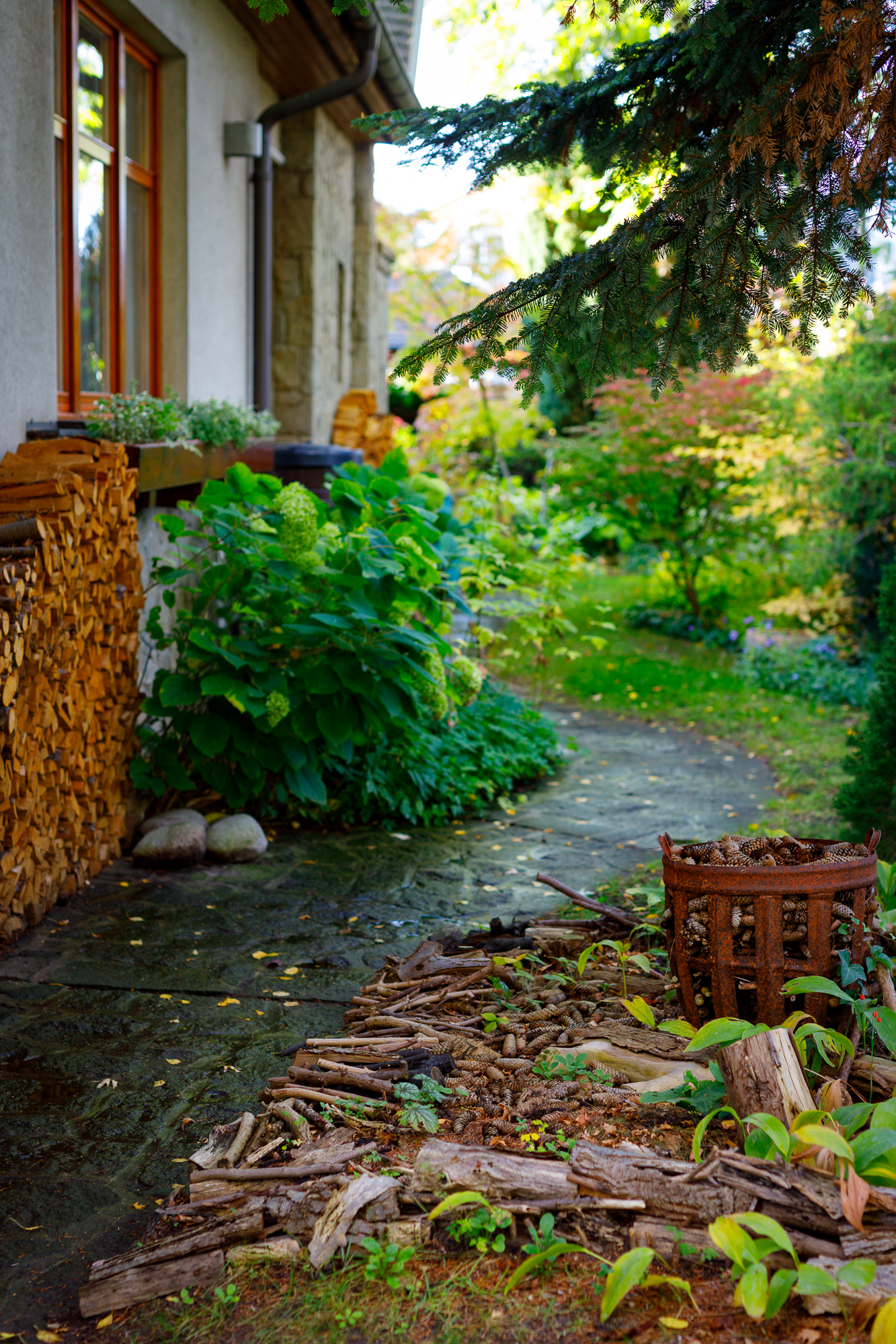 Nálam nincsenek szabadon hagyott felületek, mindent elborítanak a talajtakarók. Erdei szamóca, egynyári nefelejcs, százszorszép, borostyán. Az évelők alatt ott a mulcs, a levágott és felaprított növényi részek, a komposzt. A szomszédok karácsonyfáit is összegyűjtöm, és feldarabolva kerülnek a komposztra, vagy egyenesen a tövekhez. A holt fákat is ott hagyom, ahol vannak, hiszen a körforgáshoz, az élethez ezek a holtak is ugyanúgy hozzátartoznak. Akárcsak az igazi természetben. Nincsenek ágyásszegélyek, olykor a fűnyíróval belevágok egy-egy levélbe, a lehullott leveleket meg felaprítja a gép.