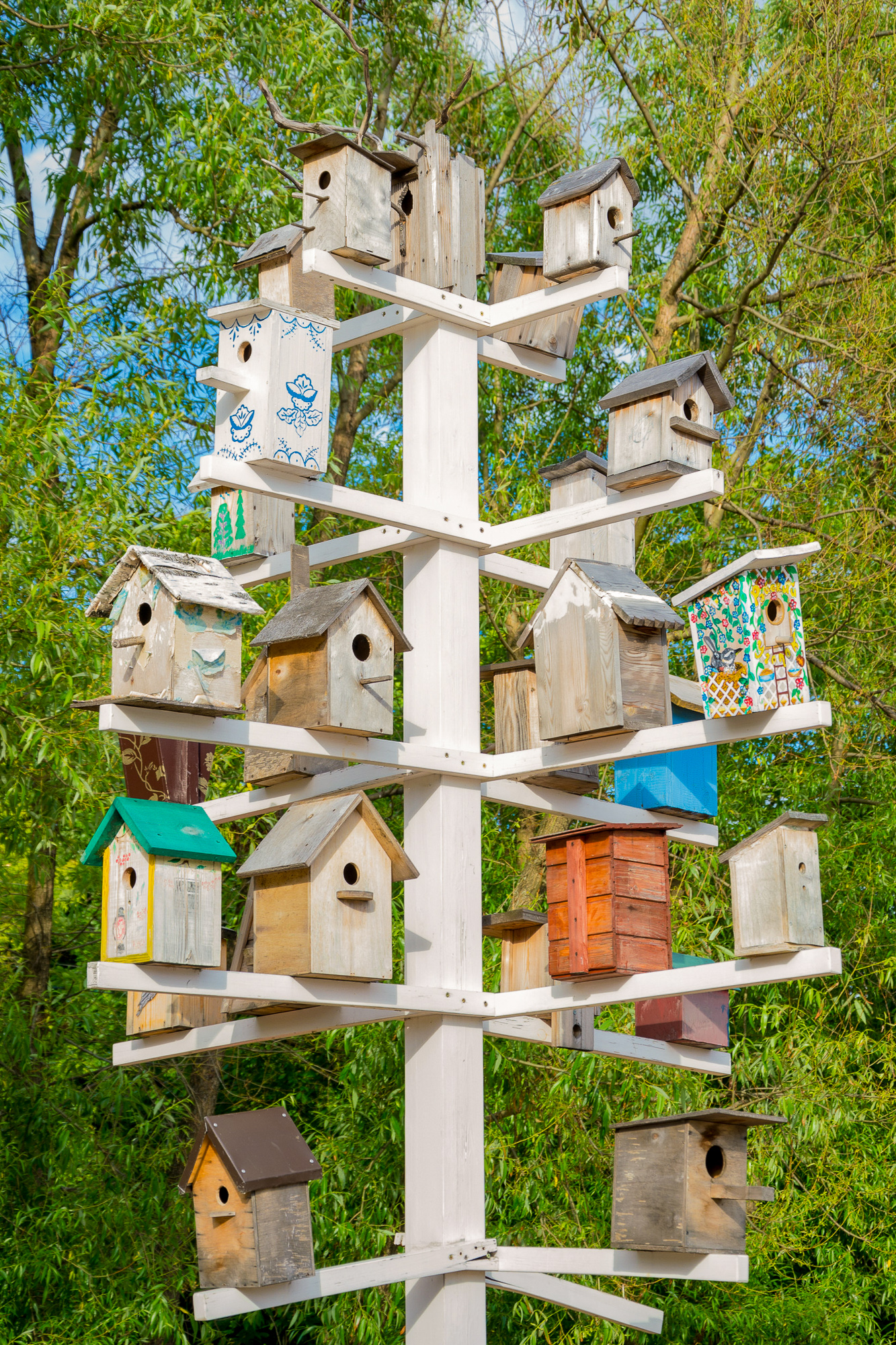 Szintén magyar mintára terjedt el az oszlopos etetőház is, amit akár kisebb kertekben is felállíthatunk, lehetőséget adva az etetőre érkező madarak alapos megfigyelésére. Pontos leírását a Kert 1908-as számában olvashatjuk: „Szerkezete nagyon egyszerű. A legegyszerűbb formája az, midőn egy vastag oszlopon egy deszkalap fekszik és ezt egy házszerű fedél borítja, melynek 3 oldala be van üvegezve, egyik oldala pedig teljesen szabad. Az asztalka vékony kis peremével bir, erre az asztalra helyezzük az olajos magvakból összeállított eleséget, hús, faggyú darabokat, diót. A házikó be nem üvegezett felét délkeletre fordítjuk, hogy így a vihartól meg legyen kimérve. Ilyen etetőt ma már az országban sokat találunk Kőszegen kívül Sopronban, Szentgotthárdon, a keszthelyi gyönyörű Balatonligetben, ahol a keszthelyi gazdakör madárvédelmi ügyosztálya gondozza azokat, van továbbá Lugoson, Kecskeméten, Aradon, Esztergomban, legújabban Nyíregyháza város tanácsa is állíttatott fel ilyeneket. Mint mindenben, úgy e téren is a tökéleteskedés felé törekedtek a madárvédők és újabban ezt az etetőt úgy módosították, hogy négy oszlopra állították középen egy főoszloppal, amelyen 2 etető asztallap van elhelyezve, egy kisebb, mely csalogatóul szolgál és egy nagyobb, mely a tulajdonképeni etető asztalka, ennek a pereméjének magasságával egy magasságban végződik a 4. oldalfal alsó széle. Az oldalfalak mindegyike üveglapból áll, ezek között és az asztal között kellő távolság van, hogy a madarak kényelmesen rárepülhessenek. Ugy erről a felső asztallapról, valamint az alsóról ajánlatos zsírdarabokat lelógatni. A kis madár ezt meglátva rá repül, kíváncsi természeténél fogva aztán bátrabb lesz, feljebb is repül és ekkor meglátja a terített asztalt. A madár az üvegtől nem idegenkedik, csakhamar kiismeri magát a húsos fazék körül és teljes bizalommal fogja az etetőt megkeresni. Egy nagy előnye, hogy az eleség teljesen védett e készülékben, nem érheti se hó, se eső, se szél, több napra megtölthető és mindenkor ellenőrizhető a benne lefolyó, nyüzsgő madárélet, gyermek is szemlélheti a szobából, anélkül, hogy közeledjék feléje…”