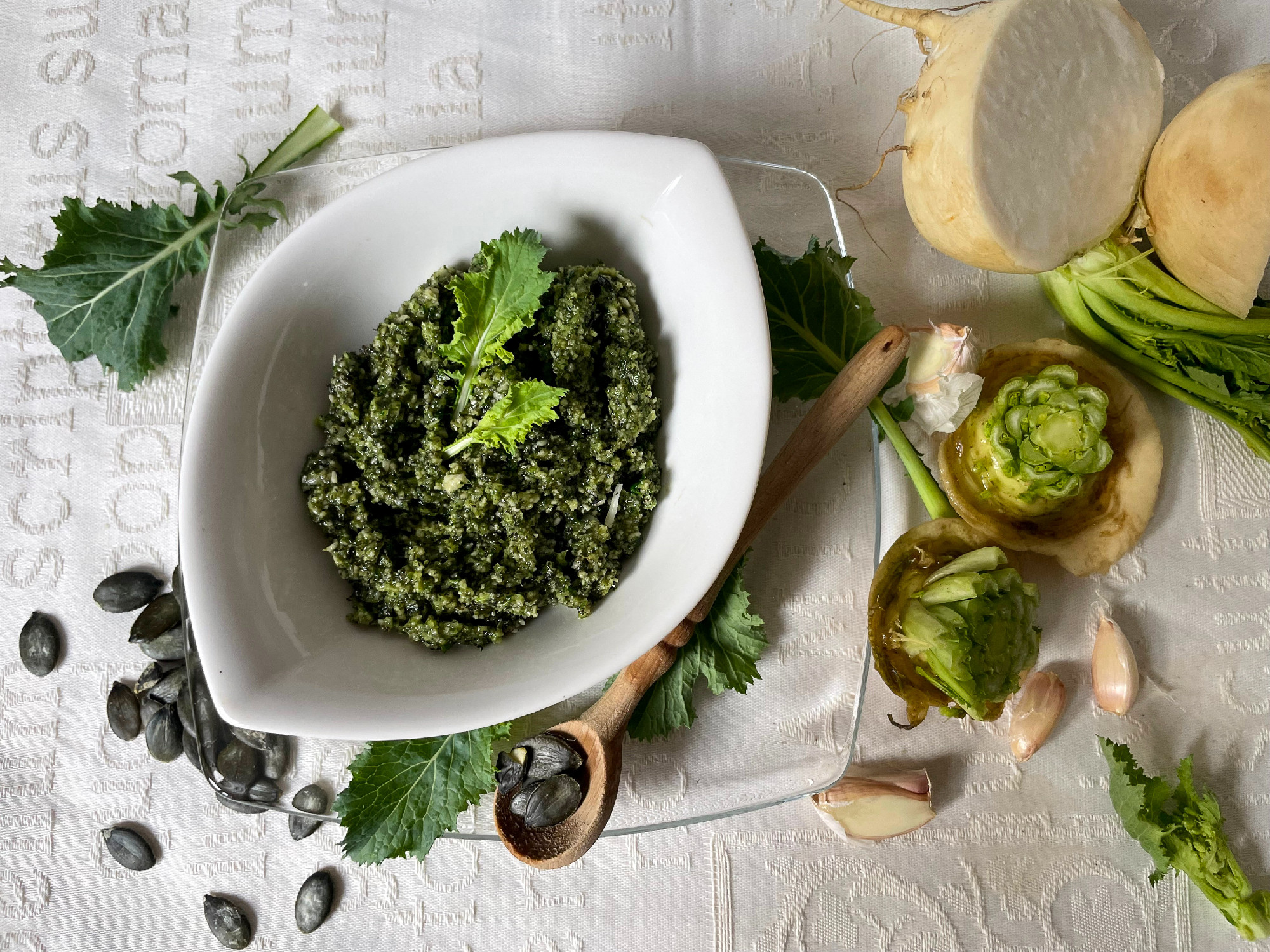 A tökmagot, a reszelt sajtot és a nagyvonalúan feldarabolt reteklevelet aprítógépbe tesszük, és pépesítjük. Hozzáadjuk a sót, a fokhagymát, a citromlevet, belecsorgatjuk az olívaolajat, és krémesre keverjük. Kínálás előtt néhány órára behűtjük, hogy az ízek jól összeérjenek.