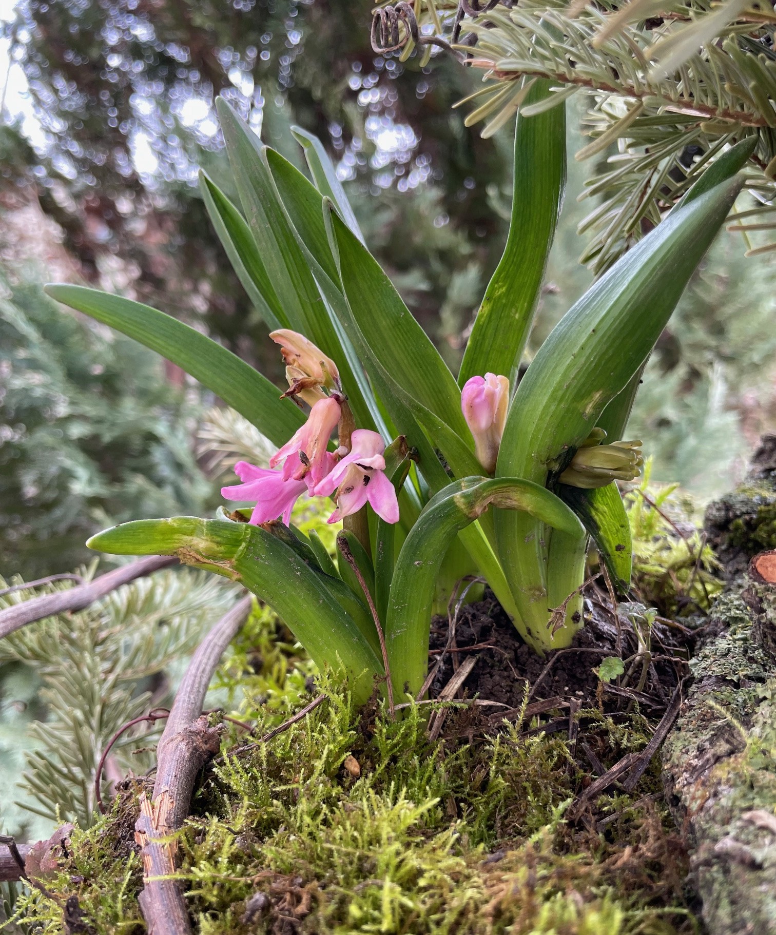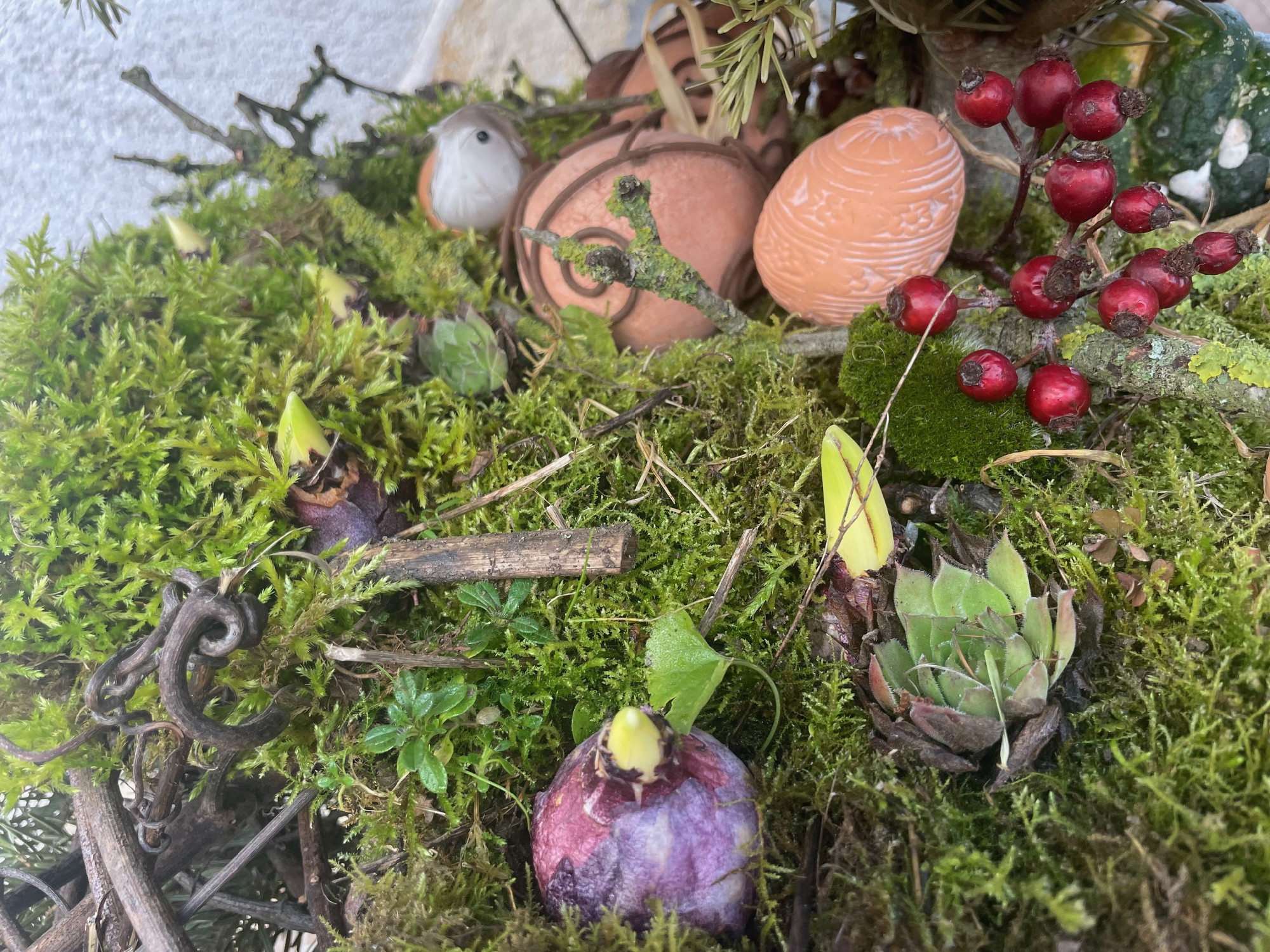 Amikor elkészült, finoman megspricceltem vízzel egy szórófejjel ellátott palackból, és mostantól az időre és napsütésre bízom. Már magában így is szépen mutat, belezöldell a még kopár előkertbe. De reményeim szerint amint melegedik az idő, napról-napra más arcát fogja mutatni. A böjti időszak kellemes és visszafogottan elegáns, természetes szépséggel fogja fogadni a hazatérőket, a hozzánk látogatókat. És ha minden jól megy, húsvétra szárba szökkenek a virágok, kihajtanak a hagymák virágai, és színes-illatos örömmel fog megajándékozni. Azt hiszem, a tavasz, az újjászületés, a körforgás és a feltámadás méltó alkotásához adott alapot a mi kedves karácsonyfánk!