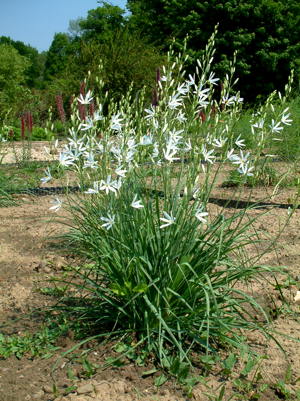 A homokliliomféléket képviselő Anthericum liliago 30-80 cm közötti évelő növényünk, amelynek szára alján fejlődő, tőlevélrózsát alkotó levelei szálasak és gyakran viaszbevonattól szürkések. A tőkocsányon egyszerű fürtvirágzatban találhatók fehér színű virágai, amelyeknek bibeszála felfelé hajló.