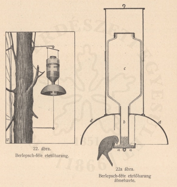 Ha szánunk egy kis időt Berlepsch életművének tanulmányozására, akkor egészen izgalmas megoldásokat, szerkezeti rajzokat is találhatunk. Lapról lapra tűnnek fel a jobbnál jobb megoldások, melyek közül egyik kedvencem az etetőharang. A készülék lényege, hogy egy felfordított palackhoz hasonló üvegedény felül el van zárva, nyaki nyílásába egy cső van beillesztve, ez alatt pedig egy etetőlap van, amit több dróthúr tart. Mindez abban a köpenyben van megerősítve, ami a csövet körbeveszi. „Ezen üveghengerből- miután a magvak gördülékenysége a henger szerkezete folytán szabályozva van csak annyi mag jut ki, amennyi az etetőlap pereméig ér. Ezen készüléknek előnye a könnyen alkalmazhatósága, a teljes mértékben kifejthető takarékosság, az eleség teljes konzerválása és az, hogy enyhébb időjárásnál elég hetenként egyszer megtölteni és a benne lévő eleségmennyiség ellenőrizhető, anélkül, hogy a készülékhez nyúljunk”- szól a korabeli leírás.