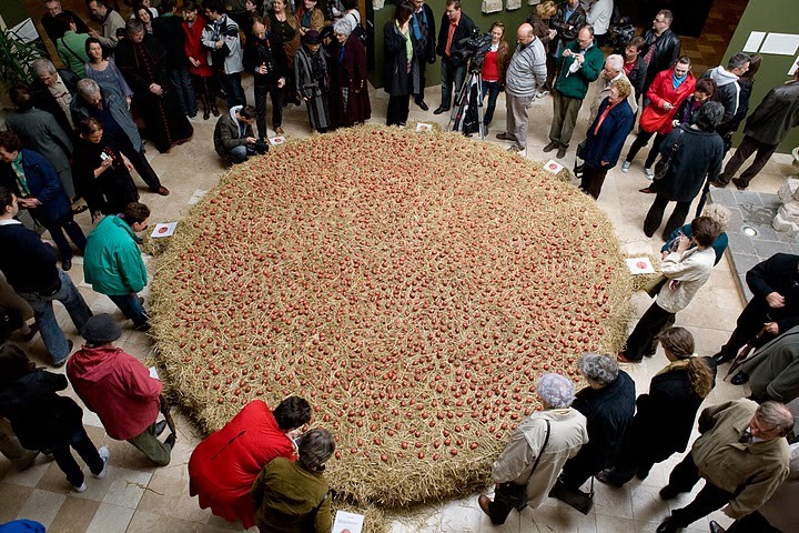 Éva Pécsett, az Európa Kulturális Fővárosa eseménysorozathoz kapcsolódva 2010-ben 2010 darab saját készítésű, különböző mintájú hímes tojásból rakott fészket/ fotó: Mosonyi Éva