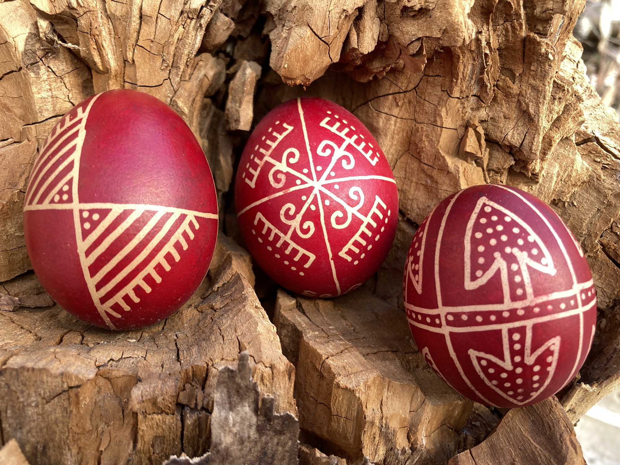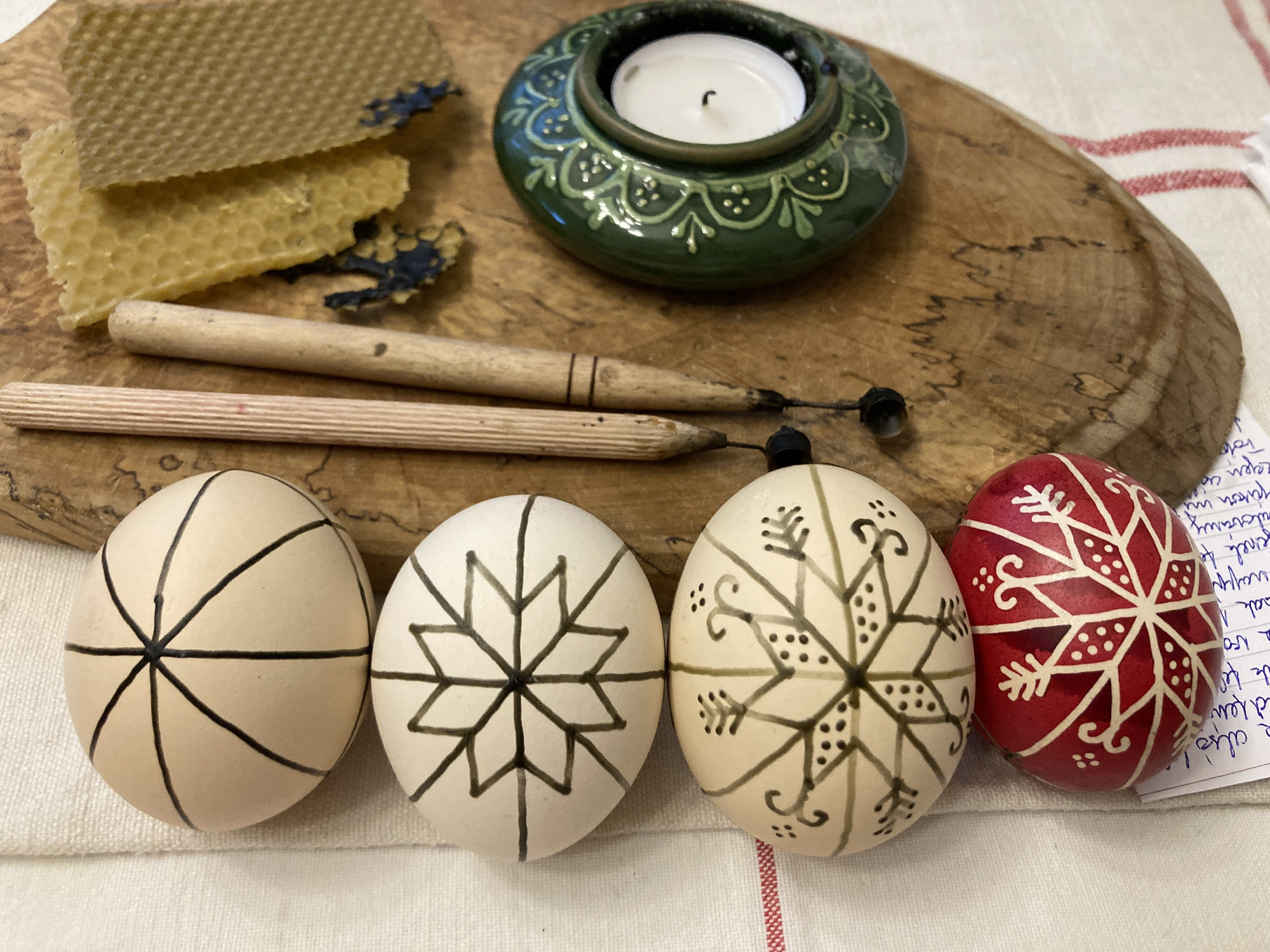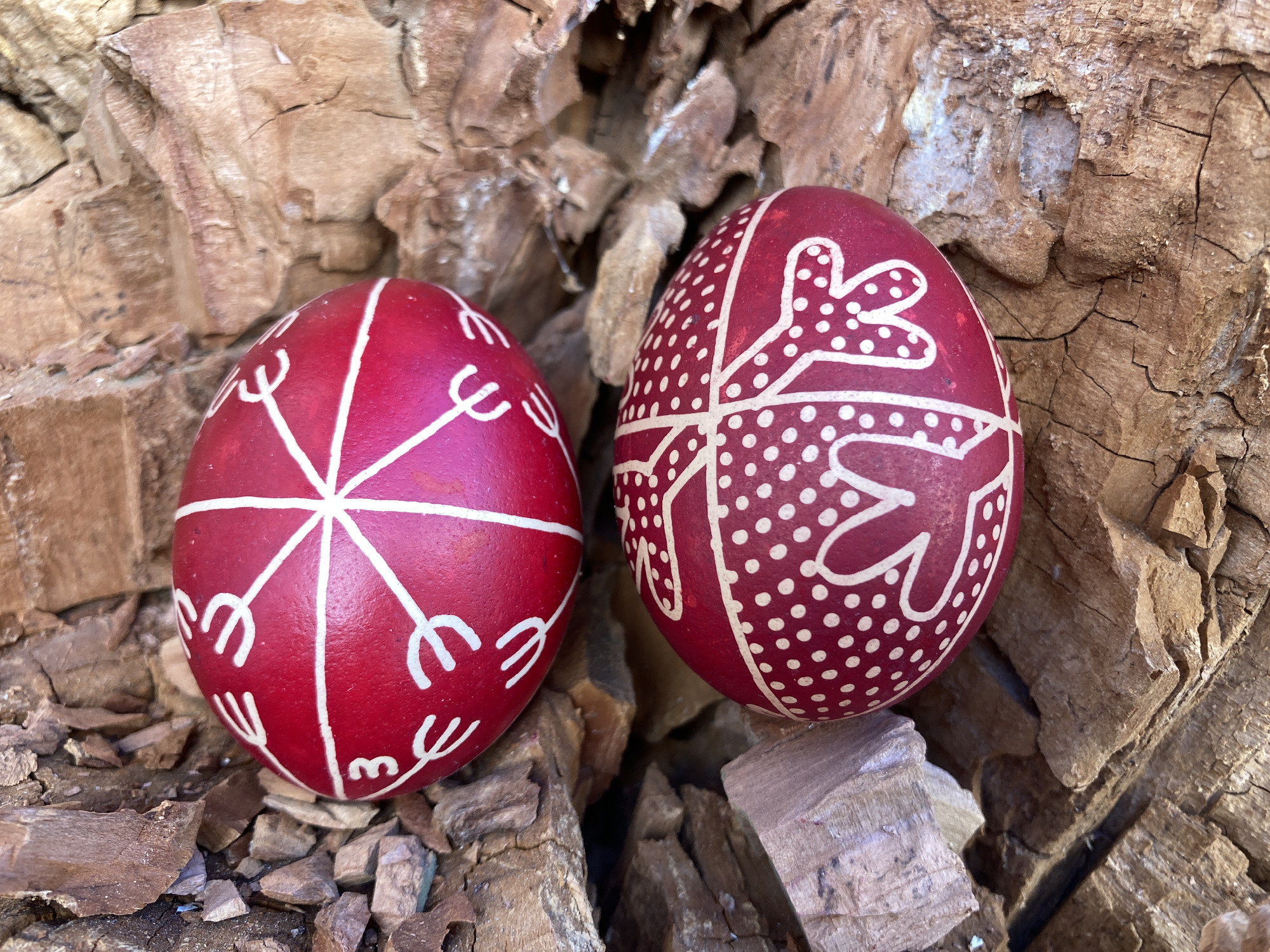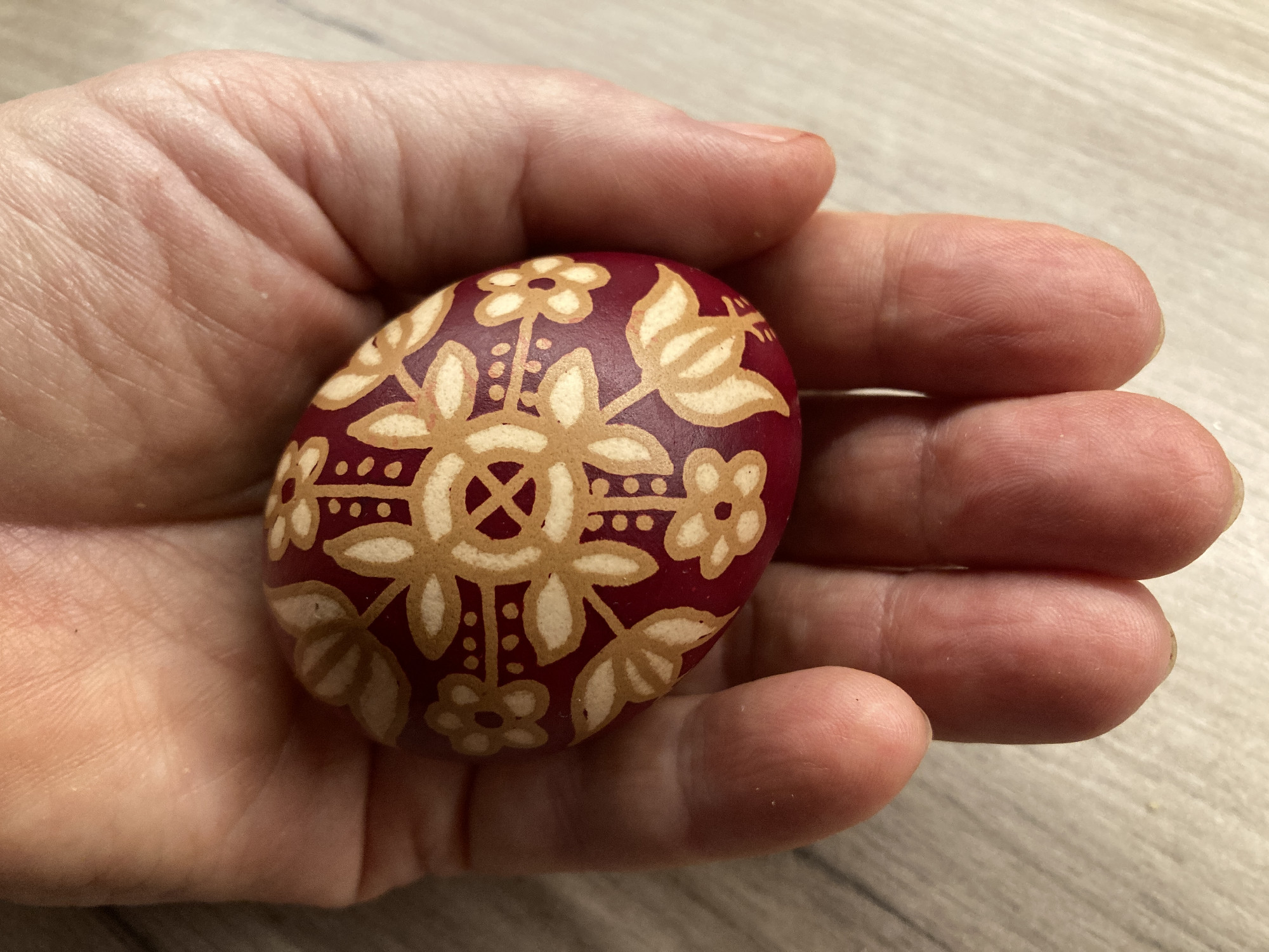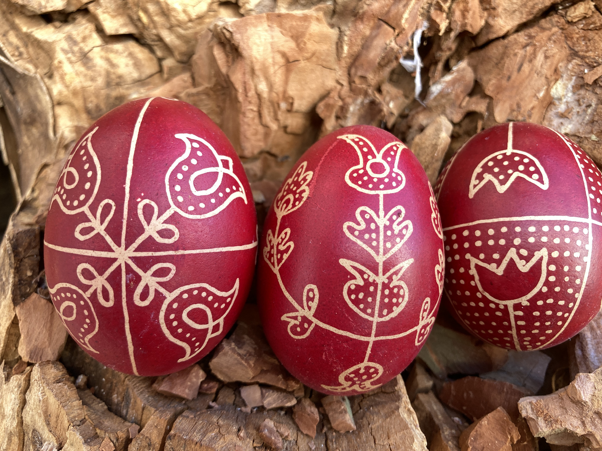 Ezek általában virágok voltak, az én első tanult mintám a gereblyés volt, ami ma is nagyon népszerű. Szép fehér héjú tojásra írtuk a mintákat, majd sárgítóba, végül piros festőlébe tettük. Ez a tevékenység Húsvét előtt megszokott volt a családban. A gáztűzhely mellett készültek a tojások viasszal, írókával. Az egész konyha csupa füst volt az apró konzerves dobozban melegített viasztól, ami hozzátartozott a húsvéti készülődés illatához. Ebben nőttem fel.”