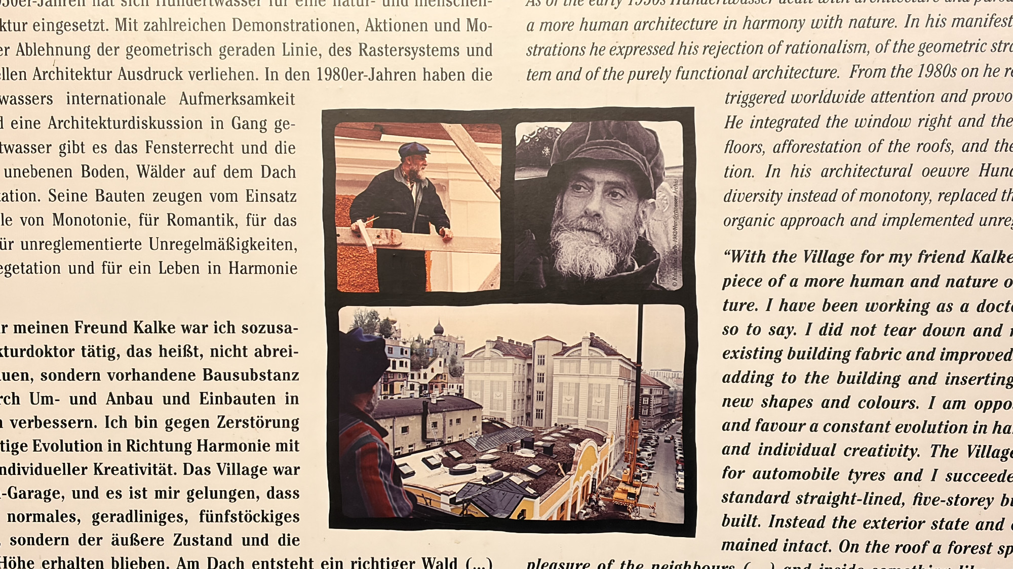 Építészeti munkáiban Hundertwasser ezeket az elveket a gyakorlatba is átültette. Leghíresebb alkotása a bécsi Hundertwasser-ház, amely színes homlokzatával, hullámzó padlóival, zöldtetőivel és a házból „kinövő” fáival teljesen szembemegy a hagyományos városi lakóépületek logikájával. Az épület nemcsak lakóhely, hanem egyfajta élő organizmus, amelyben az ember és a természet együtt létezik. Hundertwasser szerint minden lakónak joga van ahhoz, hogy az ablaka környékét saját ízlése szerint alakítsa ki - ezt nevezte „ablakjognak”. A művész így vallott a házról: „Néhányan azt állítják, a házak falakból állnak, szerintem meg ablakokból.” A háztól nem messze, néhány perces sétával elérhető egy másik Hundertwasser-épület is, a Kunst Haus Wien. A művész által alapított múzeum és kiállítási központ látogatható, és nagyszerű keresztmetszetet nyújt a mester munkásságáról.