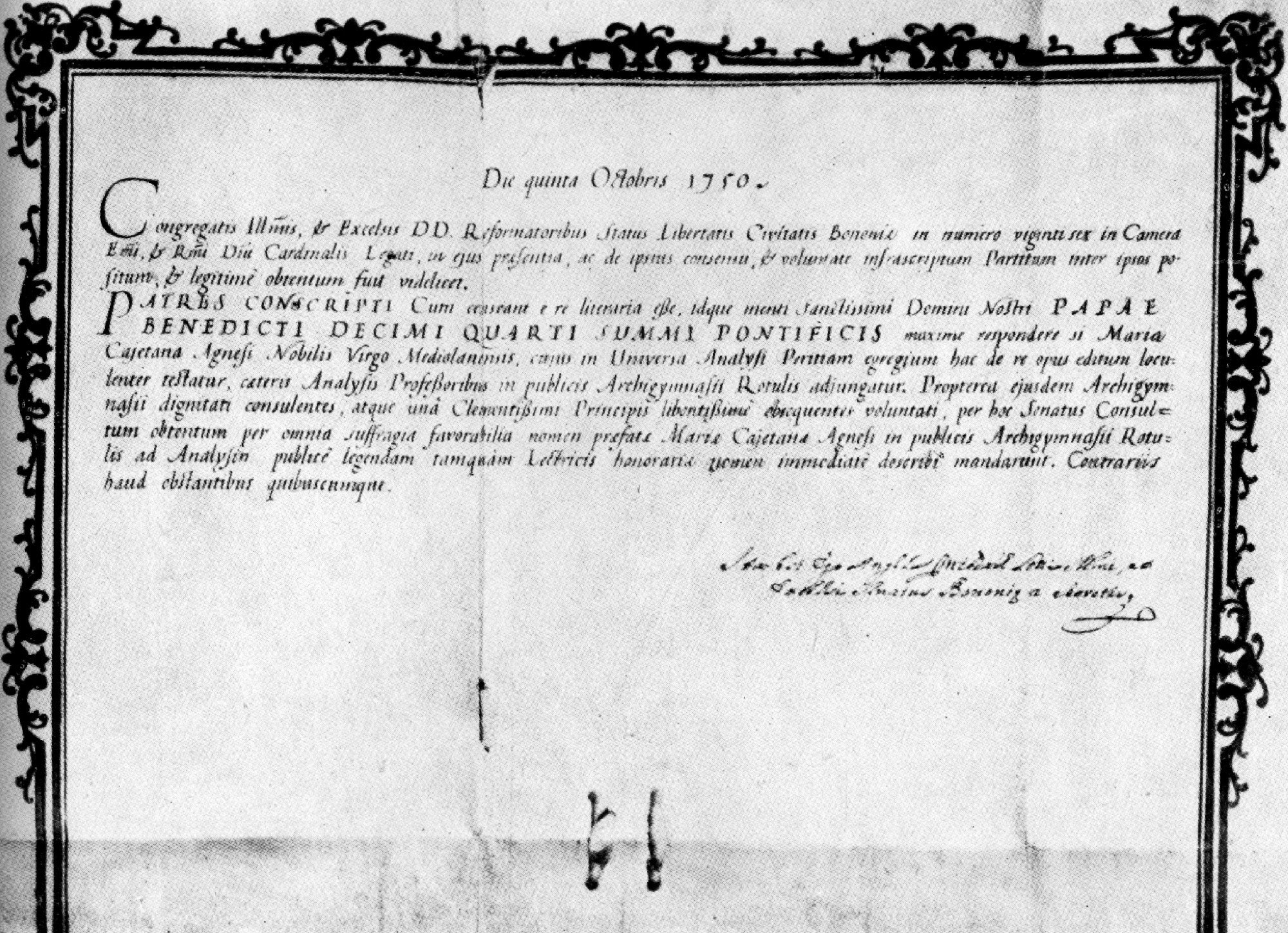 A könyv által hozott elismerés és a szakma megbecsülése ellenére a Francia Akadémia mégsem választotta tagjai közé, mivel az alapszabály szerint nőket nem lehetett felvenni. Az olasz akadémikusok azonban haladó szelleműek voltak, így Agnesi-t a Bolognai Tudományos Akadémia tagjává választották. XIV. Benedek pápa tiszteletét is elnyerte, aki kinevezte a bolognai egyetem matematika és filozófia tanszékének vezetésére, így ő volt a második nő, aki egyetemi professzori kinevezést kaphatott. A történészek többsége szerint azonban ezt a tisztséget soha nem töltötte be: apja romló egészségi állapota és saját betegségei miatt. Édesapja halála után teológiai tanulmányokba kezdett és rövid időn belül a szegények, a hajléktalanok és a betegek segítésének szentelte életét.