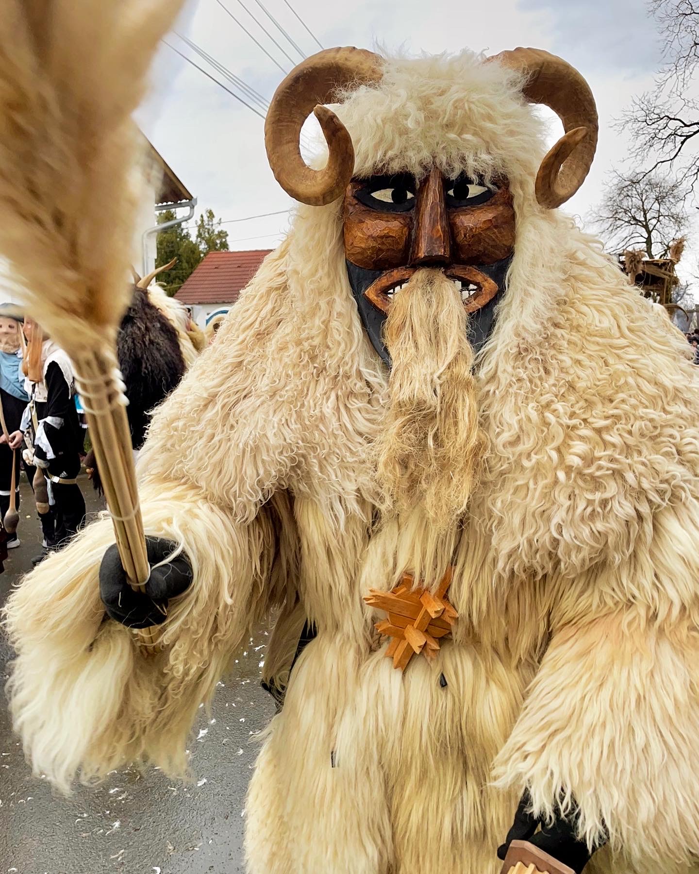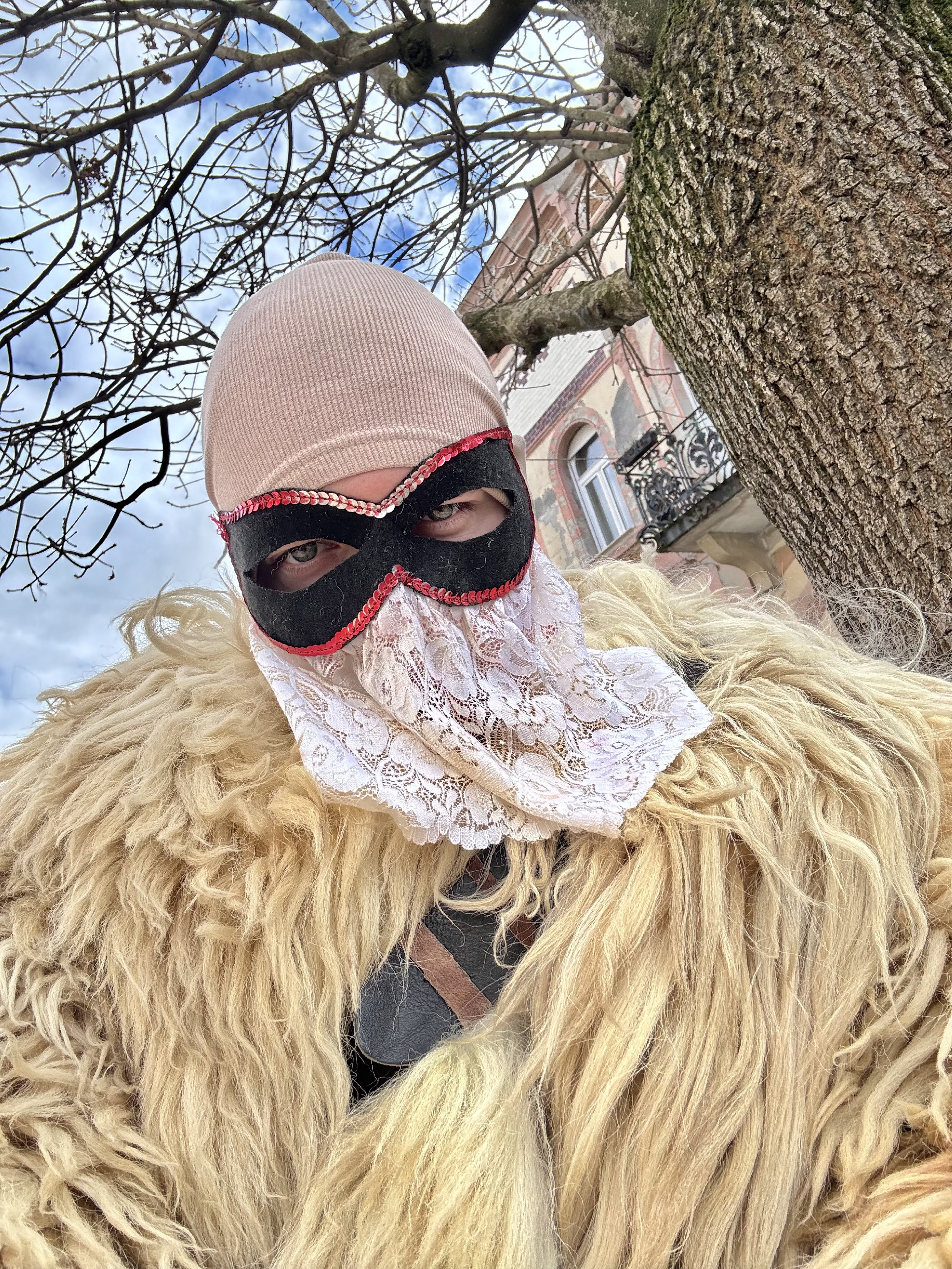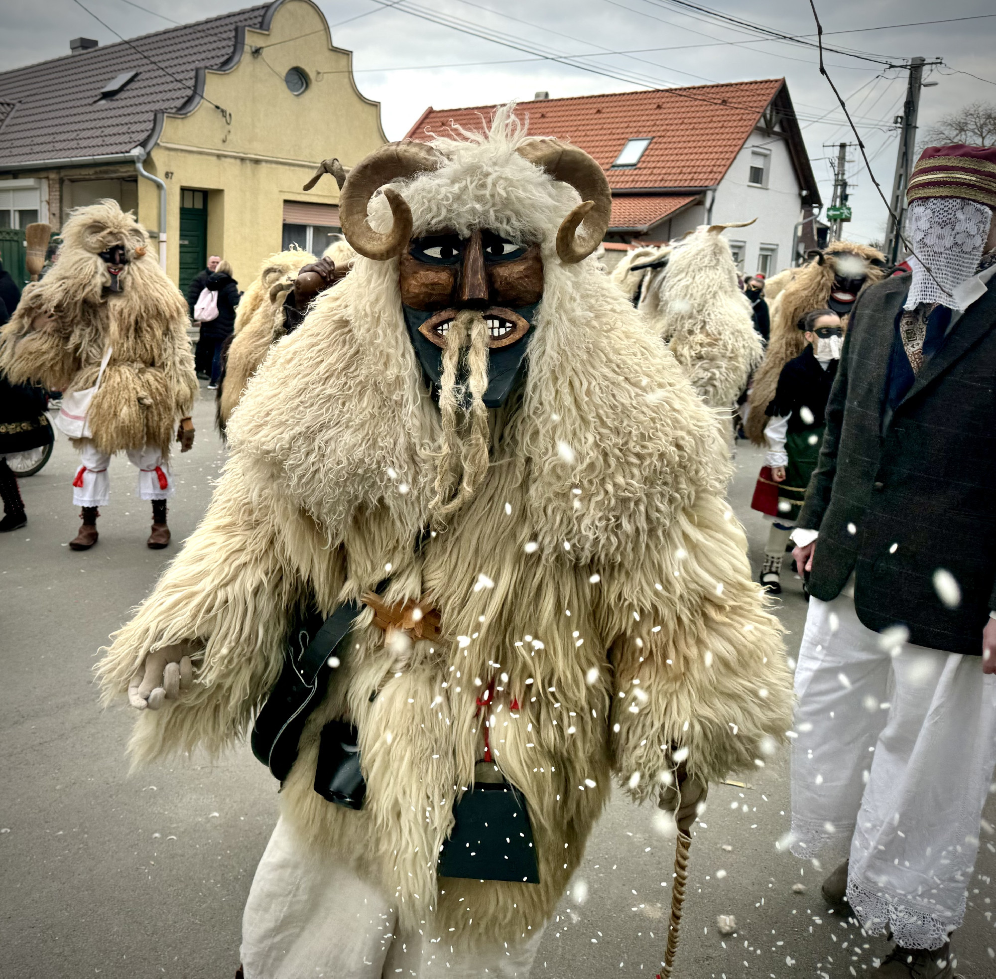 A telefonom lépésszámlálója szerint egy-egy nap alatt akár 15–20 kilométert is gyalogolok Mohácson, a város nevezetes pontjai között, kolompjaimmal és láncaimmal csörögve. A súly nemcsak statikus teher, hanem minden lépésnél újra és újra megmozdul rajtam. Az utóbbi évek enyhébb február végi, március eleji időjárása pedig tovább fokozza a kihívást: nem ritka a 15–17 Celsius-fok sem napközben. Birkabundában, zárt maszkban ez kifejezetten embert próbáló. Az izzadság végigfolyik a hátamon és estére minden porcikám érzi a nap súlyát – amely nem mindig kellemes.