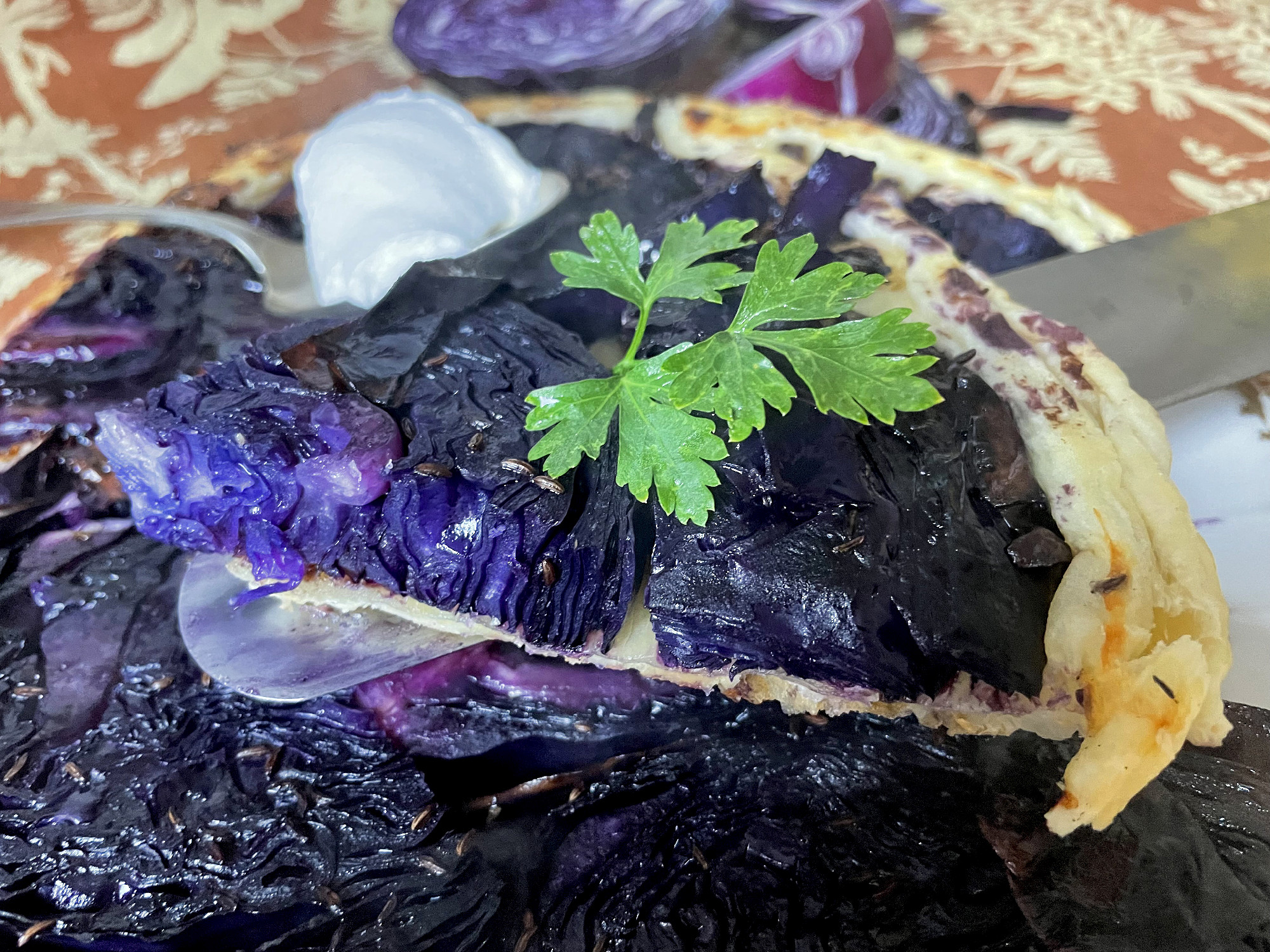 Eközben a leveles tésztából akkora korongot nyújtunk, mint a káposzta-karika a tepsiben. A majdnem megsült káposztát a sütőből kivesszük, ráborítjuk a tésztát, kissé lenyomkodjuk, felvert tojással lekenjük, megsózzuk, esetleg köménymagot szórunk rá.