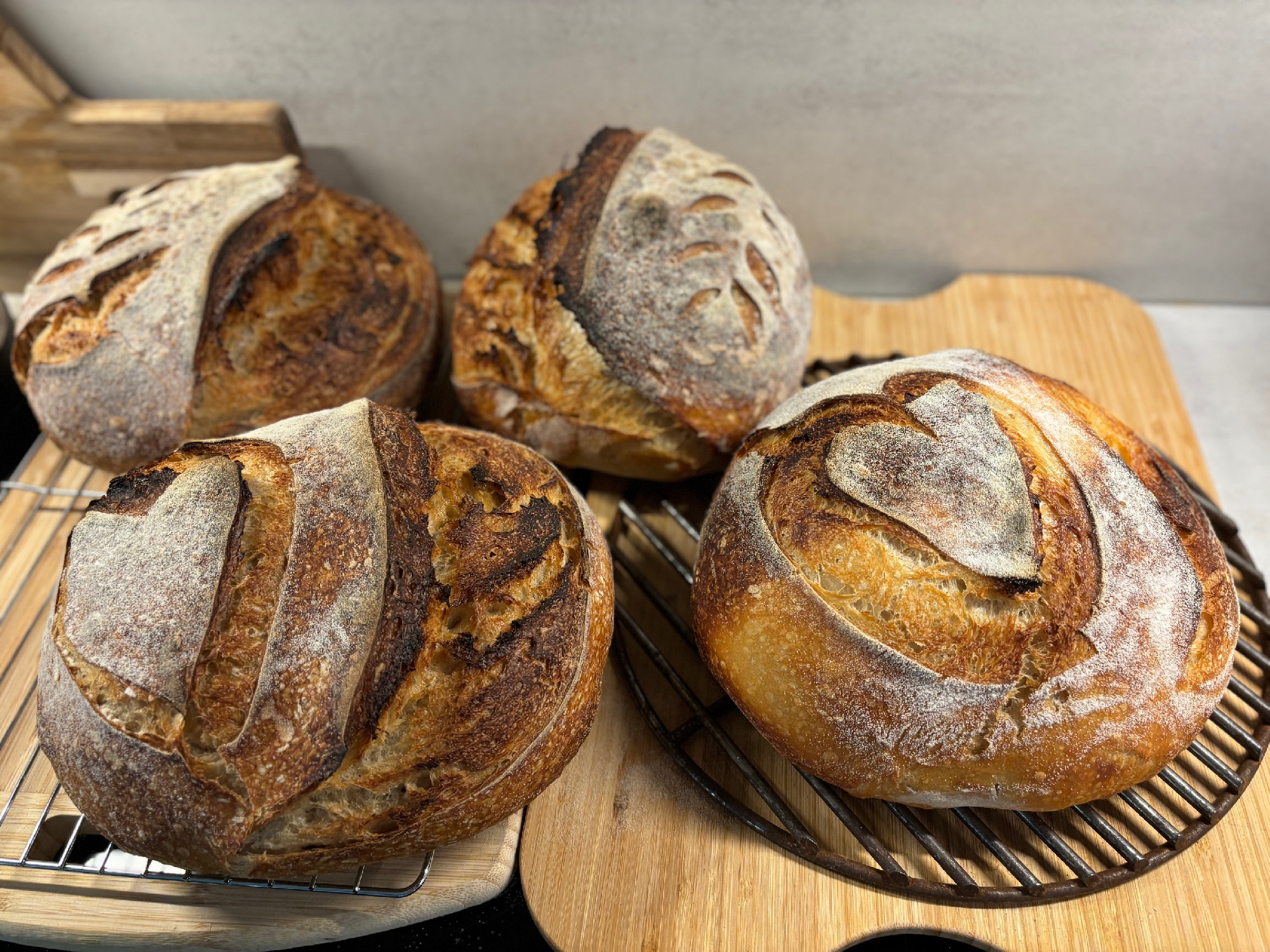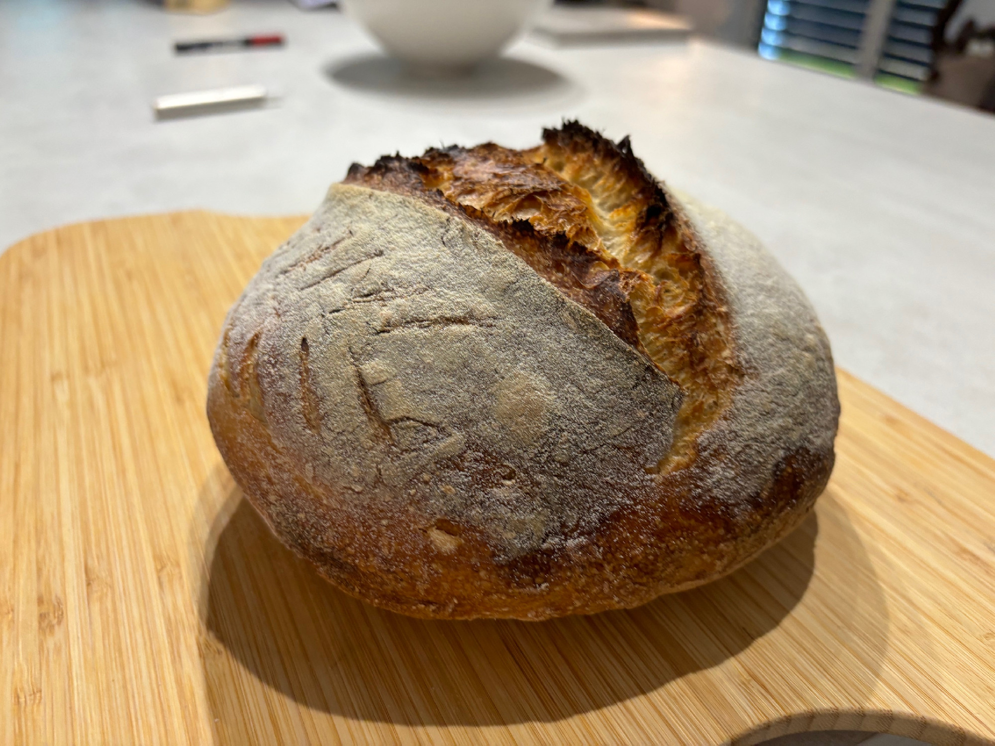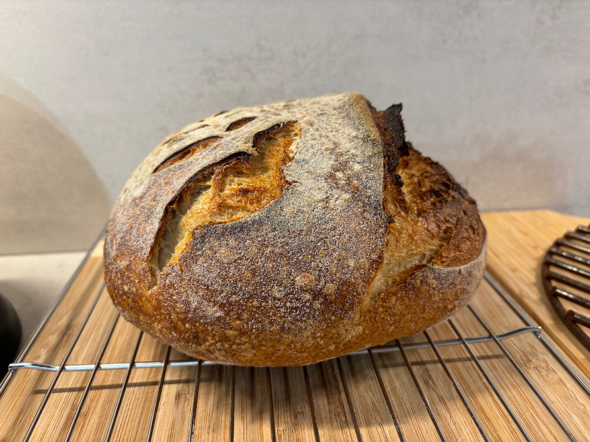 Érdemes úgy időzíteni a dolgokat, a hajtogatásokat, hogy a megkelt kenyértésztát kora este hűtőbe tudjuk tenni. Nálam ez úgy működik, hogy reggel megetetem a kovászt a kívánt mennyiségre, kora délután bekeverem a kenyeret, majd körülbelül 2 órán keresztül félóránként hajtogatok, így a kelés utáni megformázással nagyjából 7-8 körülre végzek, és mehet a szakajtó a hűtőbe. Másnap reggel a vaslábost beteszem a sütőbe, legalább 30 percig 245 fokon előmelegítem, ezalatt a szakajtót átteszem a hűtőből a fagyasztóba. 30 perc után kiveszem, és bemetszem egy pengével a tetején, általában egy hosszabb metszéssel, és néhány díszítő kisebbel. Ezután beleteszem a vaslábosba. Lefedem, 20 percig 245 fokon sütöm, majd leveszem a fedőt, és visszaveszem a hőmérsékletet 200 fokra. Még 20 percig sütöm fedő nélkül, majd kiveszem.