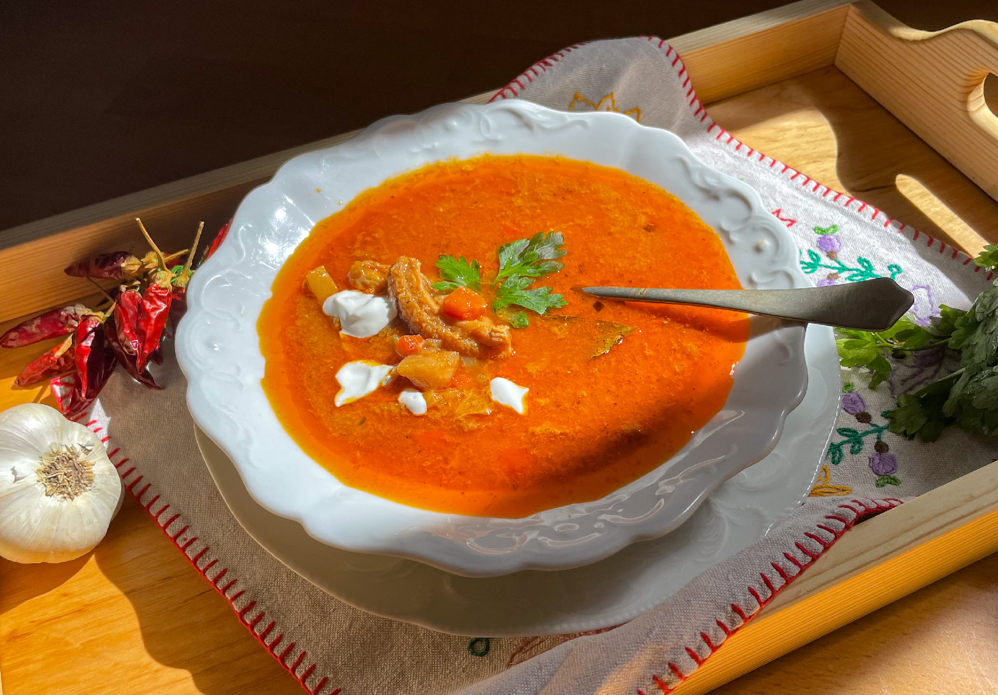 „…Főzzük minél lassabban, hosszabban – legjobb, ha szabadtűzön és bográcsban. Addig főzzük, míg a marhagyomor tökéletesen megpuhul, míg a farok kiadja minden ízét, s míg a körömcsontokról úgy hullik le zsíros bőrkabátjuk, mint Attiláról a kultúra (vagy mint másról a ruha boldog szerelemben)…” írja Cserna-Szabó András.