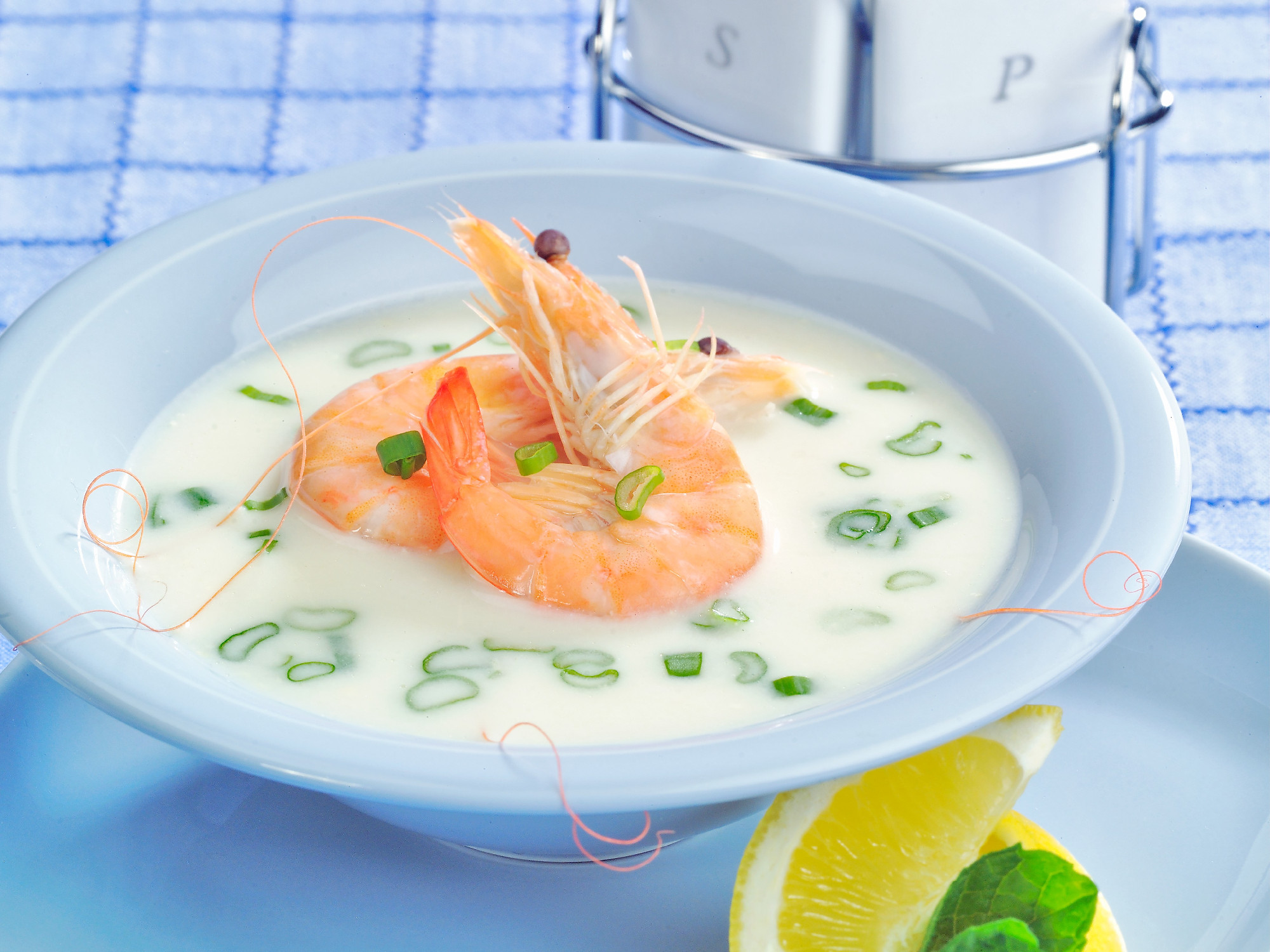 Nem gondolnánk, hogy a krumplileves lehet egy tékozló, ünnepi fogás, ugye? Zellert, burgonyát, zöldhagymát fonnyasztunk kevés vajon, zöldséglében puhára főzzük, majd tojássárgájával és tejszínnel dúsítjuk és habosra turmixoljuk. Őrölt fehérbors, reszelt szerecsendió és pár csepp citromlé adja meg az ízek összhangjának kapcsolódását, és néhány darab főtt garnélával feldobva máris tálalhatjuk elegáns csészékben szervírozva.