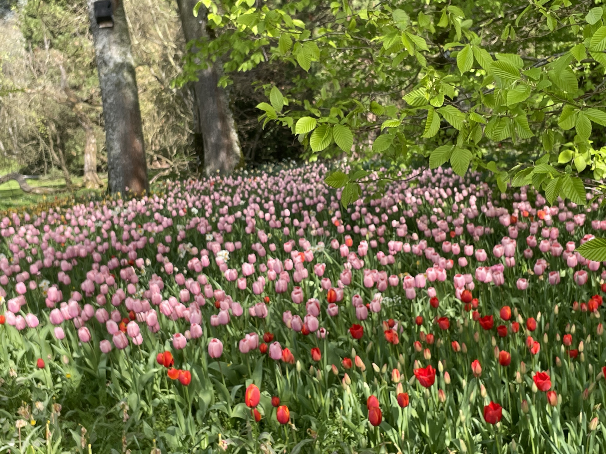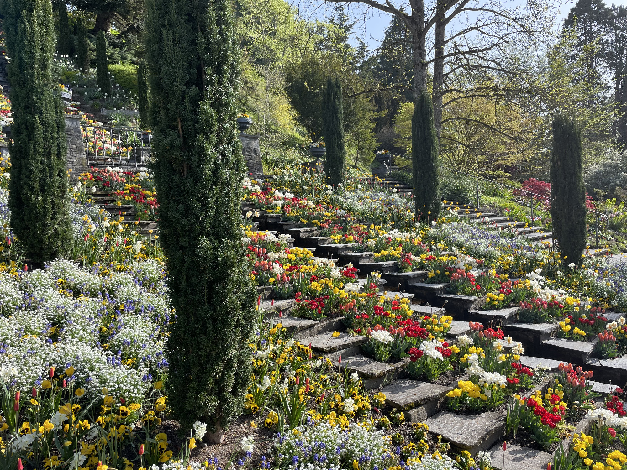 Lassan sétálgassak a kanyargós utak között, ahol előbb a rózsaszín árnyalataiban, odébb lilákban, máshol a sárga ezer olvasatában tobzódnak az ágyások. Messziről egymásba folyó szín-orgia, közelről pedig csodás virágok szépen rendezett egysége. Most a tulipánok, az árvácskák, a nárciszok és a nefelejcsek játszották a főszerepet, de különleges szépségű császárkoronák, sajátos színvilágú kutyatejfélék és színes violák gazdagították.
