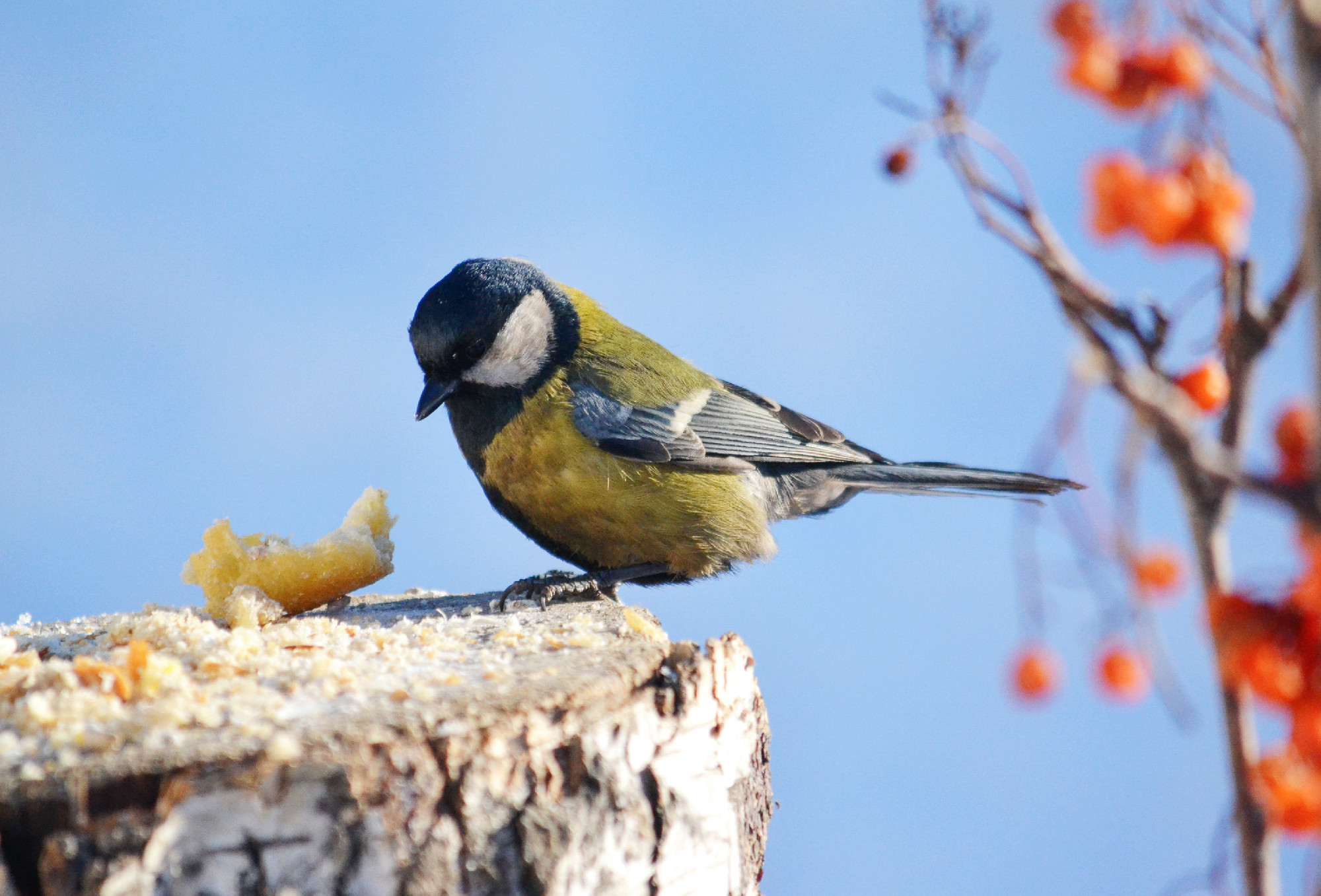 Táplálkozása során több ezer kártevőtől tisztítja meg gyümölcsöseinket. Fiókáit is többnyire kártevőkkel eteti, ezt pedig csigahéjjal egészíti ki, hogy a növekedésükhöz szükséges kalcium a rendelkezésükre álljon. Táplálékszerzéséről az egyik legszebb leírás Brehm tollából származik: „Hol a törzsek kérgét feszegetik, hol a vastagabb ágakon ugrálnak, majd a legvékonyabb ágacskák legvégére szinte felakaszkodnak, hintáznak, ide oda forgolódnak, miközben sokszor fejjel alá csüngenek vagy oldalt lóbálnak s a rügyeket megtisztogatják rovarellenségeiktől. Ha valami keményebb rovarra, bábra vagy héjas magra akadtak, vastagabb ágra szállnak vele, lábaikkal s karmocskáikkal leszorítják és erős, biztos csőrvágásokkal addig kopácsolják, míg az ehető rész kiválik.”- írja.