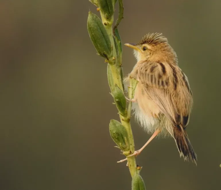 A felülről sárgás-vörhenyes, alulról halvány agyagsárgás színű madár fején jól látszott a sűrű csíkozás.