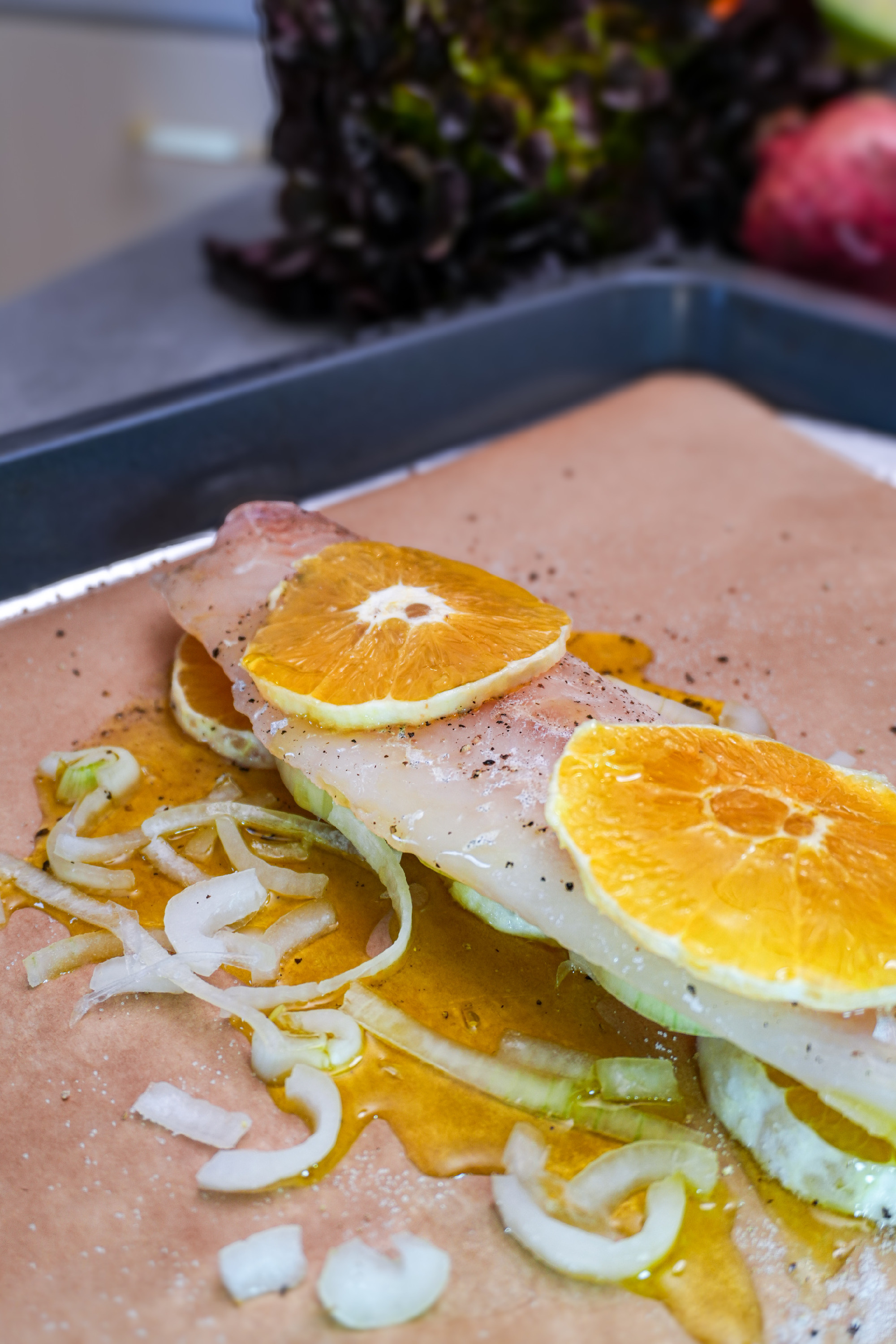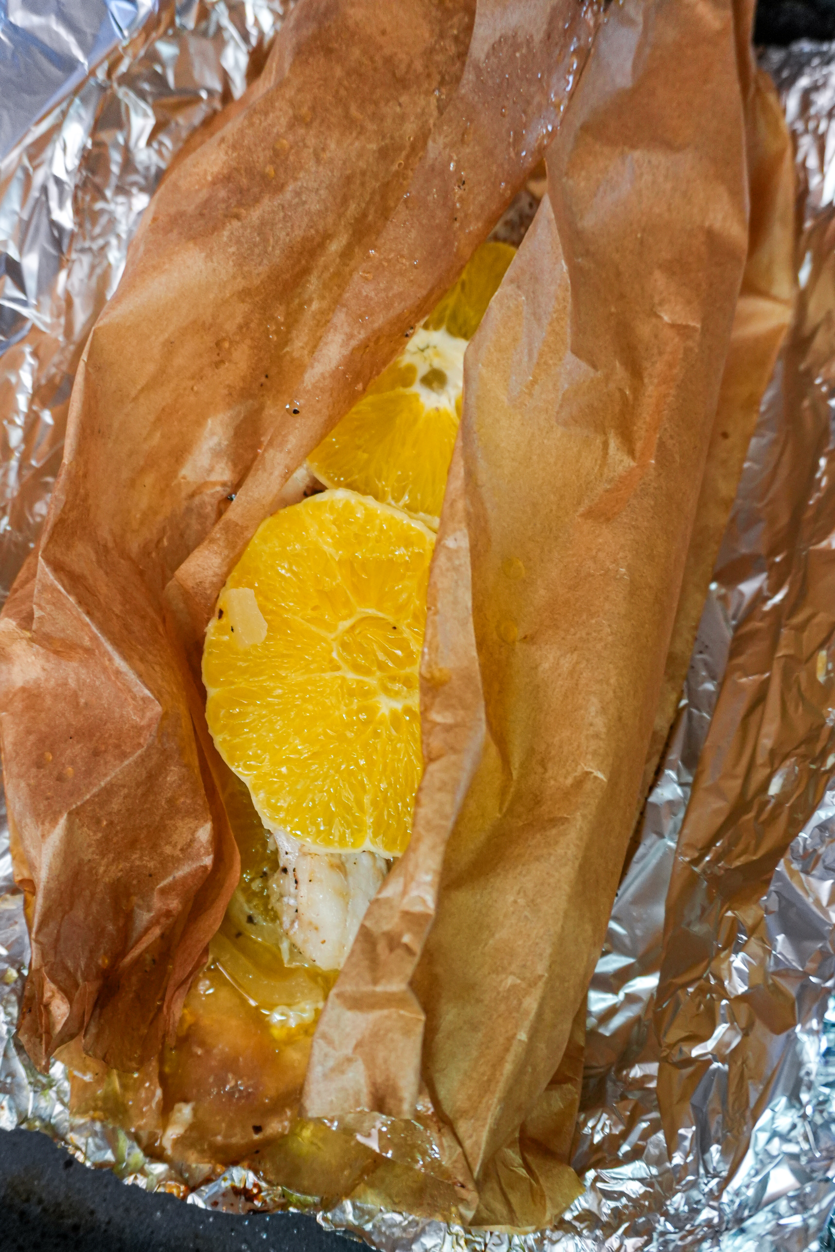 Egy nagyobb darab sütőpapírt és alufóliát egymásra terítünk (alul a fólia, felül a sütőpapír). A papírra először pár narancskarika és néhány hagymaszelet kerül, erre fektetjük a halfilét. A tetejét meglocsoljuk az olívaolajjal, sózzuk, borsozzuk, majd a tetejére is teszünk hagymát, illetve narancsot.
