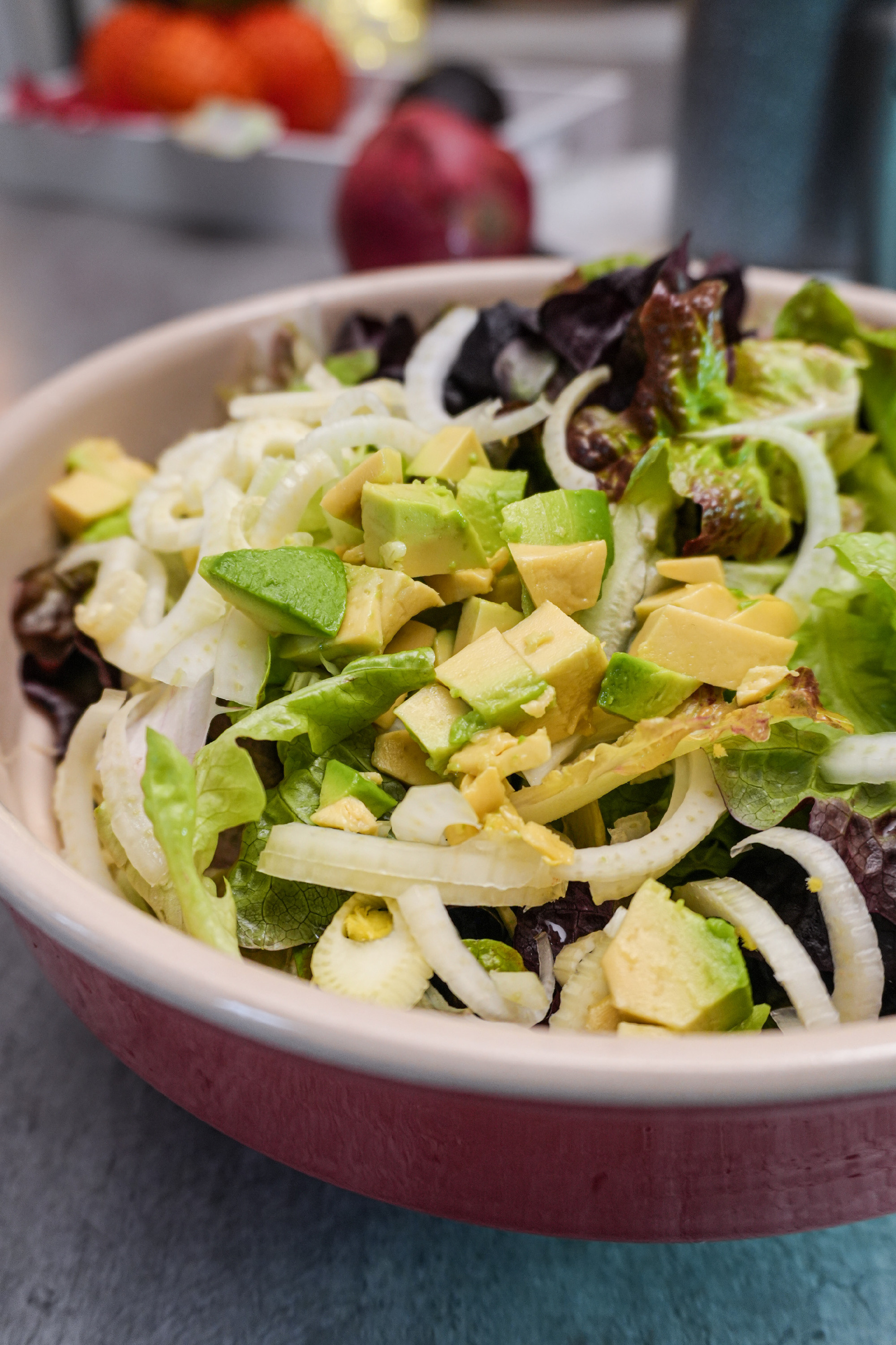 Az öntethez simára kikeverjük a mustárt, a mézet, az almaecetet, a sót, majd hozzáadjuk az olívaolajat, azzal is elkeverjük. Egy nagy tálba beletépkedjük a salátaleveleket, hozzáadjuk a vékonyra szeletelt édesköménygumót, illetve a hagymát és a felkockázott avokádót.