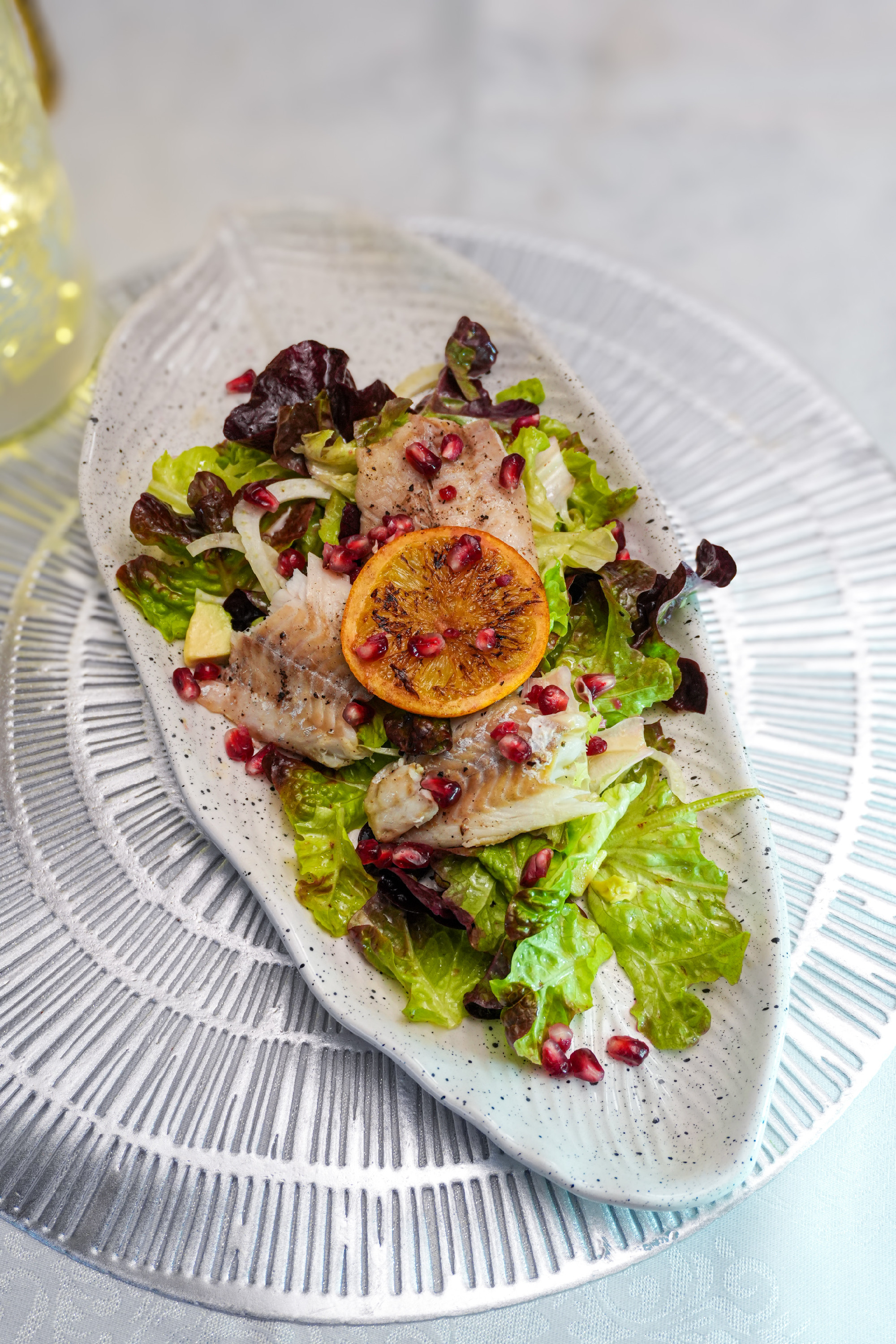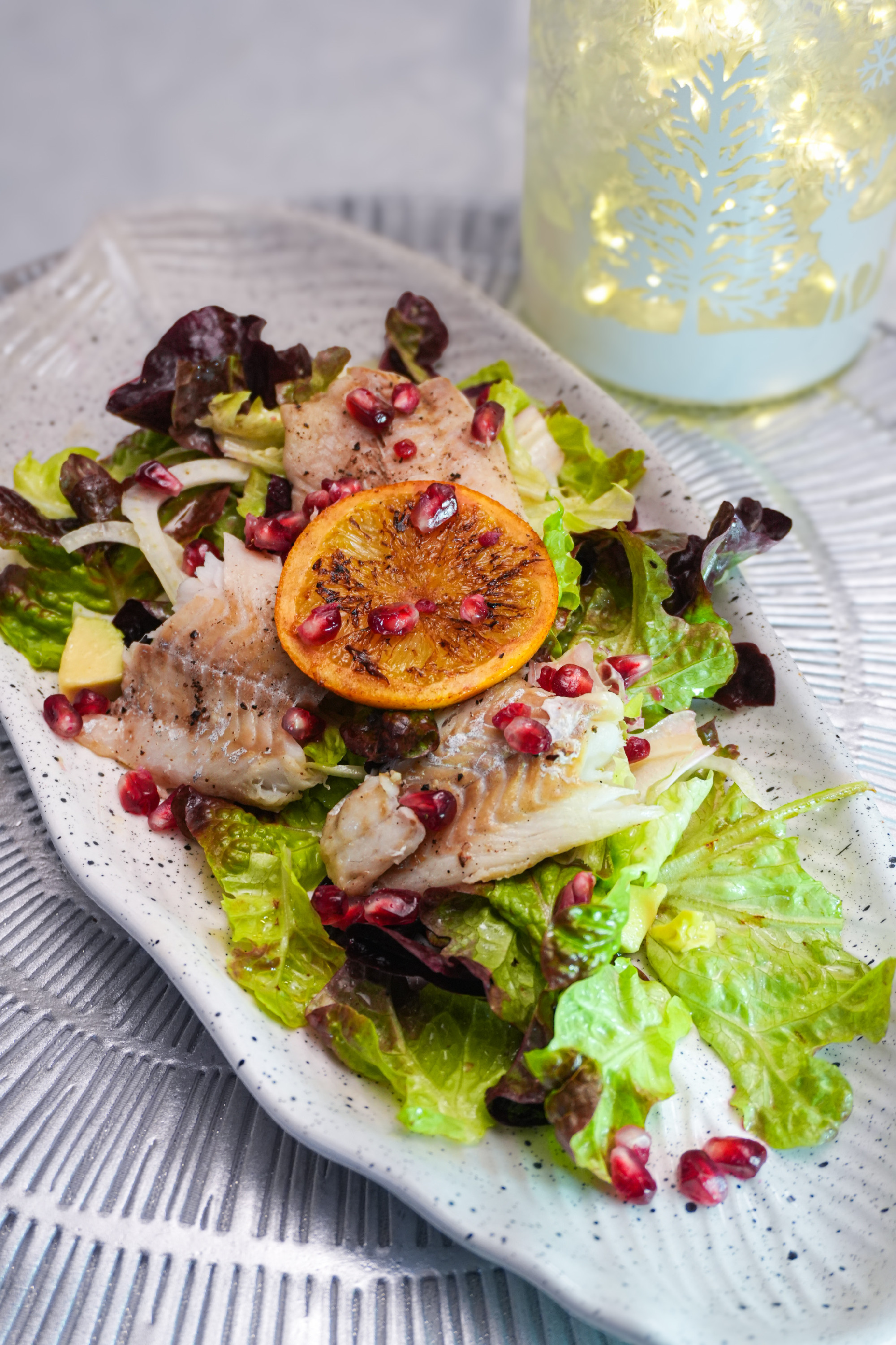Közvetlenül tálalás előtt az öntetet a salátával összeforgatjuk. Ezzel tálaljuk a halat, és a végén még a gránátalmamagokat is rászórjuk az ételre.