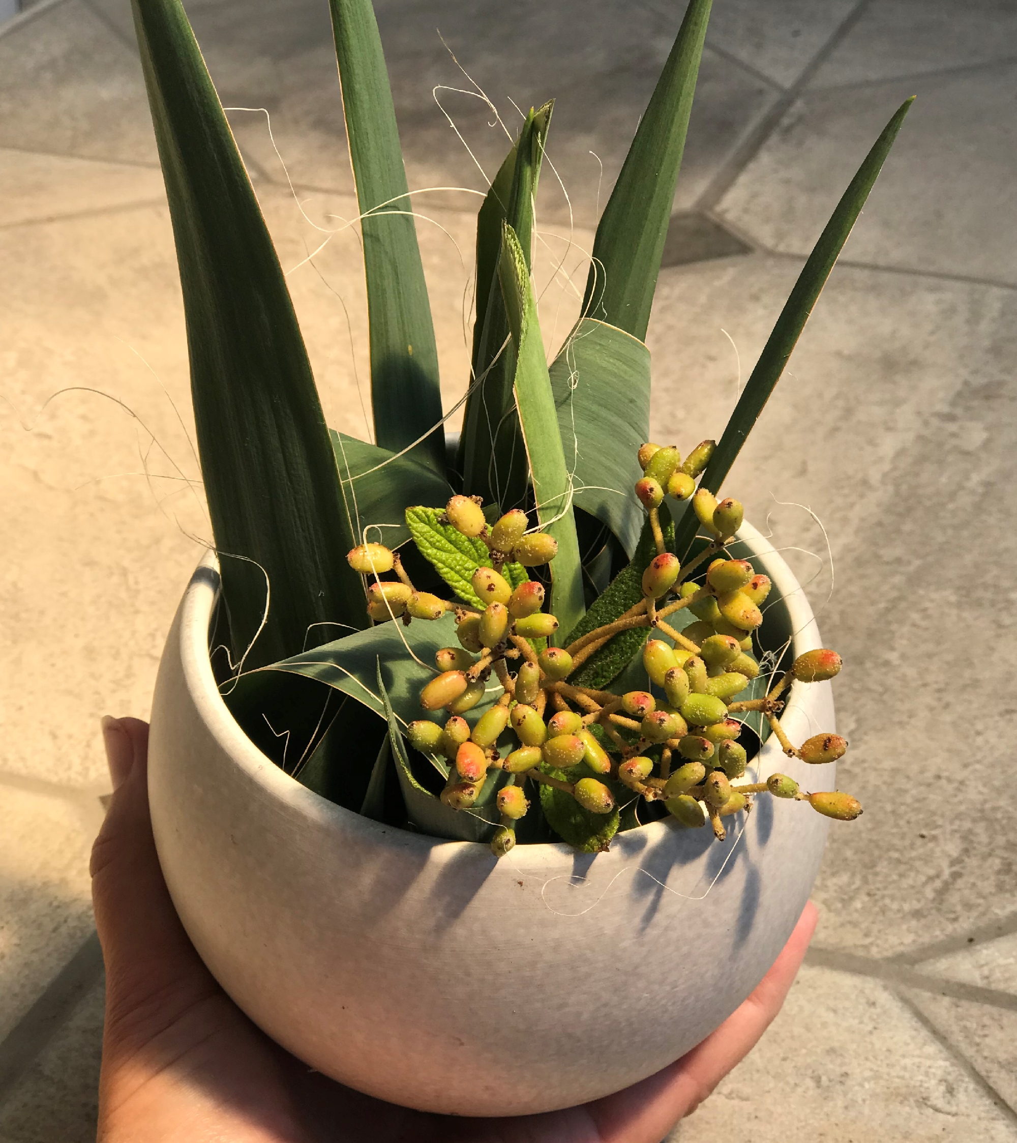 A zöld árnyalatok együtt mindig erős hatást váltanak ki. A kerti yukka erős levelei egyenként csomóra kötve, egy félgömb-formájú kaspóba rakosgatva szépen megállnak. Éretlen, zöld, kerti termésekkel adhatunk nyomatékot a kompozíciónak, ami egy modern környezetben remekül mutat, és igen tartós.