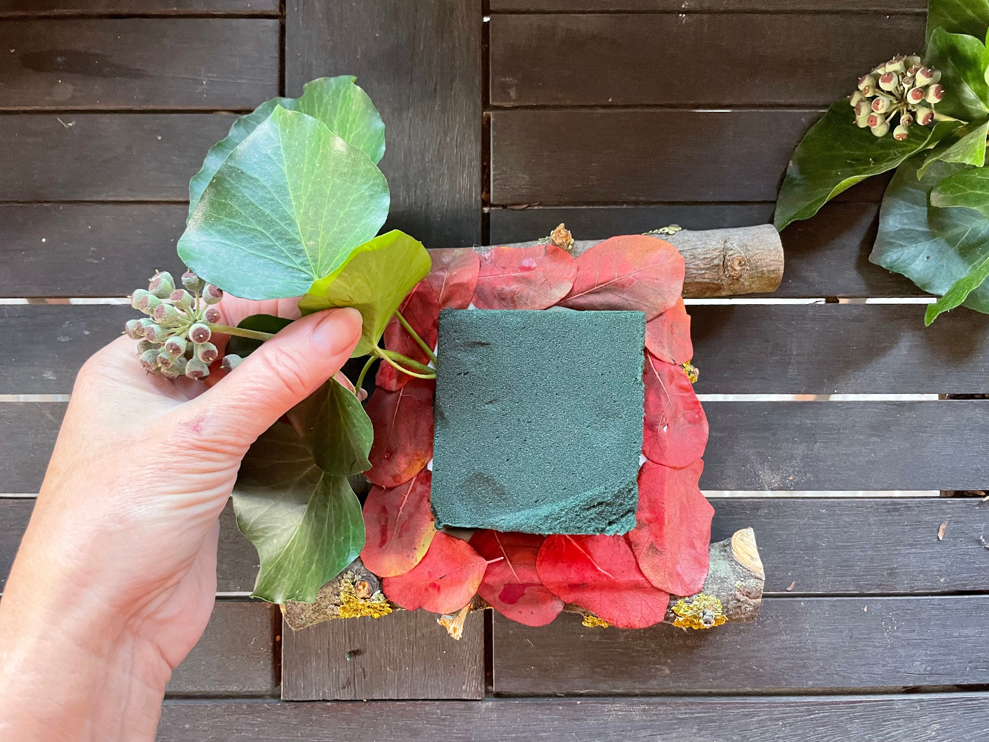 Ezzel ez előkészület végére ért, és következik a munka izgalmas része: az alkotás! A növényi részek szárait vágd hegyesre, hogy minél jobban bele tudd szúrni a tűzőhabba. Az ágakat, vesszőket egy-egy U alakban meghajlított dróttal tudod odarögzíteni.