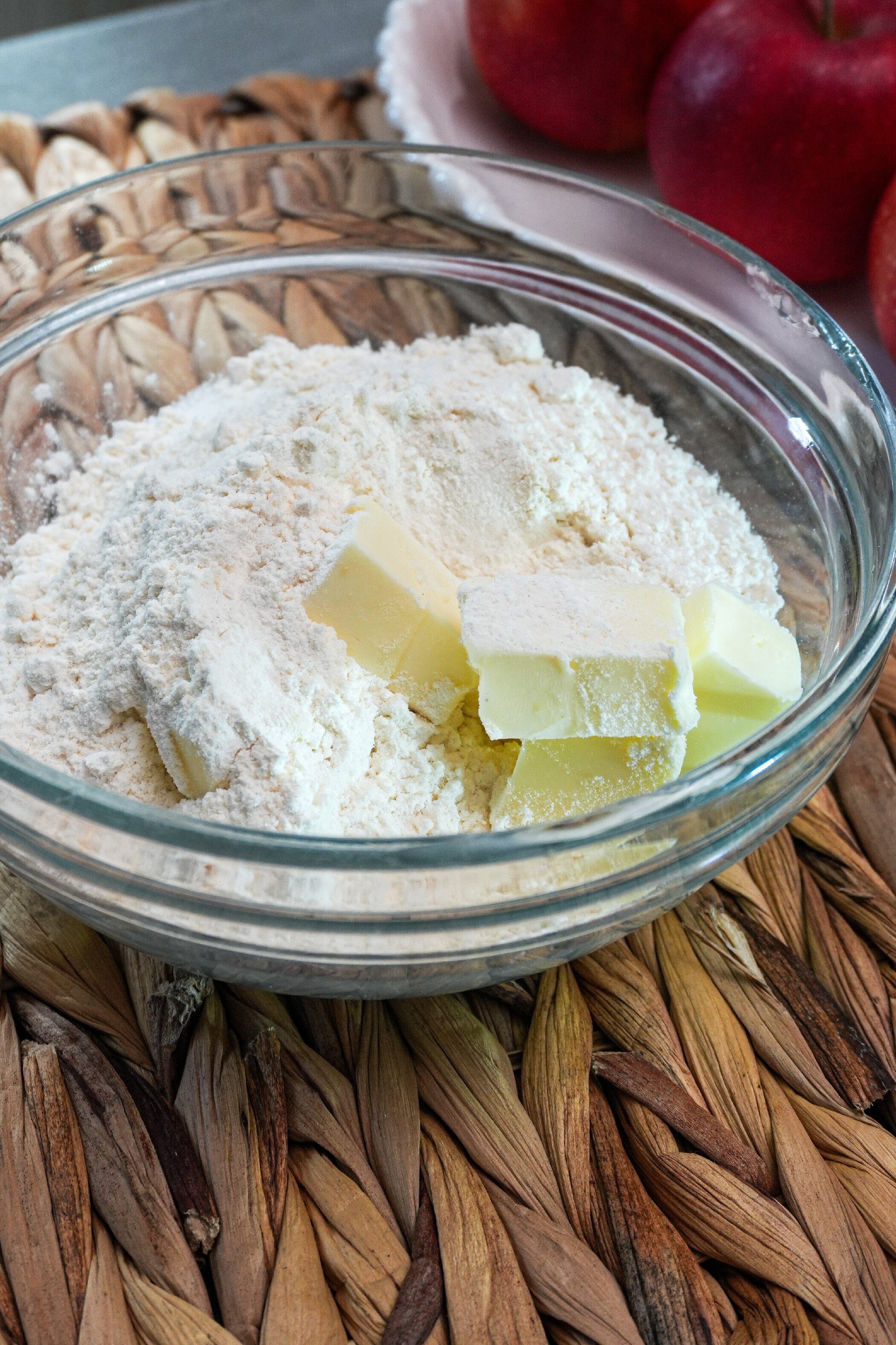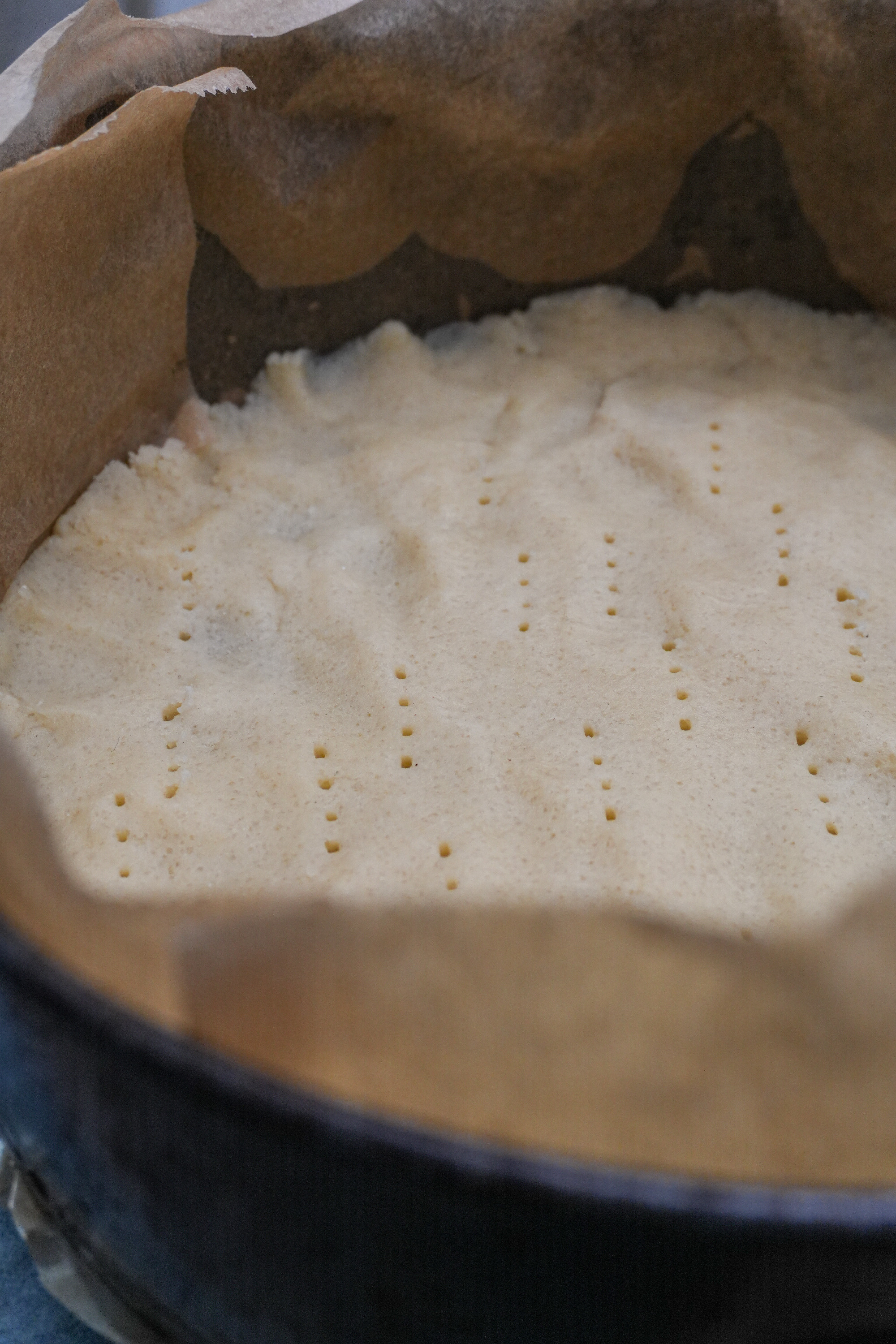 A tésztához eldörzsöljük a hideg, felkockázott vajat a sütőporral elkevert liszttel és a cukorral. Az egyharmadát becsomagoljuk, és a hűtőbe rakjuk. A nagyobb részét egy sütőpapírral bélelt 22 cm-es tortaforma aljába nyomkodjuk, villával megszurkáljuk, majd ezt is hűtőbe rakjuk.