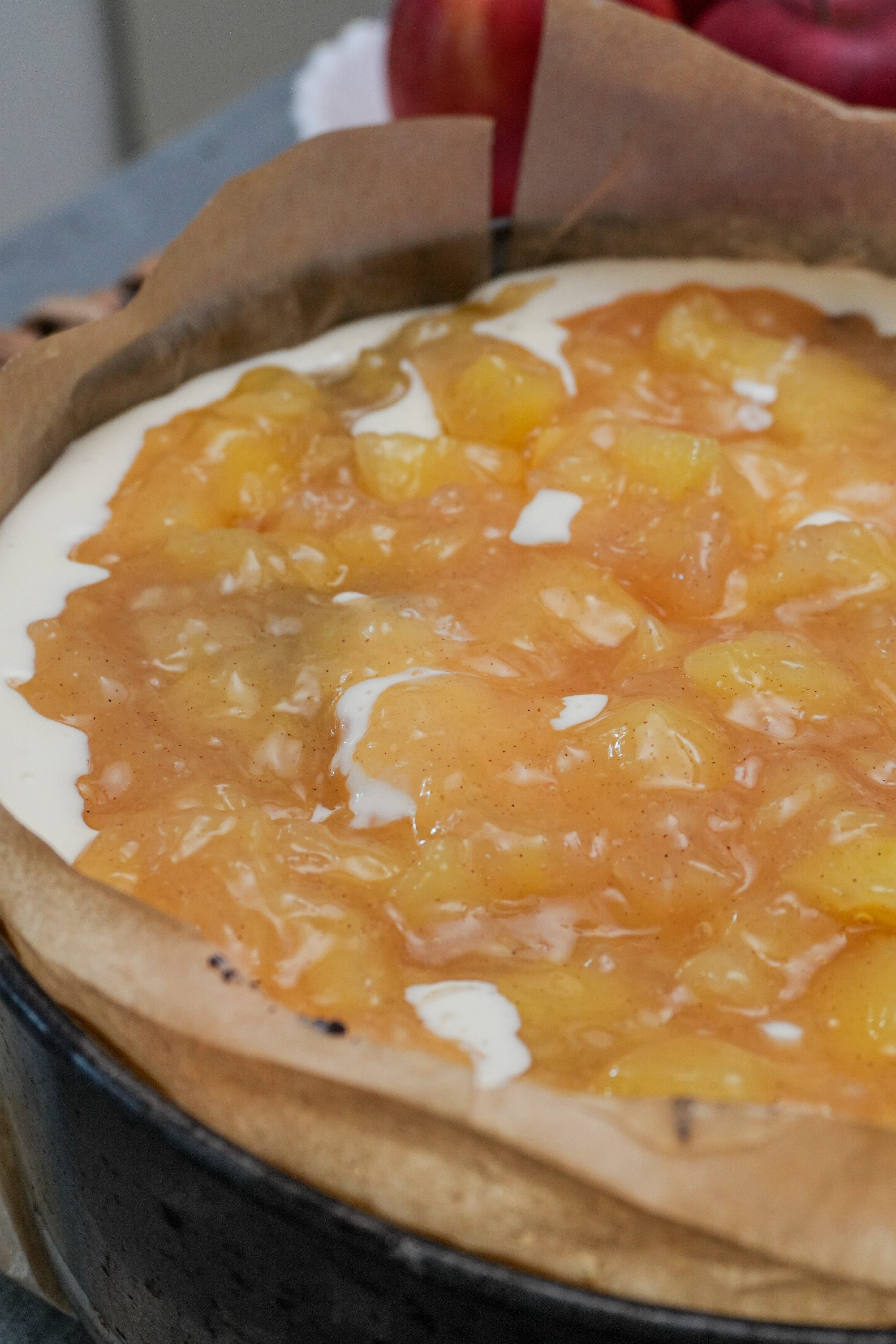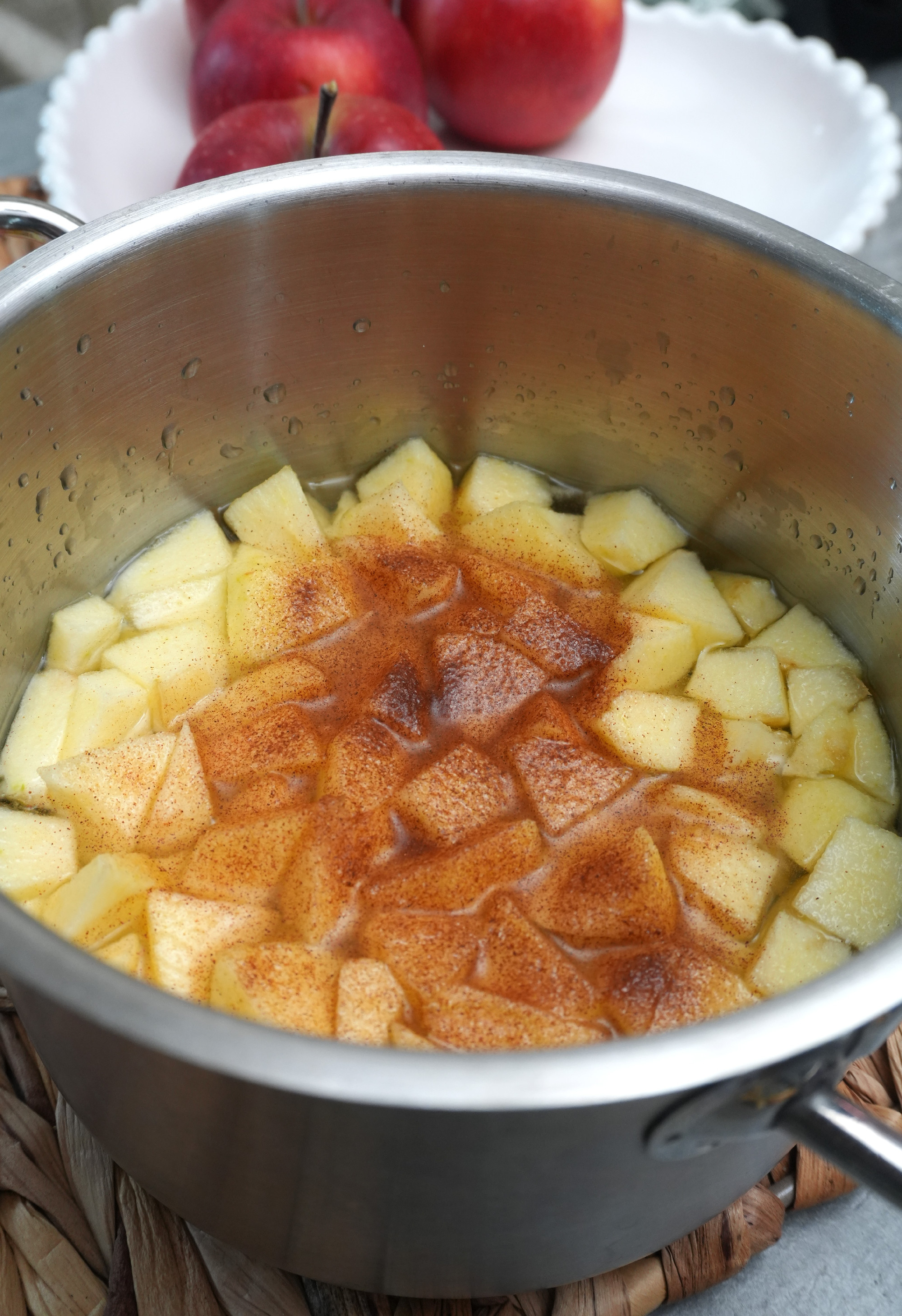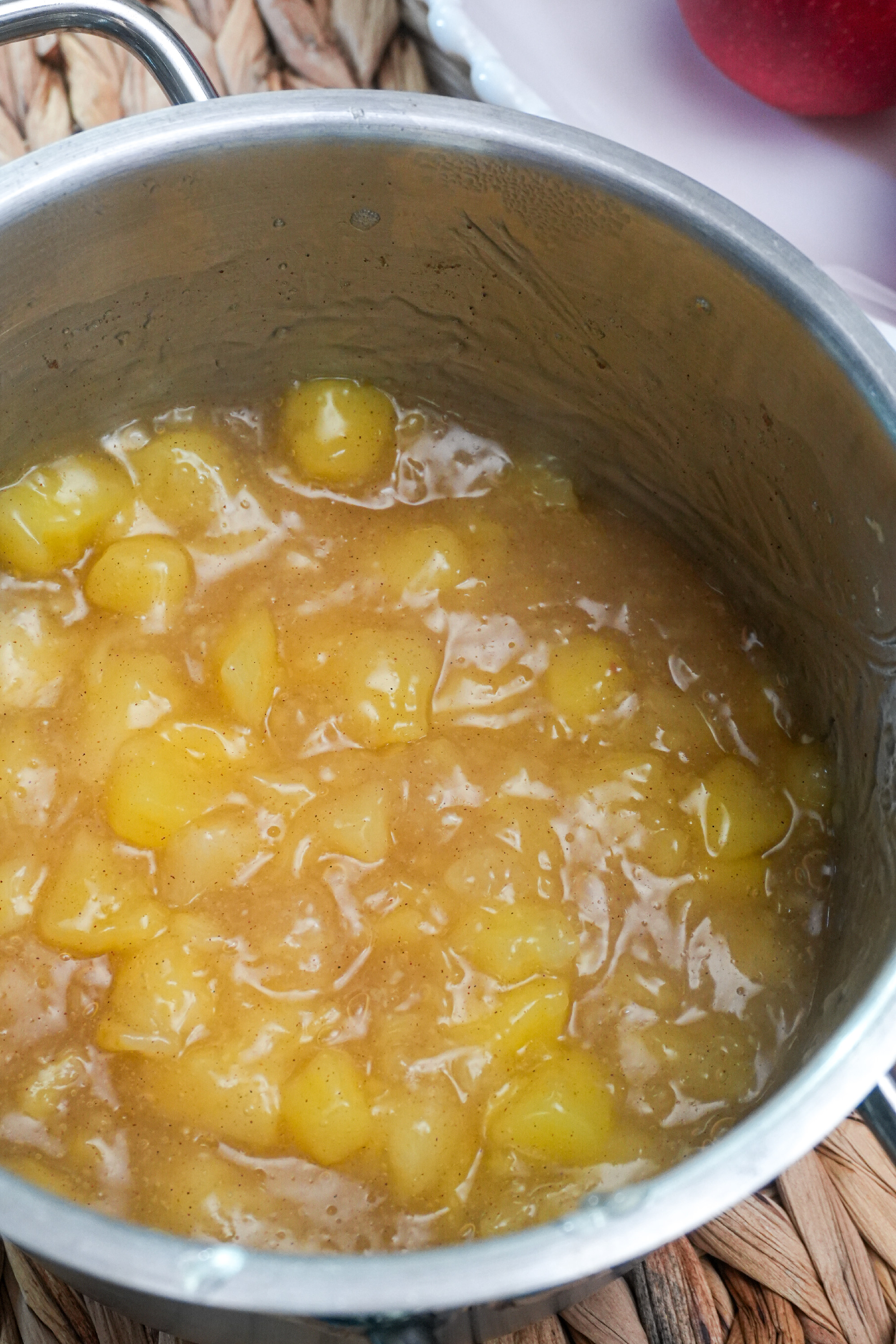 Az almákat meghámozzuk, majd kockára vágjuk, és feltesszük főni az almalében. Ízesítjük a fűszerkeverékkel és egy kanál vaníliás cukorral. Ha egyet forrt, kiszedünk a léből két merőkanállal, és kikeverjük a keményítővel. Ezután visszaöntjük az edénybe, gyorsan elkeverjük, és egyet forralunk rajta. Ha besűrűsödött, máris lehúzzuk a tűzről, és hagyjuk hűlni.