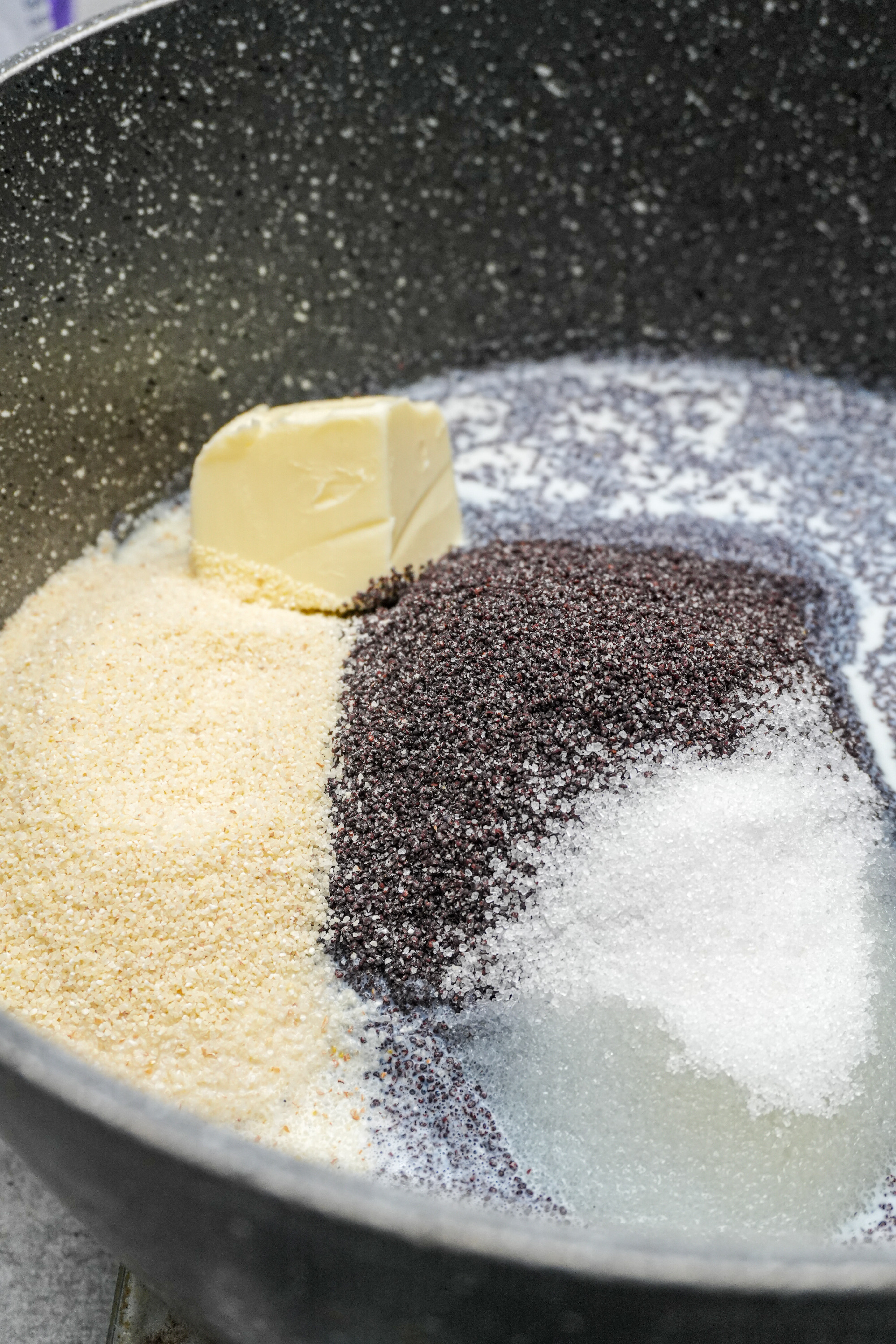 A mákos krémhez a tejet elkeverjük a cukorral és a búzadarával, hozzáadjuk a mákot és a vajat, majd feltesszük főni. Ha a búzadara megfőtt, és a krém besűrűsödött, lehúzzuk a tűzről, és hagyjuk hűlni. Ha már csak langyos, belekeverjük a tojást is.