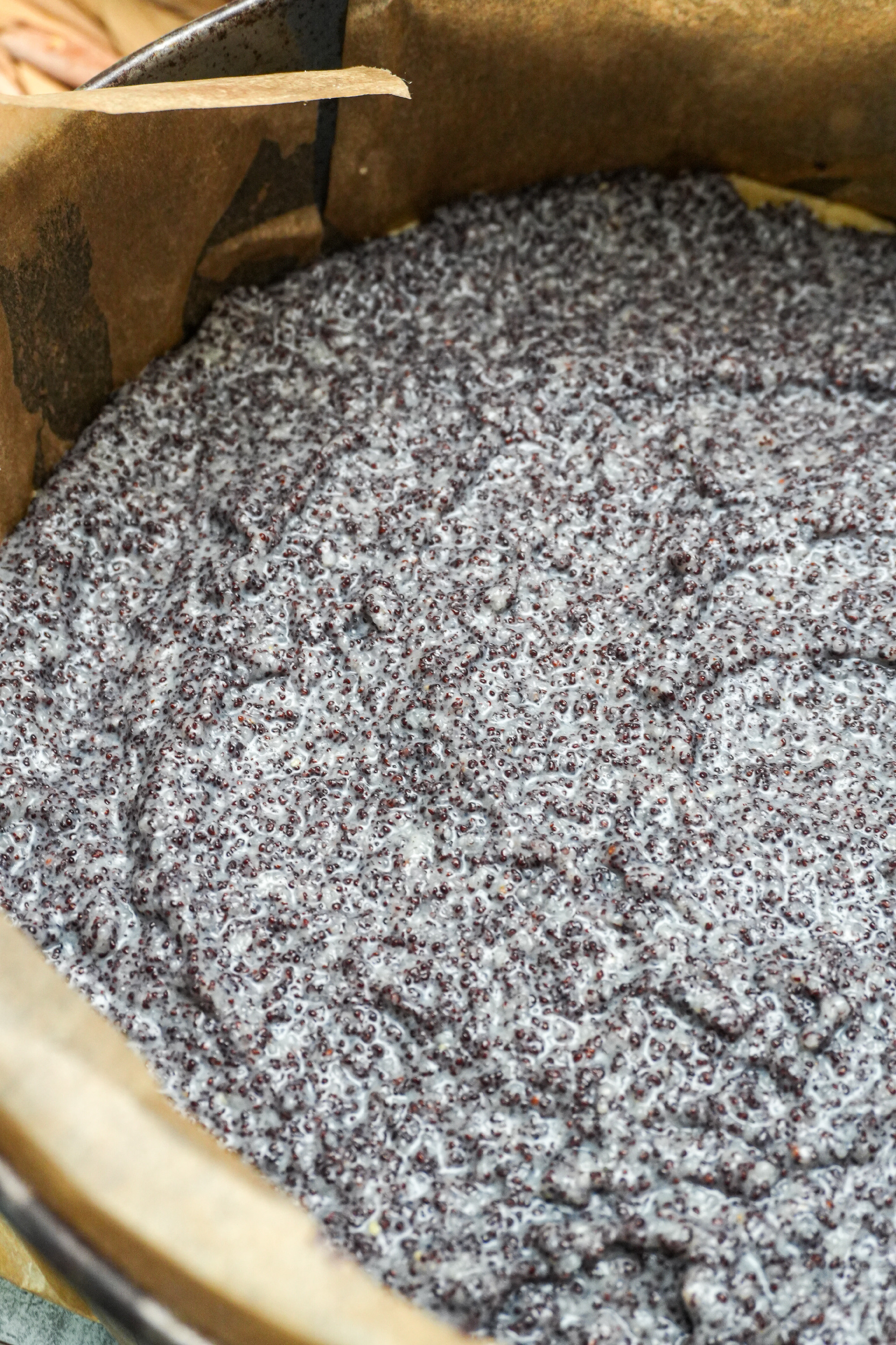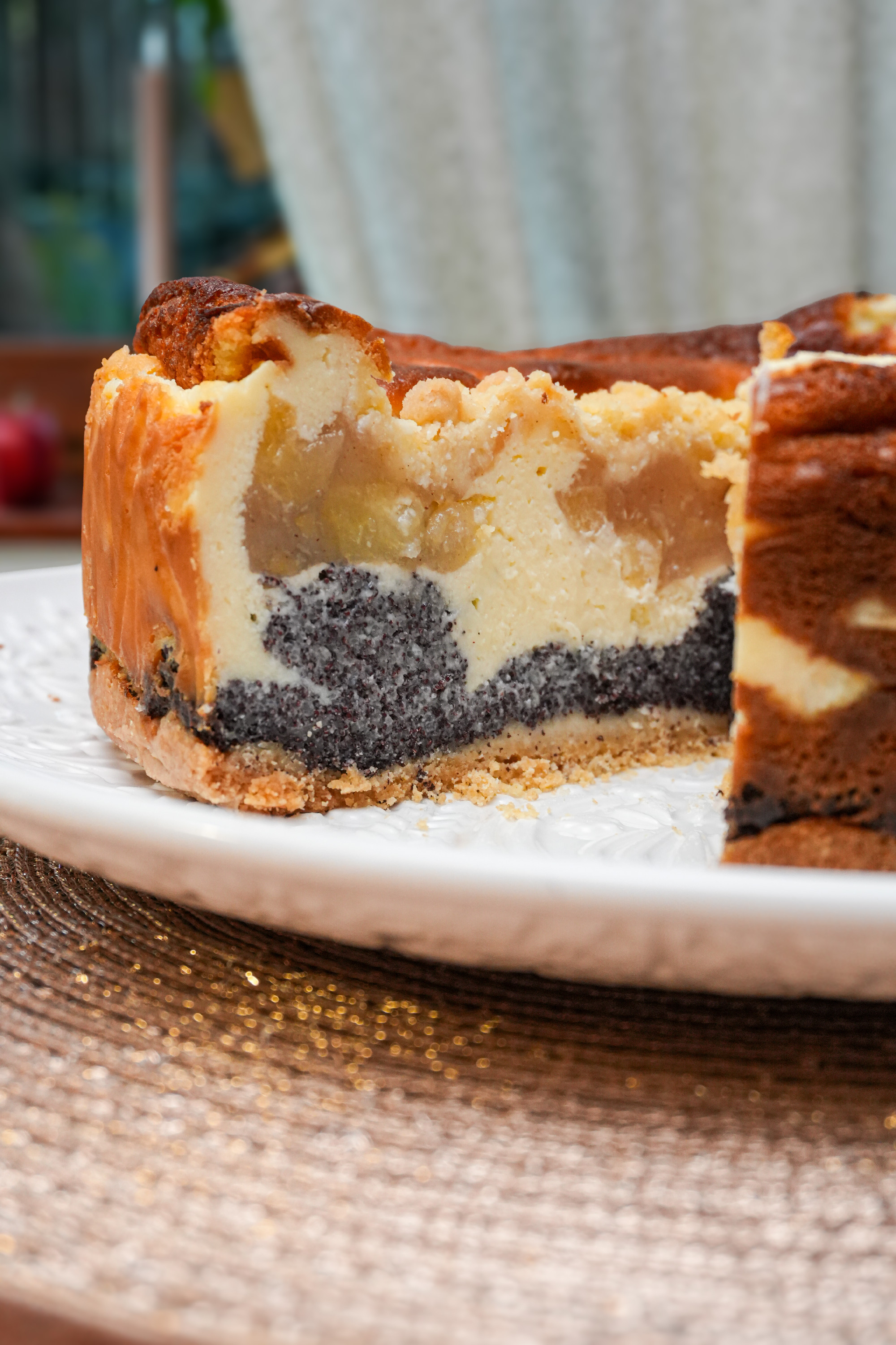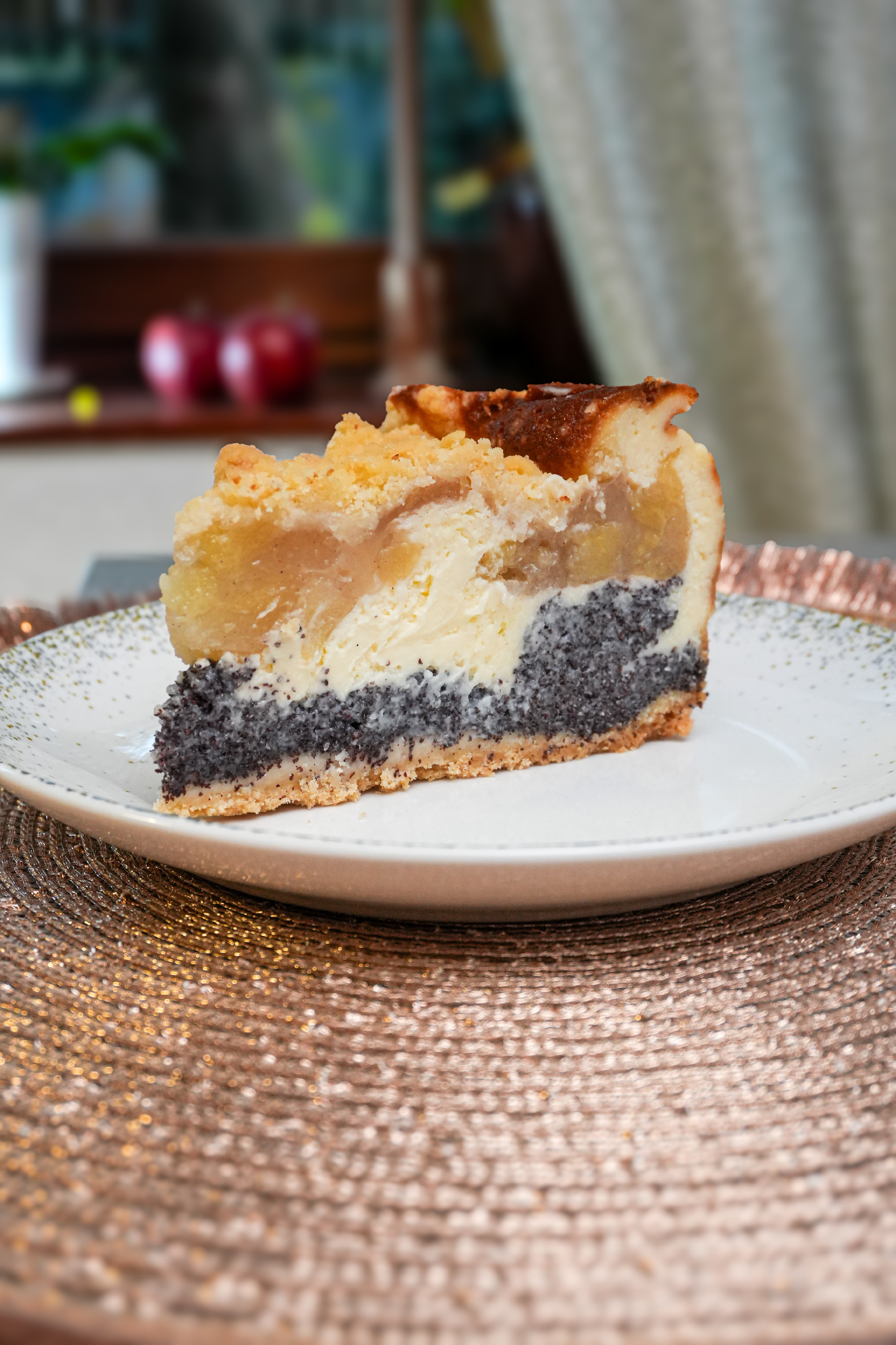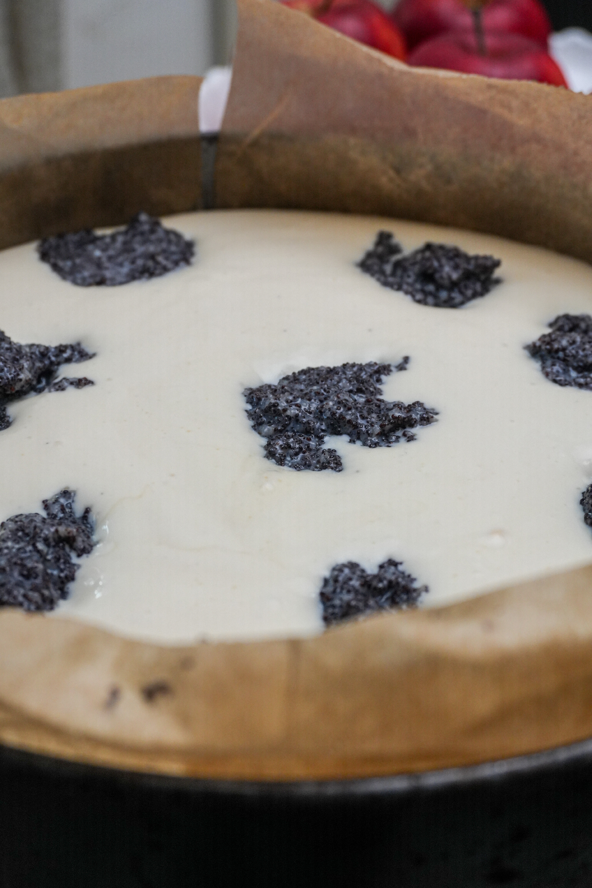 Az alsó tésztára öntjük a kihűlt mákos krém háromnegyedét. erre jön a fehér krém, majd a maradék mákos krémet rápötyögtetjük. A tetejére kerül az almapuding, majd pedig ráreszeljük a maradék, külön elrakott tésztát.