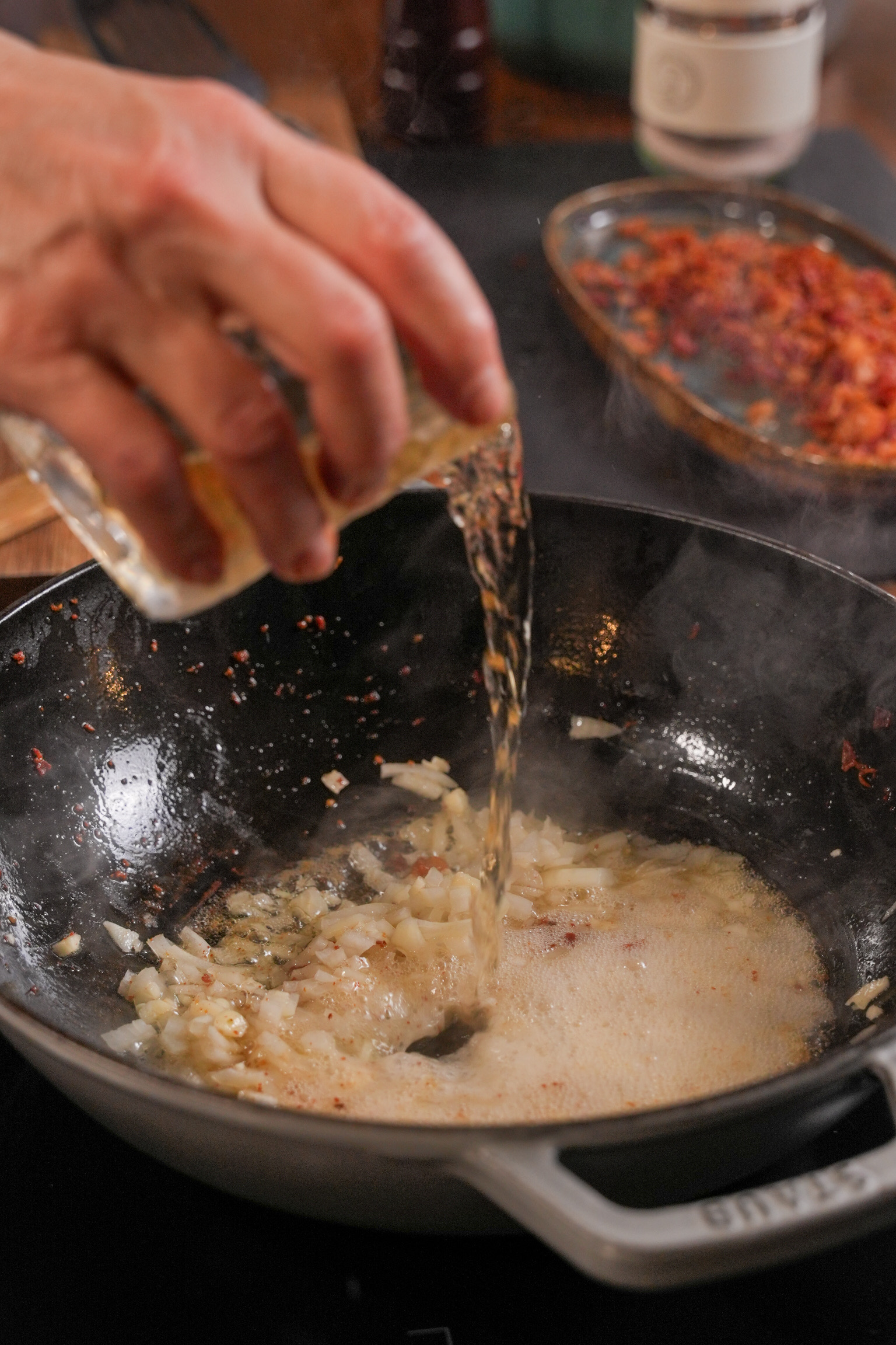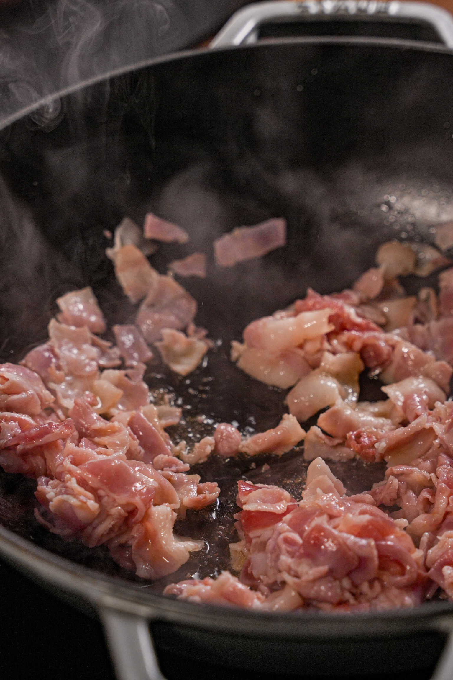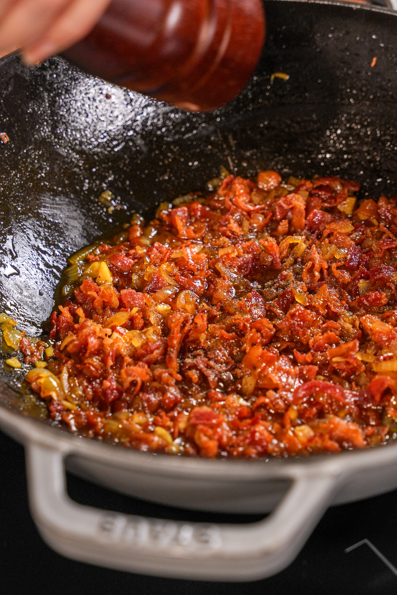 A bacont kisebb darabokra vágjuk, majd forró vasserpenyőben elkezdjük pirítani. Ha szükséges, teszünk alá kevés mangalicazsírt. Ha szépen megpirult, kiszedjük a serpenyőből. A hagymát kockára vágjuk, majd a visszamaradt zsiradékra dobjuk. Fűszerezzük kurkumával és ízlés szerint chilivel. Átkeverjük, hozzáadjuk a fokhagymát, majd felöntjük a ciderrel. Ez feloldja a serpenyő alján maradt pörzsanyagokat. Ha a hagyma megpuhult, visszarakjuk a serpenyőbe a bacont is. Rövid ideig még pirítjuk az egészet. Sózzuk, borsozzuk, beállítjuk az ízeket. Fontos, hogy egyszerre legyen sós, édes, kicsit savanykás.