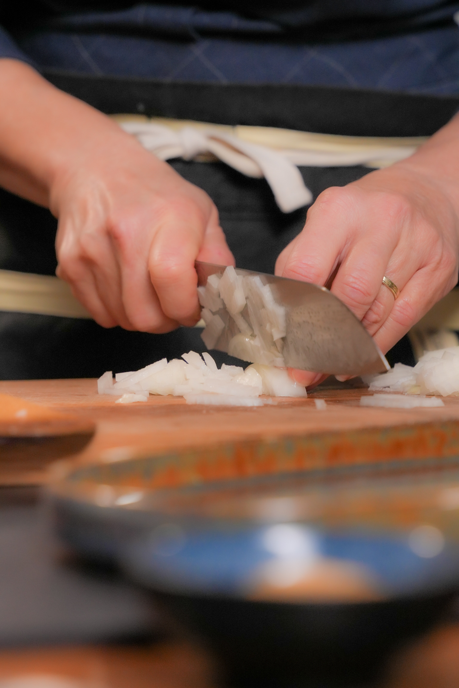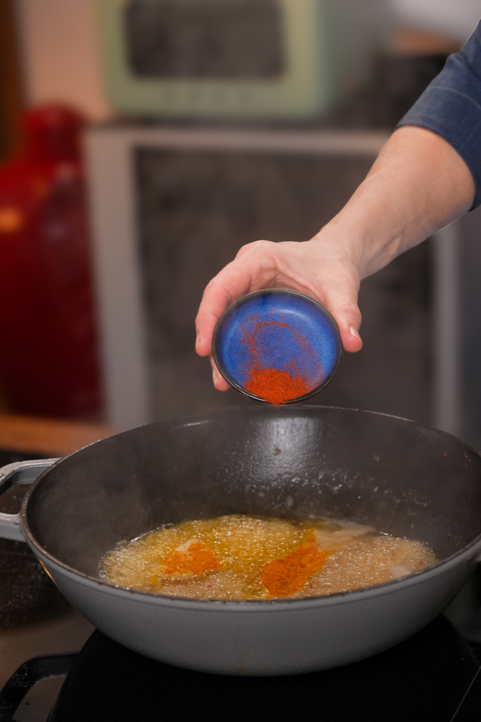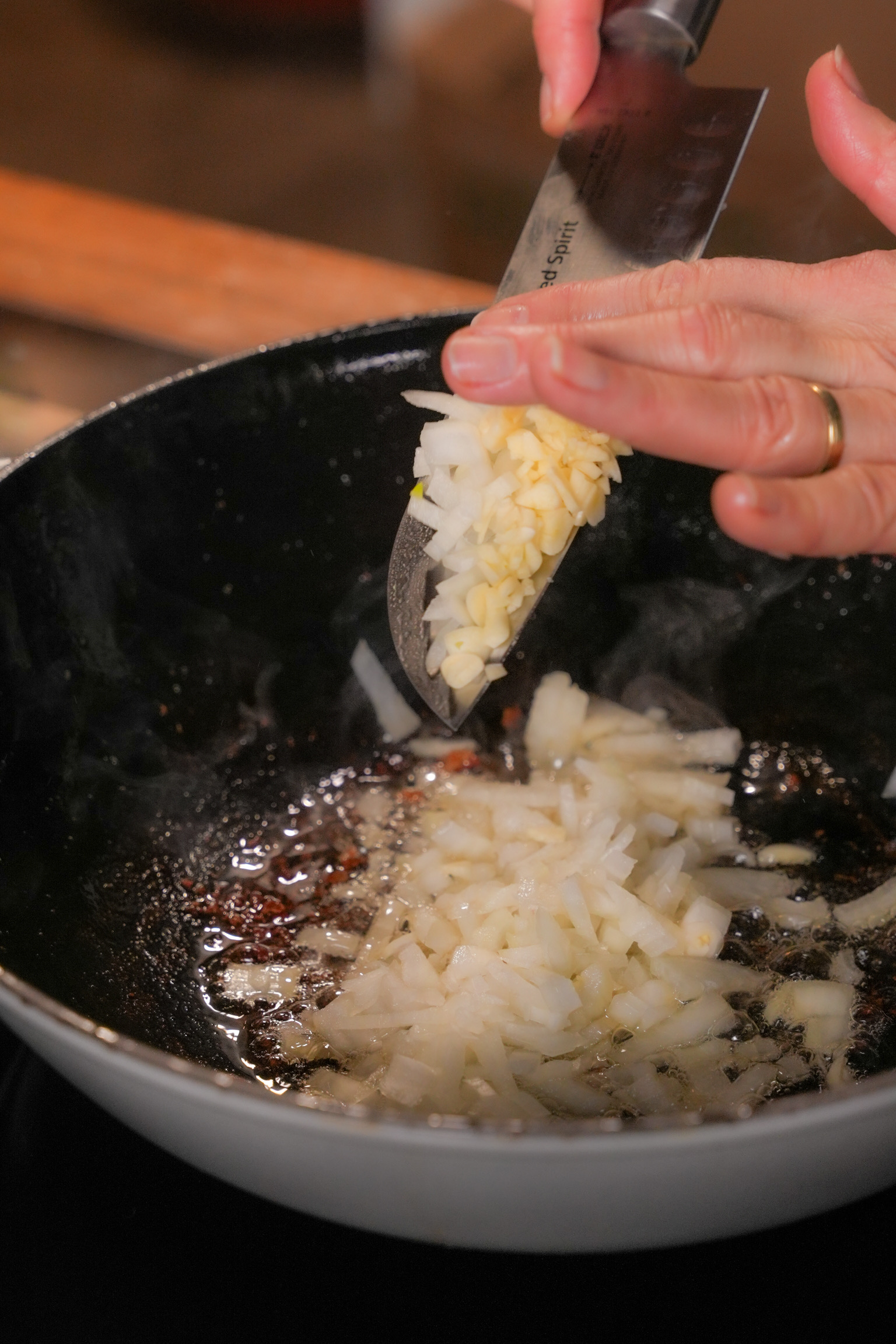 A bacont kisebb darabokra vágjuk, majd forró vasserpenyőben elkezdjük pirítani. Ha szükséges, teszünk alá kevés mangalicazsírt. Ha szépen megpirult, kiszedjük a serpenyőből. A hagymát kockára vágjuk, majd a visszamaradt zsiradékra dobjuk. Fűszerezzük kurkumával és ízlés szerint chilivel. Átkeverjük, hozzáadjuk a fokhagymát, majd felöntjük a ciderrel. Ez feloldja a serpenyő alján maradt pörzsanyagokat. Ha a hagyma megpuhult, visszarakjuk a serpenyőbe a bacont is. Rövid ideig még pirítjuk az egészet. Sózzuk, borsozzuk, beállítjuk az ízeket. Fontos, hogy egyszerre legyen sós, édes, kicsit savanykás.