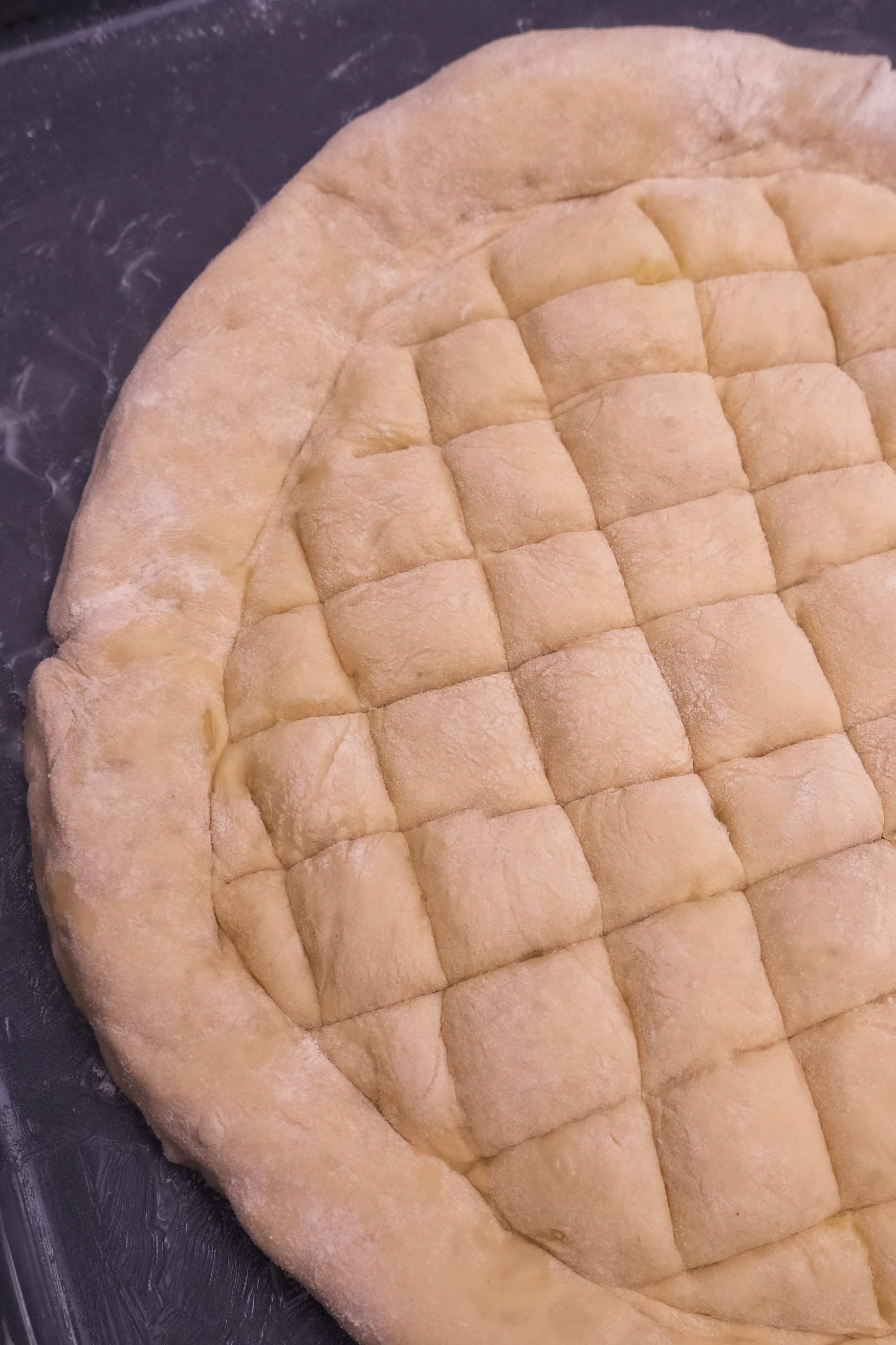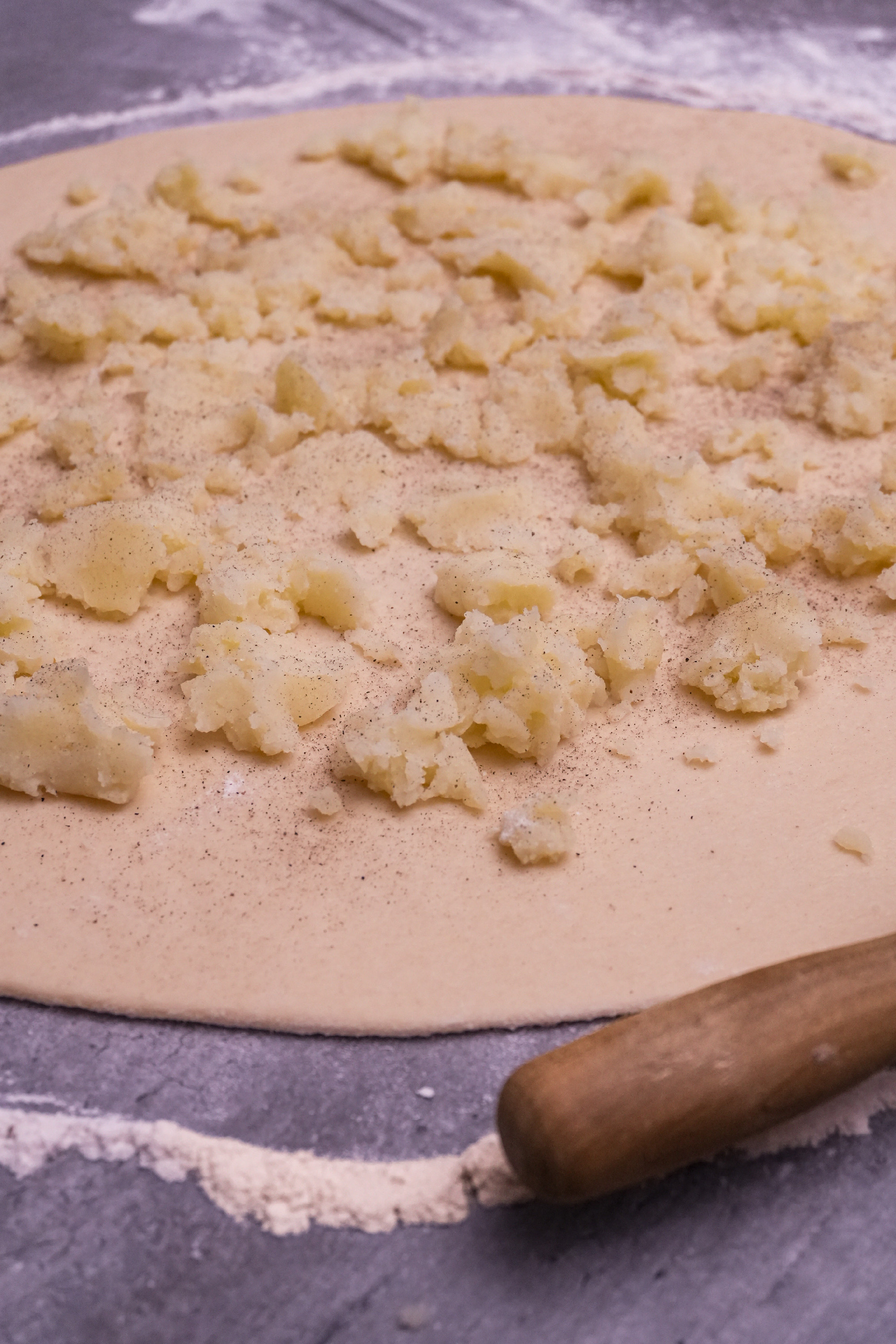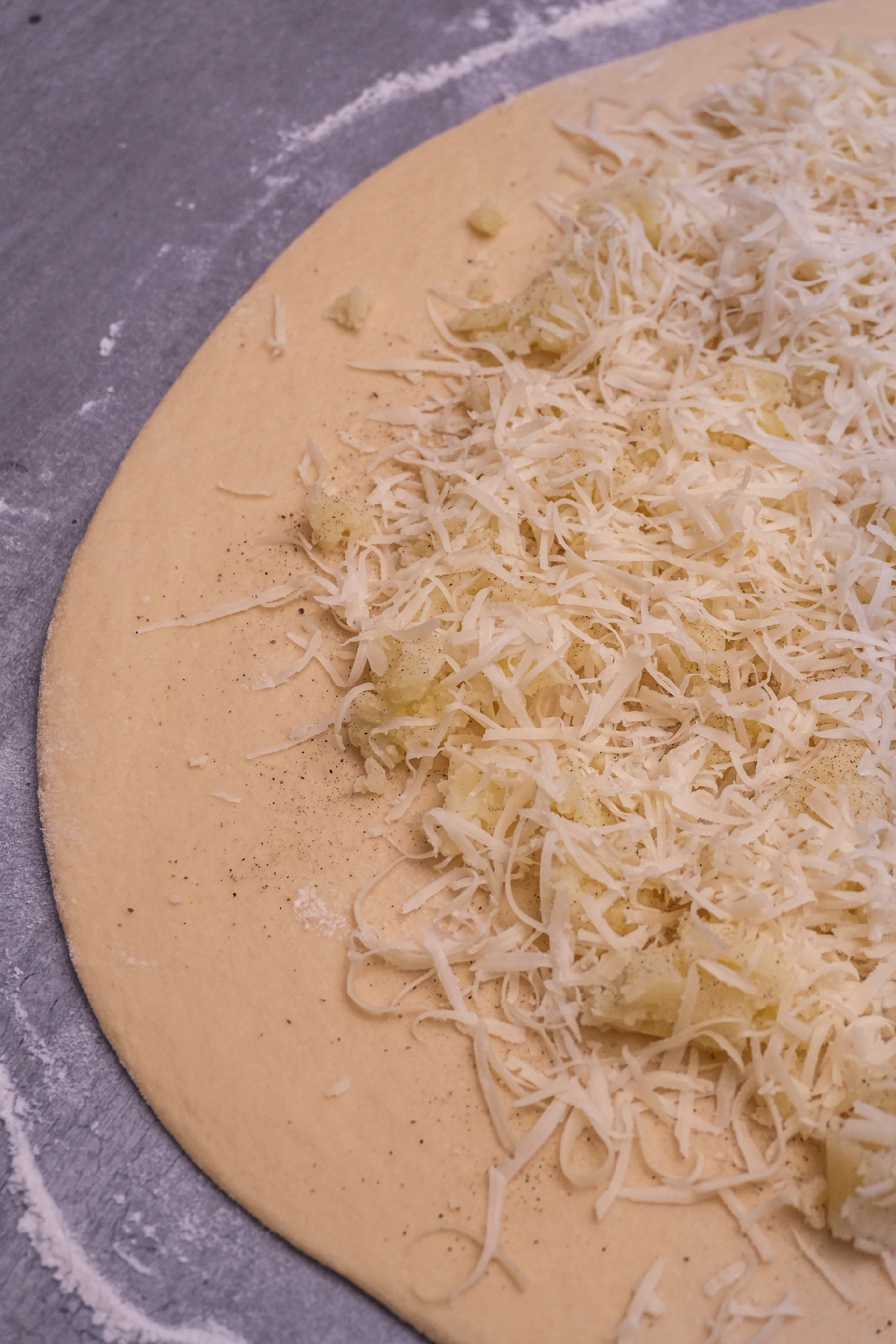 A megkelt tésztát lisztezett felületen nem túl vékonyra nyújtjuk. Egyenletesen elosztjuk rajta a krumplis tölteléket, megszórjuk a reszelt sajttal, majd körben felhajtogatjuk, teljesen befedve a tölteléket. Ezután megszórjuk liszttel, majd megfordítjuk. A tetejét is vékonyan lisztezzük, majd tepsi méretűre nyújtjuk, és óvatosan át is emeljük a zsírral kikent vagy sütőpapírral bélelt tepsire. Ezután jöhet a csinosítás. A tenyerünk élével körben peremet készítünk neki. Ezután egy kisebb fakanállal vagy spatulával óvatosan, keresztben megmintázzuk.